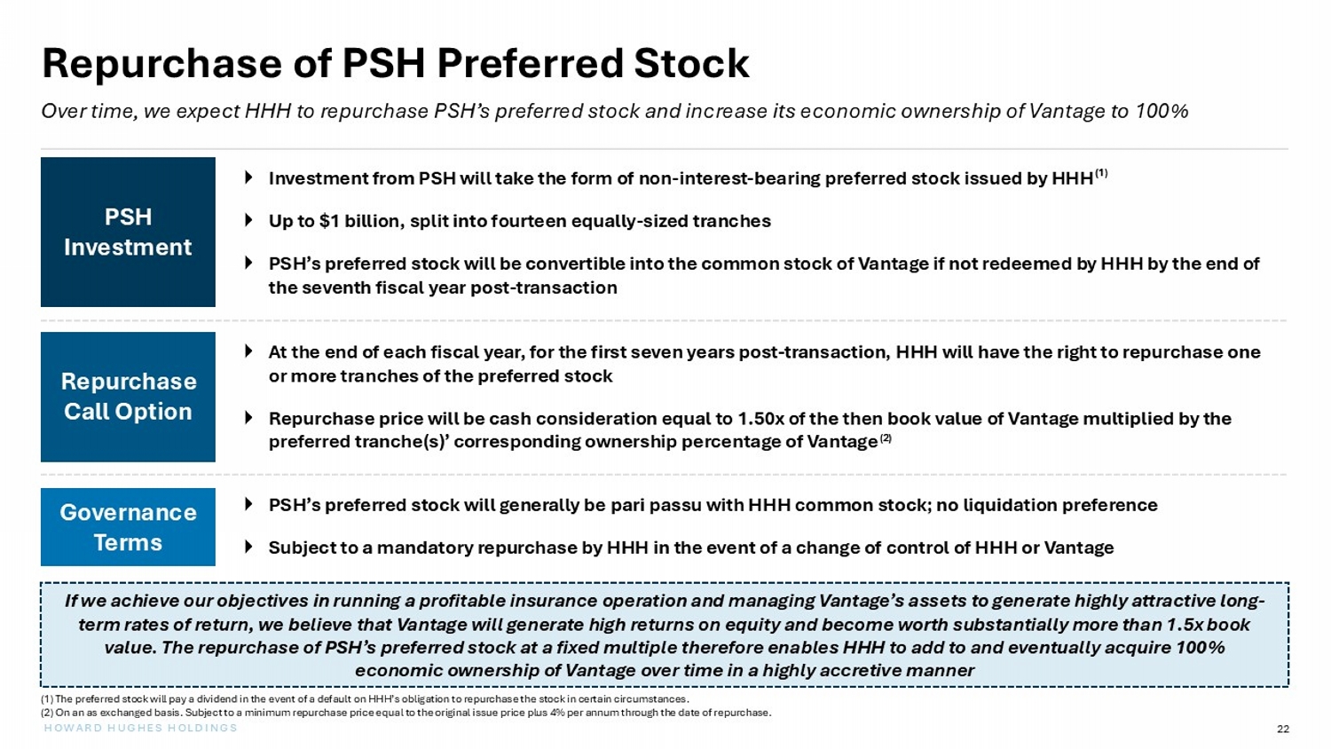 21 HOWARD HUGHES HOLDINGS Significant Long - Term Valuation Upside Sustainably achieving a high - teens ROE would warrant a materially higher valuation than the ~1.4x P / TBV transaction multiple Illustrative Valuation Upside P / TBV Multiple The opportunity for HHH to invest additional primary capital at 1.0x book value to de - lever Vantage’s balance sheet allows for a further reduction in the all - in purchase multiple to below 1.4x (1) Estimated purchase P / BV multiple at transaction close. (2) Median P / TBV multiple for selected specialty P&C (re)insurers highlighted on prior page. Source: Public filings, Capital IQ co nsensus estimates. Market data as of December 11, 2025. ( 1 ) ( 2 ) ~ 1.4 x > 2 x Vantage Effective Purchase Multiple Median Specialty P&C Peers Earning High-Teen ROEs