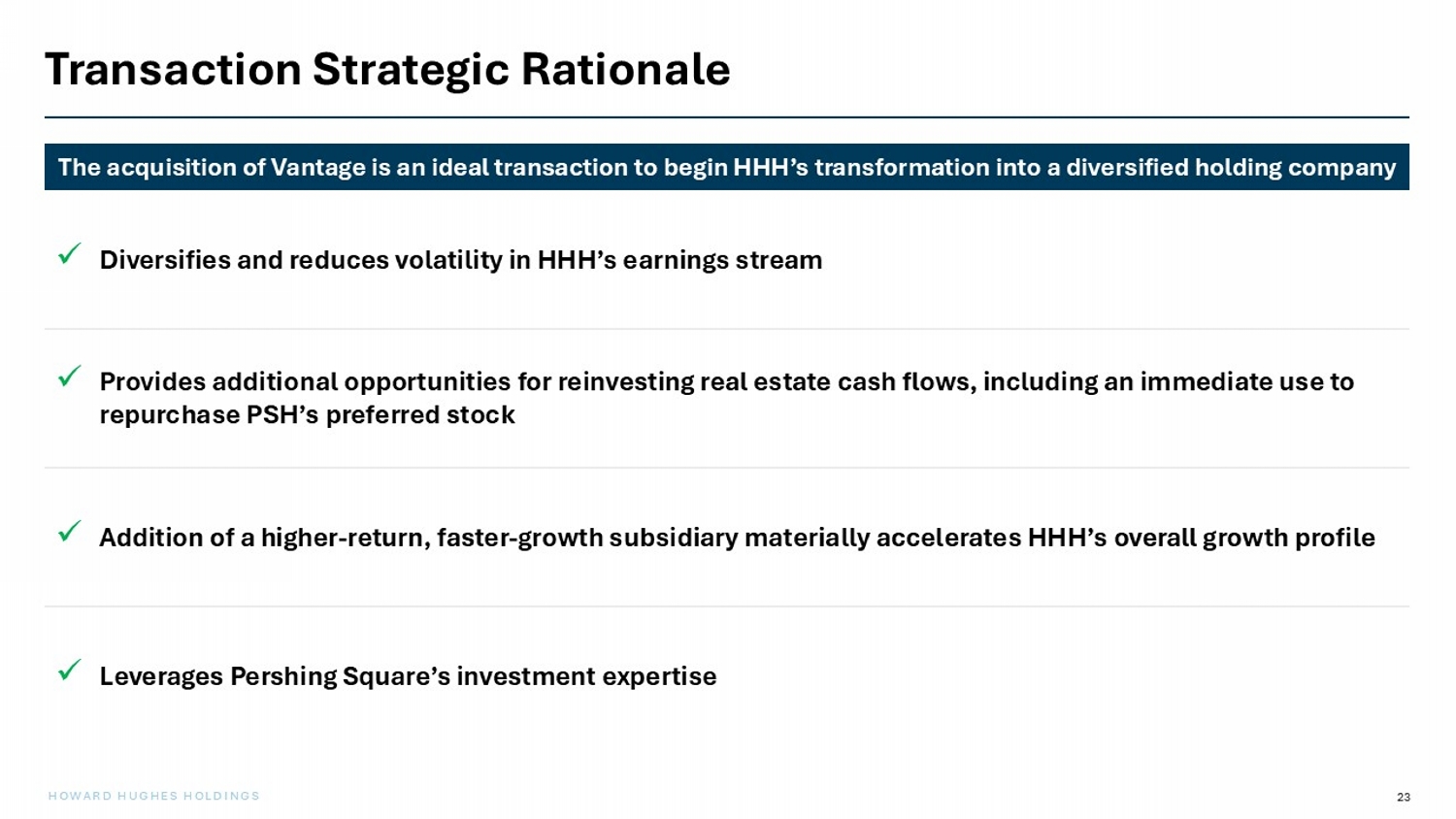 22 HOWARD HUGHES HOLDINGS Repurchase of PSH Preferred Stock Over time, we expect HHH to repurchase PSH’s preferred stock and increase its economic ownership of Vantage to 100% Investment from PSH will take the form of non - interest - bearing preferred stock issued by HHH Up to $1 billion, split into fourteen equally - sized tranches PSH’s preferred stock will be convertible into the common stock of Vantage if not redeemed by HHH by the end of the seventh fiscal year post - transaction Repurchase Call Option PSH’s preferred stock will generally be pari passu with HHH common stock; no liquidation preference Subject to a mandatory repurchase by HHH in the event of a change of control of HHH or Vantage Governance Terms At the end of each fiscal year, for the first seven years post - transaction, HHH will have the right to repurchase one or more tranches of the preferred stock Repurchase price will be cash consideration equal to 1.50x of the then book value of Vantage multiplied by the preferred tranche(s)’ corresponding ownership percentage of Vantage PSH Investment (1) The preferred stock will pay a dividend in the event of a default on HHH’s obligation to repurchase the stock in certain cir cumstances. (2) On an as exchanged basis. Subject to a minimum repurchase price equal to the original issue price plus 4% per annum throu gh the date of repurchase. If we achieve our objectives in running a profitable insurance operation and managing Vantage’s assets to generate highly att rac tive long - term rates of return, we believe that Vantage will generate high returns on equity and become worth substantially more than 1 .5x book value. The repurchase of PSH’s preferred stock at a fixed multiple therefore enables HHH to add to and eventually acquire 100 % economic ownership of Vantage over time in a highly accretive manner ( 1 ) ( 2 )