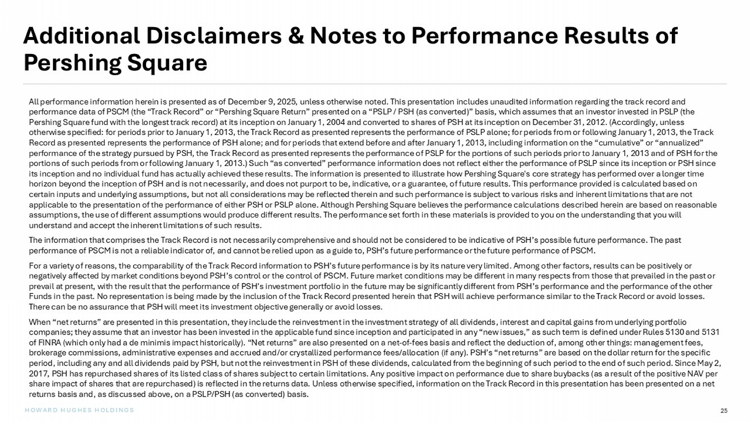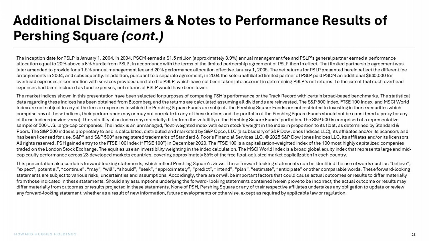 25 HOWARD HUGHES HOLDINGS Additional Disclaimers & Notes to Performance Results of Pershing Square All performance information herein is presented as of December 9, 2025, unless otherwise noted. This presentation includes un aud ited information regarding the track record and performance data of PSCM (the “Track Record” or “Pershing Square Return” presented on a “PSLP / PSH (as converted)” basis, wh ich assumes that an investor invested in PSLP (the Pershing Square fund with the longest track record) at its inception on January 1, 2004 and converted to shares of PSH at its in ception on December 31, 2012. (Accordingly, unless otherwise specified: for periods prior to January 1, 2013, the Track Record as presented represents the performance of PSLP a lon e; for periods from or following January 1, 2013, the Track Record as presented represents the performance of PSH alone; and for periods that extend before and after January 1, 2013, in clu ding information on the “cumulative” or “annualized” performance of the strategy pursued by PSH, the Track Record as presented represents the performance of PSLP for the portions of such periods prior to January 1, 2013 and of PSH for the portions of such periods from or following January 1, 2013.) Such “as converted” performance information does not reflect eit her the performance of PSLP since its inception or PSH since its inception and no individual fund has actually achieved these results. The information is presented to illustrate how Pers hin g Square's core strategy has performed over a longer time horizon beyond the inception of PSH and is not necessarily, and does not purport to be, indicative, or a guarantee, of future re sults. This performance provided is calculated based on certain inputs and underlying assumptions, but not all considerations may be reflected therein and such performance is subjec t t o various risks and inherent limitations that are not applicable to the presentation of the performance of either PSH or PSLP alone. Although Pershing Square believes the performa nce calculations described herein are based on reasonable assumptions, the use of different assumptions would produce different results. The performance set forth in these materials i s p rovided to you on the understanding that you will understand and accept the inherent limitations of such results. The information that comprises the Track Record is not necessarily comprehensive and should not be considered to be indicativ e o f PSH’s possible future performance. The past performance of PSCM is not a reliable indicator of, and cannot be relied upon as a guide to, PSH’s future performance or the fut ure performance of PSCM. For a variety of reasons, the comparability of the Track Record information to PSH’s future performance is by its nature very li mited. Among other factors, results can be positively or negatively affected by market conditions beyond PSH’s control or the control of PSCM. Future market conditions may be differe nt in many respects from those that prevailed in the past or prevail at present, with the result that the performance of PSH’s investment portfolio in the future may be significantly dif fer ent from PSH’s performance and the performance of the other Funds in the past. No representation is being made by the inclusion of the Track Record presented herein that PSH will achiev e p erformance similar to the Track Record or avoid losses. There can be no assurance that PSH will meet its investment objective generally or avoid losses. When “net returns” are presented in this presentation, they include the reinvestment in the investment strategy of all divide nds , interest and capital gains from underlying portfolio companies; they assume that an investor has been invested in the applicable fund since inception and participated in any “new is sues,” as such term is defined under Rules 5130 and 5131 of FINRA (which only had a de minimis impact historically). “Net returns” are also presented on a net - of - fees basis and reflect the deduction of, among other things: management fees, brokerage commissions, administrative expenses and accrued and/or crystallized performance fees/allocation (if any). PSH’s “n et returns” are based on the dollar return for the specific period, including any and all dividends paid by PSH, but not the reinvestment in PSH of these dividends, calculated from the beg inning of such period to the end of such period. Since May 2, 2017, PSH has repurchased shares of its listed class of shares subject to certain limitations. Any positive impact on perform anc e due to share buybacks (as a result of the positive NAV per share impact of shares that are repurchased) is reflected in the returns data. Unless otherwise specified, information on the Tr ack Record in this presentation has been presented on a net returns basis and, as discussed above, on a PSLP/PSH (as converted) basis.