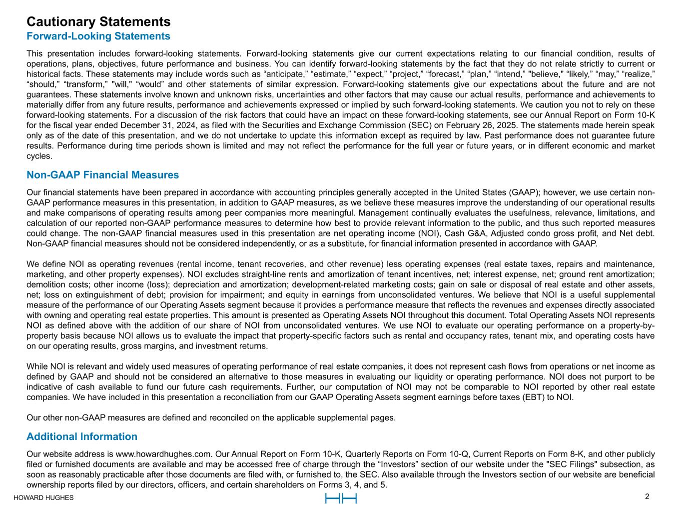 HOWARD HUGHES 2 Cautionary StatementsCautionary Statements Forward-Looking Statements This presentation includes forward-looking statements. Forward-looking statements give our current expectations relating to our financial condition, results of operations, plans, objectives, future performance and business. You can identify forward-looking statements by the fact that they do not relate strictly to current or historical facts. These statements may include words such as “anticipate,” “estimate,” “expect,” “project,” “forecast,” “plan,” “intend,” "believe," “likely,” “may,” “realize,” “should,” “transform,” "will," “would” and other statements of similar expression. Forward-looking statements give our expectations about the future and are not guarantees. These statements involve known and unknown risks, uncertainties and other factors that may cause our actual results, performance and achievements to materially differ from any future results, performance and achievements expressed or implied by such forward-looking statements. We caution you not to rely on these forward-looking statements. For a discussion of the risk factors that could have an impact on these forward-looking statements, see our Annual Report on Form 10-K for the fiscal year ended December 31, 2024, as filed with the Securities and Exchange Commission (SEC) on February 26, 2025. The statements made herein speak only as of the date of this presentation, and we do not undertake to update this information except as required by law. Past performance does not guarantee future results. Performance during time periods shown is limited and may not reflect the performance for the full year or future years, or in different economic and market cycles. Non-GAAP Financial Measures Our financial statements have been prepared in accordance with accounting principles generally accepted in the United States (GAAP); however, we use certain non- GAAP performance measures in this presentation, in addition to GAAP measures, as we believe these measures improve the understanding of our operational results and make comparisons of operating results among peer companies more meaningful. Management continually evaluates the usefulness, relevance, limitations, and calculation of our reported non-GAAP performance measures to determine how best to provide relevant information to the public, and thus such reported measures could change. The non-GAAP financial measures used in this presentation are net operating income (NOI), Cash G&A, Adjusted condo gross profit, and Net debt. Non-GAAP financial measures should not be considered independently, or as a substitute, for financial information presented in accordance with GAAP. We define NOI as operating revenues (rental income, tenant recoveries, and other revenue) less operating expenses (real estate taxes, repairs and maintenance, marketing, and other property expenses). NOI excludes straight-line rents and amortization of tenant incentives, net; interest expense, net; ground rent amortization; demolition costs; other income (loss); depreciation and amortization; development-related marketing costs; gain on sale or disposal of real estate and other assets, net; loss on extinguishment of debt; provision for impairment; and equity in earnings from unconsolidated ventures. We believe that NOI is a useful supplemental measure of the performance of our Operating Assets segment because it provides a performance measure that reflects the revenues and expenses directly associated with owning and operating real estate properties. This amount is presented as Operating Assets NOI throughout this document. Total Operating Assets NOI represents NOI as defined above with the addition of our share of NOI from unconsolidated ventures. We use NOI to evaluate our operating performance on a property-by- property basis because NOI allows us to evaluate the impact that property-specific factors such as rental and occupancy rates, tenant mix, and operating costs have on our operating results, gross margins, and investment returns. While NOI is relevant and widely used measures of operating performance of real estate companies, it does not represent cash flows from operations or net income as defined by GAAP and should not be considered an alternative to those measures in evaluating our liquidity or operating performance. NOI does not purport to be indicative of cash available to fund our future cash requirements. Further, our computation of NOI may not be comparable to NOI reported by other real estate companies. We have included in this presentation a reconciliation from our GAAP Operating Assets segment earnings before taxes (EBT) to NOI. Our other non-GAAP measures are defined and reconciled on the applicable supplemental pages. Additional Information Our website address is www.howardhughes.com. Our Annual Report on Form 10-K, Quarterly Reports on Form 10-Q, Current Reports on Form 8-K, and other publicly filed or furnished documents are available and may be accessed free of charge through the “Investors” section of our website under the "SEC Filings" subsection, as soon as reasonably practicable after those documents are filed with, or furnished to, the SEC. Also available through the Investors section of our website are beneficial ownership reports filed by our directors, officers, and certain shareholders on Forms 3, 4, and 5.