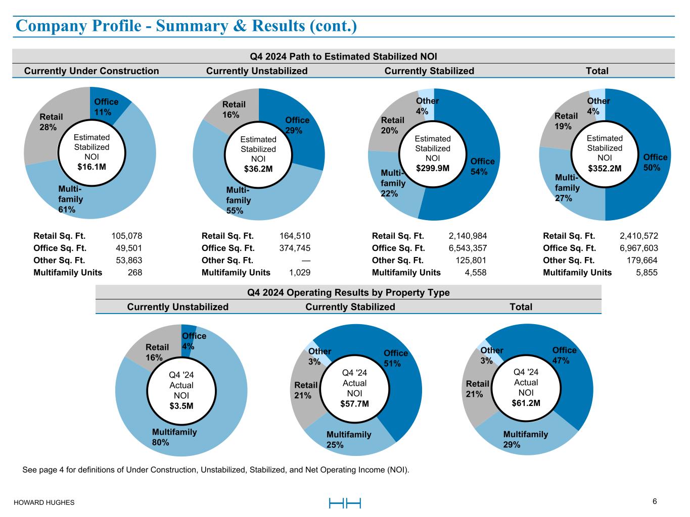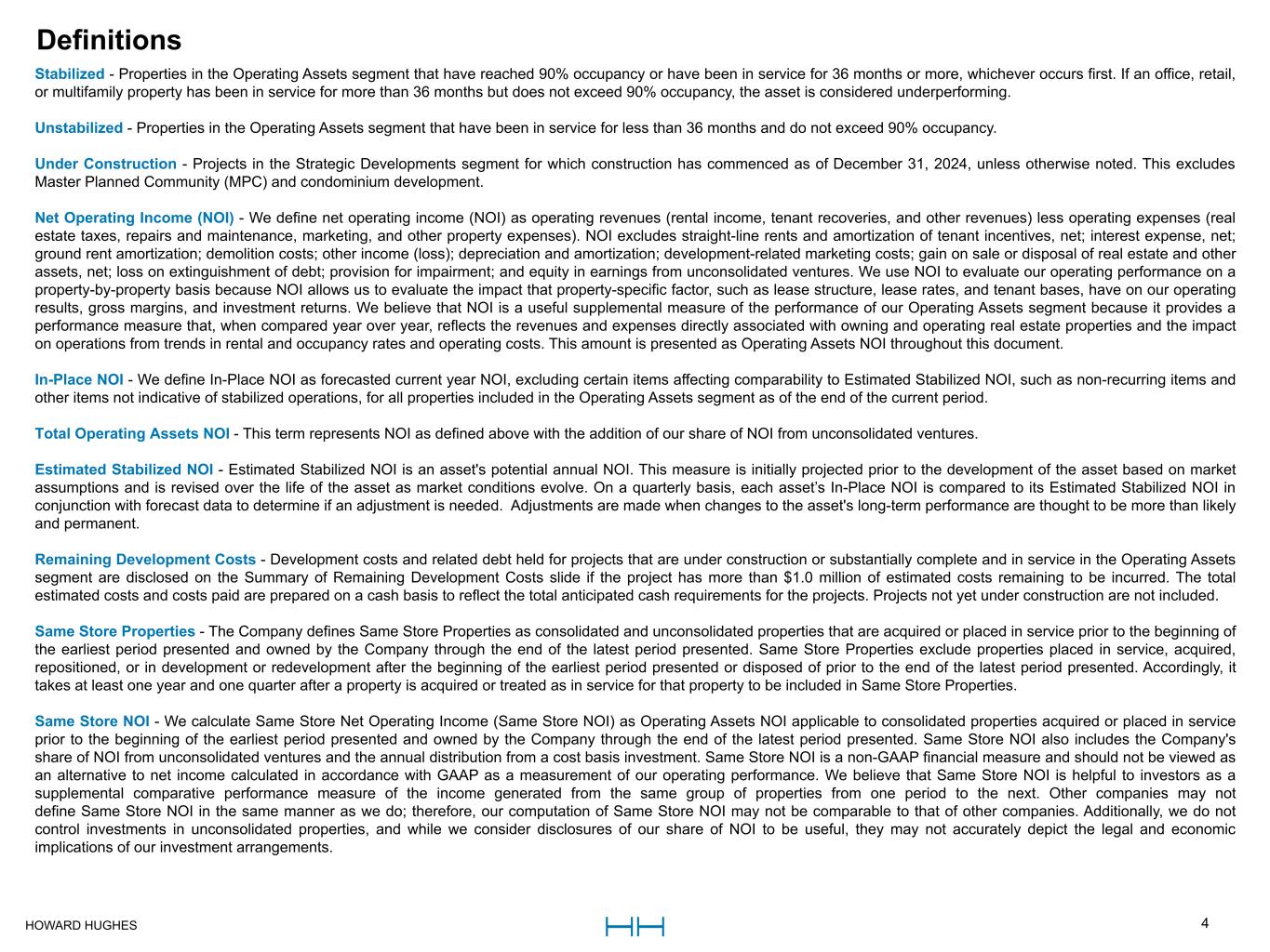 HOWARD HUGHES 4 Stabilized - Properties in the Operating Assets segment that have reached 90% occupancy or have been in service for 36 months or more, whichever occurs first. If an office, retail, or multifamily property has been in service for more than 36 months but does not exceed 90% occupancy, the asset is considered underperforming. Unstabilized - Properties in the Operating Assets segment that have been in service for less than 36 months and do not exceed 90% occupancy. Under Construction - Projects in the Strategic Developments segment for which construction has commenced as of December 31, 2024, unless otherwise noted. This excludes Master Planned Community (MPC) and condominium development. Net Operating Income (NOI) - We define net operating income (NOI) as operating revenues (rental income, tenant recoveries, and other revenues) less operating expenses (real estate taxes, repairs and maintenance, marketing, and other property expenses). NOI excludes straight-line rents and amortization of tenant incentives, net; interest expense, net; ground rent amortization; demolition costs; other income (loss); depreciation and amortization; development-related marketing costs; gain on sale or disposal of real estate and other assets, net; loss on extinguishment of debt; provision for impairment; and equity in earnings from unconsolidated ventures. We use NOI to evaluate our operating performance on a property-by-property basis because NOI allows us to evaluate the impact that property-specific factor, such as lease structure, lease rates, and tenant bases, have on our operating results, gross margins, and investment returns. We believe that NOI is a useful supplemental measure of the performance of our Operating Assets segment because it provides a performance measure that, when compared year over year, reflects the revenues and expenses directly associated with owning and operating real estate properties and the impact on operations from trends in rental and occupancy rates and operating costs. This amount is presented as Operating Assets NOI throughout this document. In-Place NOI - We define In-Place NOI as forecasted current year NOI, excluding certain items affecting comparability to Estimated Stabilized NOI, such as non-recurring items and other items not indicative of stabilized operations, for all properties included in the Operating Assets segment as of the end of the current period. Total Operating Assets NOI - This term represents NOI as defined above with the addition of our share of NOI from unconsolidated ventures. Estimated Stabilized NOI - Estimated Stabilized NOI is an asset's potential annual NOI. This measure is initially projected prior to the development of the asset based on market assumptions and is revised over the life of the asset as market conditions evolve. On a quarterly basis, each asset’s In-Place NOI is compared to its Estimated Stabilized NOI in conjunction with forecast data to determine if an adjustment is needed. Adjustments are made when changes to the asset's long-term performance are thought to be more than likely and permanent. Remaining Development Costs - Development costs and related debt held for projects that are under construction or substantially complete and in service in the Operating Assets segment are disclosed on the Summary of Remaining Development Costs slide if the project has more than $1.0 million of estimated costs remaining to be incurred. The total estimated costs and costs paid are prepared on a cash basis to reflect the total anticipated cash requirements for the projects. Projects not yet under construction are not included. Same Store Properties - The Company defines Same Store Properties as consolidated and unconsolidated properties that are acquired or placed in service prior to the beginning of the earliest period presented and owned by the Company through the end of the latest period presented. Same Store Properties exclude properties placed in service, acquired, repositioned, or in development or redevelopment after the beginning of the earliest period presented or disposed of prior to the end of the latest period presented. Accordingly, it takes at least one year and one quarter after a property is acquired or treated as in service for that property to be included in Same Store Properties. Same Store NOI - We calculate Same Store Net Operating Income (Same Store NOI) as Operating Assets NOI applicable to consolidated properties acquired or placed in service prior to the beginning of the earliest period presented and owned by the Company through the end of the latest period presented. Same Store NOI also includes the Company's share of NOI from unconsolidated ventures and the annual distribution from a cost basis investment. Same Store NOI is a non-GAAP financial measure and should not be viewed as an alternative to net income calculated in accordance with GAAP as a measurement of our operating performance. We believe that Same Store NOI is helpful to investors as a supplemental comparative performance measure of the income generated from the same group of properties from one period to the next. Other companies may not define Same Store NOI in the same manner as we do; therefore, our computation of Same Store NOI may not be comparable to that of other companies. Additionally, we do not control investments in unconsolidated properties, and while we consider disclosures of our share of NOI to be useful, they may not accurately depict the legal and economic implications of our investment arrangements. DefinitionsDefinitions