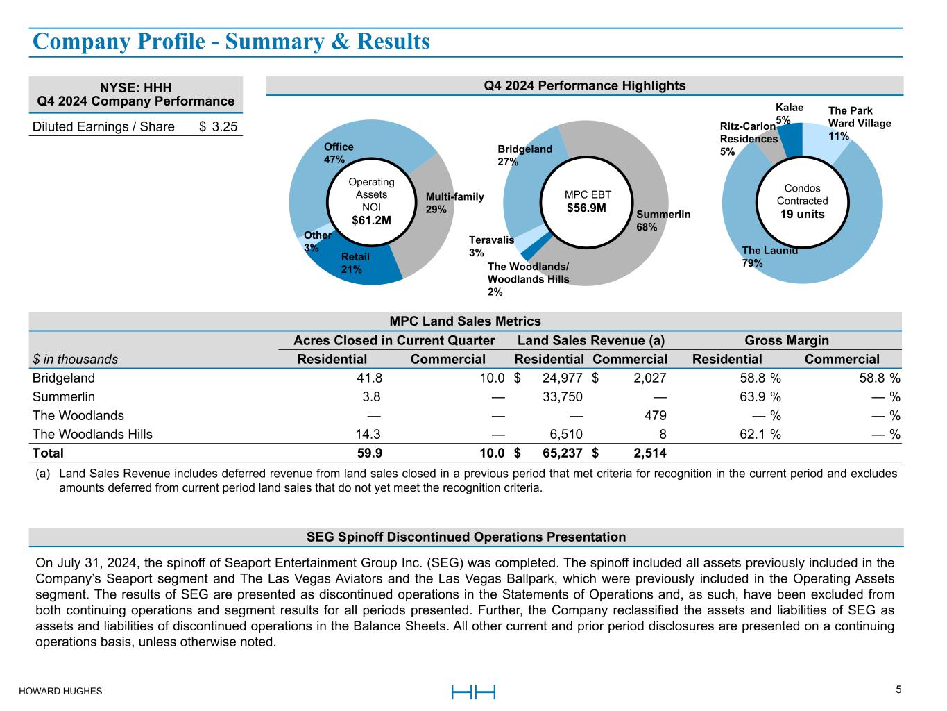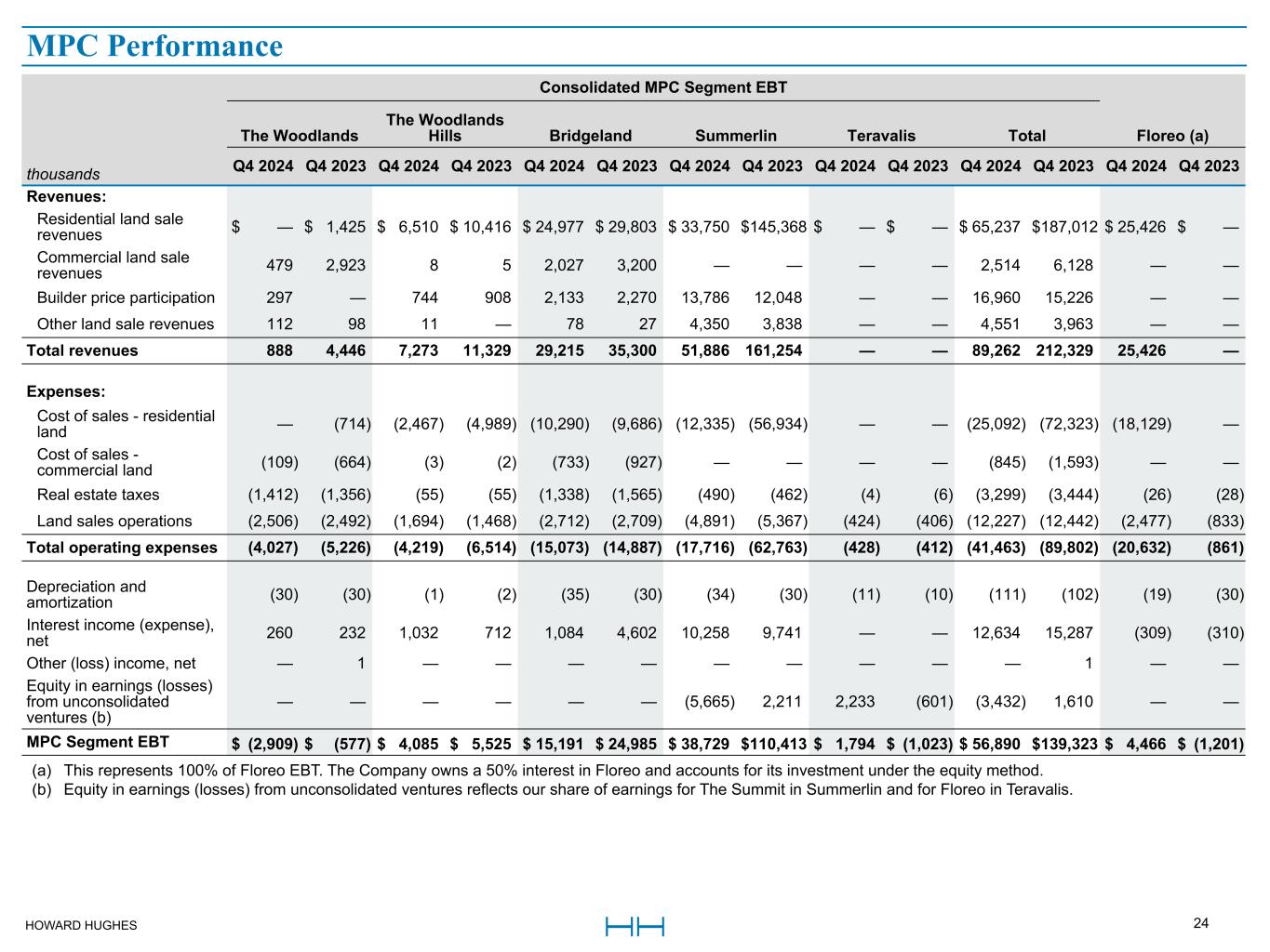 HOWARD HUGHES 24 Master Planned Community Land Consolidated MPC Segment EBT The Woodlands The Woodlands Hills Bridgeland Summerlin Teravalis Total Floreo (a) thousands Q4 2024 Q4 2023 Q4 2024 Q4 2023 Q4 2024 Q4 2023 Q4 2024 Q4 2023 Q4 2024 Q4 2023 Q4 2024 Q4 2023 Q4 2024 Q4 2023 Revenues: Residential land sale revenues $ — $ 1,425 $ 6,510 $ 10,416 $ 24,977 $ 29,803 $ 33,750 $ 145,368 $ — $ — $ 65,237 $ 187,012 $ 25,426 $ — Commercial land sale revenues 479 2,923 8 5 2,027 3,200 — — — — 2,514 6,128 — — Builder price participation 297 — 744 908 2,133 2,270 13,786 12,048 — — 16,960 15,226 — — Other land sale revenues 112 98 11 — 78 27 4,350 3,838 — — 4,551 3,963 — — Total revenues 888 4,446 7,273 11,329 29,215 35,300 51,886 161,254 — — 89,262 212,329 25,426 — Expenses: Cost of sales - residential land — (714) (2,467) (4,989) (10,290) (9,686) (12,335) (56,934) — — (25,092) (72,323) (18,129) — Cost of sales - commercial land (109) (664) (3) (2) (733) (927) — — — — (845) (1,593) — — Real estate taxes (1,412) (1,356) (55) (55) (1,338) (1,565) (490) (462) (4) (6) (3,299) (3,444) (26) (28) Land sales operations (2,506) (2,492) (1,694) (1,468) (2,712) (2,709) (4,891) (5,367) (424) (406) (12,227) (12,442) (2,477) (833) Total operating expenses (4,027) (5,226) (4,219) (6,514) (15,073) (14,887) (17,716) (62,763) (428) (412) (41,463) (89,802) (20,632) (861) Depreciation and amortization (30) (30) (1) (2) (35) (30) (34) (30) (11) (10) (111) (102) (19) (30) Interest income (expense), net 260 232 1,032 712 1,084 4,602 10,258 9,741 — — 12,634 15,287 (309) (310) Other (loss) income, net — 1 — — — — — — — — — 1 — — Equity in earnings (losses) from unconsolidated ventures (b) — — — — — — (5,665) 2,211 2,233 (601) (3,432) 1,610 — — MPC Segment EBT $ (2,909) $ (577) $ 4,085 $ 5,525 $ 15,191 $ 24,985 $ 38,729 $ 110,413 $ 1,794 $ (1,023) $ 56,890 $ 139,323 $ 4,466 $ (1,201) (a) This represents 100% of Floreo EBT. The Company owns a 50% interest in Floreo and accounts for its investment under the equity method. (b) Equity in earnings (losses) from unconsolidated ventures reflects our share of earnings for The Summit in Summerlin and for Floreo in Teravalis. MPC Performance