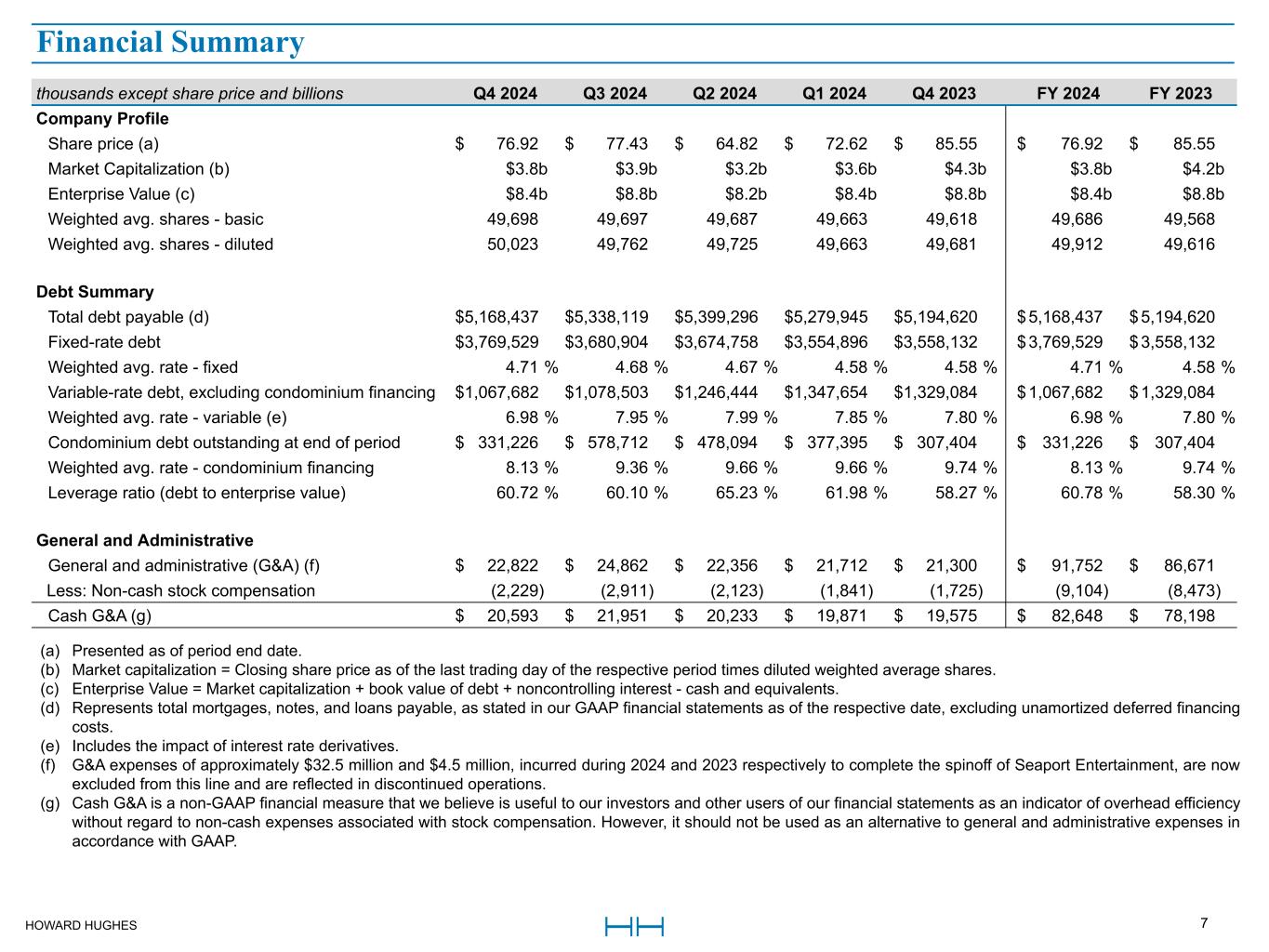 HOWARD HUGHES 7 thousands except share price and billions Q4 2024 Q3 2024 Q2 2024 Q1 2024 Q4 2023 FY 2024 FY 2023 Company Profile Share price (a) $ 76.92 $ 77.43 $ 64.82 $ 72.62 $ 85.55 $ 76.92 $ 85.55 Market Capitalization (b) $3.8b $3.9b $3.2b $3.6b $4.3b $3.8b $4.2b Enterprise Value (c) $8.4b $8.8b $8.2b $8.4b $8.8b $8.4b $8.8b Weighted avg. shares - basic 49,698 49,697 49,687 49,663 49,618 49,686 49,568 Weighted avg. shares - diluted 50,023 49,762 49,725 49,663 49,681 49,912 49,616 Debt Summary Total debt payable (d) $ 5,168,437 $ 5,338,119 $ 5,399,296 $ 5,279,945 $ 5,194,620 $ 5,168,437 $ 5,194,620 Fixed-rate debt $ 3,769,529 $ 3,680,904 $ 3,674,758 $ 3,554,896 $ 3,558,132 $ 3,769,529 $ 3,558,132 Weighted avg. rate - fixed 4.71 % 4.68 % 4.67 % 4.58 % 4.58 % 4.71 % 4.58 % Variable-rate debt, excluding condominium financing $ 1,067,682 $ 1,078,503 $ 1,246,444 $ 1,347,654 $ 1,329,084 $ 1,067,682 $ 1,329,084 Weighted avg. rate - variable (e) 6.98 % 7.95 % 7.99 % 7.85 % 7.80 % 6.98 % 7.80 % Condominium debt outstanding at end of period $ 331,226 $ 578,712 $ 478,094 $ 377,395 $ 307,404 $ 331,226 $ 307,404 Weighted avg. rate - condominium financing 8.13 % 9.36 % 9.66 % 9.66 % 9.74 % 8.13 % 9.74 % Leverage ratio (debt to enterprise value) 60.72 % 60.10 % 65.23 % 61.98 % 58.27 % 60.78 % 58.30 % General and Administrative General and administrative (G&A) (f) $ 22,822 $ 24,862 $ 22,356 $ 21,712 $ 21,300 $ 91,752 $ 86,671 Less: Non-cash stock compensation (2,229) (2,911) (2,123) (1,841) (1,725) (9,104) (8,473) Cash G&A (g) $ 20,593 $ 21,951 $ 20,233 $ 19,871 $ 19,575 $ 82,648 $ 78,198 Financial Summary (a) Presented as of period end date. (b) Market capitalization = Closing share price as of the last trading day of the respective period times diluted weighted average shares. (c) Enterprise Value = Market capitalization + book value of debt + noncontrolling interest - cash and equivalents. (d) Represents total mortgages, notes, and loans payable, as stated in our GAAP financial statements as of the respective date, excluding unamortized deferred financing costs. (e) Includes the impact of interest rate derivatives. (f) G&A expenses of approximately $32.5 million and $4.5 million, incurred during 2024 and 2023 respectively to complete the spinoff of Seaport Entertainment, are now excluded from this line and are reflected in discontinued operations. (g) Cash G&A is a non-GAAP financial measure that we believe is useful to our investors and other users of our financial statements as an indicator of overhead efficiency without regard to non-cash expenses associated with stock compensation. However, it should not be used as an alternative to general and administrative expenses in accordance with GAAP. Financial Summary