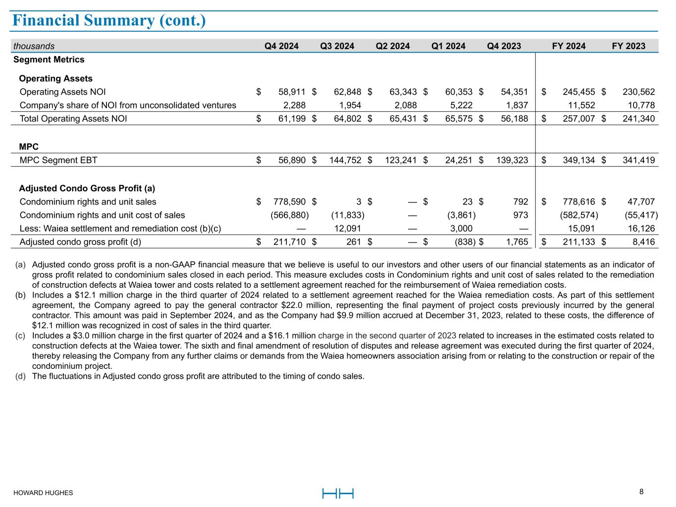 HOWARD HUGHES 8 Financial Summary (a) Adjusted condo gross profit is a non-GAAP financial measure that we believe is useful to our investors and other users of our financial statements as an indicator of gross profit related to condominium sales closed in each period. This measure excludes costs in Condominium rights and unit cost of sales related to the remediation of construction defects at Waiea tower and costs related to a settlement agreement reached for the reimbursement of Waiea remediation costs. (b) Includes a $12.1 million charge in the third quarter of 2024 related to a settlement agreement reached for the Waiea remediation costs. As part of this settlement agreement, the Company agreed to pay the general contractor $22.0 million, representing the final payment of project costs previously incurred by the general contractor. This amount was paid in September 2024, and as the Company had $9.9 million accrued at December 31, 2023, related to these costs, the difference of $12.1 million was recognized in cost of sales in the third quarter. (c) Includes a $3.0 million charge in the first quarter of 2024 and a $16.1 million charge in the second quarter of 2023 related to increases in the estimated costs related to construction defects at the Waiea tower. The sixth and final amendment of resolution of disputes and release agreement was executed during the first quarter of 2024, thereby releasing the Company from any further claims or demands from the Waiea homeowners association arising from or relating to the construction or repair of the condominium project. (d) The fluctuations in Adjusted condo gross profit are attributed to the timing of condo sales. thousands Q4 2024 Q3 2024 Q2 2024 Q1 2024 Q4 2023 FY 2024 FY 2023 Segment Metrics Operating Assets Operating Assets NOI $ 58,911 $ 62,848 $ 63,343 $ 60,353 $ 54,351 $ 245,455 $ 230,562 Company's share of NOI from unconsolidated ventures 2,288 1,954 2,088 5,222 1,837 11,552 10,778 Total Operating Assets NOI $ 61,199 $ 64,802 $ 65,431 $ 65,575 $ 56,188 $ 257,007 $ 241,340 MPC MPC Segment EBT $ 56,890 $ 144,752 $ 123,241 $ 24,251 $ 139,323 $ 349,134 $ 341,419 Adjusted Condo Gross Profit (a) Condominium rights and unit sales $ 778,590 $ 3 $ — $ 23 $ 792 $ 778,616 $ 47,707 Condominium rights and unit cost of sales (566,880) (11,833) — (3,861) 973 (582,574) (55,417) Less: Waiea settlement and remediation cost (b)(c) — 12,091 — 3,000 — 15,091 16,126 Adjusted condo gross profit (d) $ 211,710 $ 261 $ — $ (838) $ 1,765 $ 211,133 $ 8,416 Financial Summary (cont.)