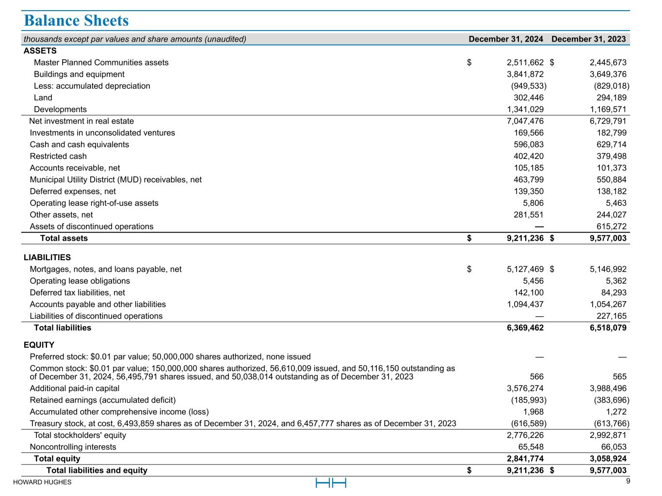 HOWARD HUGHES 9 thousands except par values and share amounts (unaudited) December 31, 2024 December 31, 2023 ASSETS Master Planned Communities assets $ 2,511,662 $ 2,445,673 Buildings and equipment 3,841,872 3,649,376 Less: accumulated depreciation (949,533) (829,018) Land 302,446 294,189 Developments 1,341,029 1,169,571 Net investment in real estate 7,047,476 6,729,791 Investments in unconsolidated ventures 169,566 182,799 Cash and cash equivalents 596,083 629,714 Restricted cash 402,420 379,498 Accounts receivable, net 105,185 101,373 Municipal Utility District (MUD) receivables, net 463,799 550,884 Deferred expenses, net 139,350 138,182 Operating lease right-of-use assets 5,806 5,463 Other assets, net 281,551 244,027 Assets of discontinued operations — 615,272 Total assets $ 9,211,236 $ 9,577,003 LIABILITIES Mortgages, notes, and loans payable, net $ 5,127,469 $ 5,146,992 Operating lease obligations 5,456 5,362 Deferred tax liabilities, net 142,100 84,293 Accounts payable and other liabilities 1,094,437 1,054,267 Liabilities of discontinued operations — 227,165 Total liabilities 6,369,462 6,518,079 EQUITY Preferred stock: $0.01 par value; 50,000,000 shares authorized, none issued — — Common stock: $0.01 par value; 150,000,000 shares authorized, 56,610,009 issued, and 50,116,150 outstanding as of December 31, 2024, 56,495,791 shares issued, and 50,038,014 outstanding as of December 31, 2023 566 565 Additional paid-in capital 3,576,274 3,988,496 Retained earnings (accumulated deficit) (185,993) (383,696) Accumulated other comprehensive income (loss) 1,968 1,272 Treasury stock, at cost, 6,493,859 shares as of December 31, 2024, and 6,457,777 shares as of December 31, 2023 (616,589) (613,766) Total stockholders' equity 2,776,226 2,992,871 Noncontrolling interests 65,548 66,053 Total equity 2,841,774 3,058,924 Total liabilities and equity $ 9,211,236 $ 9,577,003 Balance Sheets