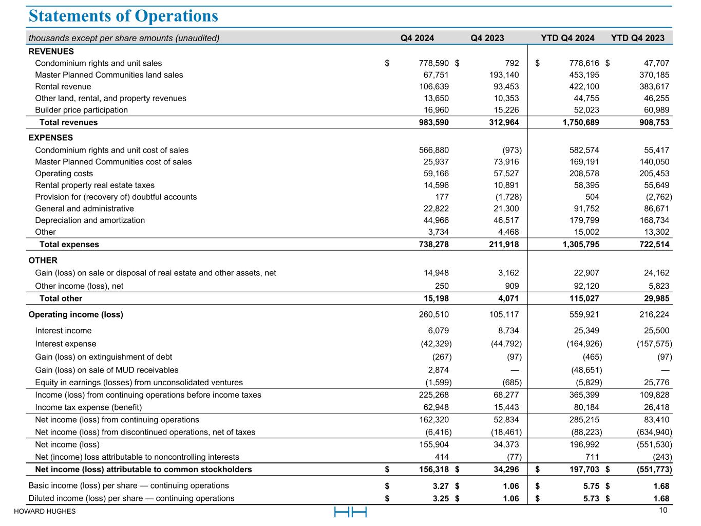 HOWARD HUGHES 10 thousands except per share amounts (unaudited) Q4 2024 Q4 2023 YTD Q4 2024 YTD Q4 2023 REVENUES Condominium rights and unit sales $ 778,590 $ 792 $ 778,616 $ 47,707 Master Planned Communities land sales 67,751 193,140 453,195 370,185 Rental revenue 106,639 93,453 422,100 383,617 Other land, rental, and property revenues 13,650 10,353 44,755 46,255 Builder price participation 16,960 15,226 52,023 60,989 Total revenues 983,590 312,964 1,750,689 908,753 EXPENSES Condominium rights and unit cost of sales 566,880 (973) 582,574 55,417 Master Planned Communities cost of sales 25,937 73,916 169,191 140,050 Operating costs 59,166 57,527 208,578 205,453 Rental property real estate taxes 14,596 10,891 58,395 55,649 Provision for (recovery of) doubtful accounts 177 (1,728) 504 (2,762) General and administrative 22,822 21,300 91,752 86,671 Depreciation and amortization 44,966 46,517 179,799 168,734 Other 3,734 4,468 15,002 13,302 Total expenses 738,278 211,918 1,305,795 722,514 OTHER Gain (loss) on sale or disposal of real estate and other assets, net 14,948 3,162 22,907 24,162 Other income (loss), net 250 909 92,120 5,823 Total other 15,198 4,071 115,027 29,985 Operating income (loss) 260,510 105,117 559,921 216,224 Interest income 6,079 8,734 25,349 25,500 Interest expense (42,329) (44,792) (164,926) (157,575) Gain (loss) on extinguishment of debt (267) (97) (465) (97) Gain (loss) on sale of MUD receivables 2,874 — (48,651) — Equity in earnings (losses) from unconsolidated ventures (1,599) (685) (5,829) 25,776 Income (loss) from continuing operations before income taxes 225,268 68,277 365,399 109,828 Income tax expense (benefit) 62,948 15,443 80,184 26,418 Net income (loss) from continuing operations 162,320 52,834 285,215 83,410 Net income (loss) from discontinued operations, net of taxes (6,416) (18,461) (88,223) (634,940) Net income (loss) 155,904 34,373 196,992 (551,530) Net (income) loss attributable to noncontrolling interests 414 (77) 711 (243) Net income (loss) attributable to common stockholders $ 156,318 $ 34,296 $ 197,703 $ (551,773) Basic income (loss) per share — continuing operations $ 3.27 $ 1.06 $ 5.75 $ 1.68 Diluted income (loss) per share — continuing operations $ 3.25 $ 1.06 $ 5.73 $ 1.68 Statements of Operations