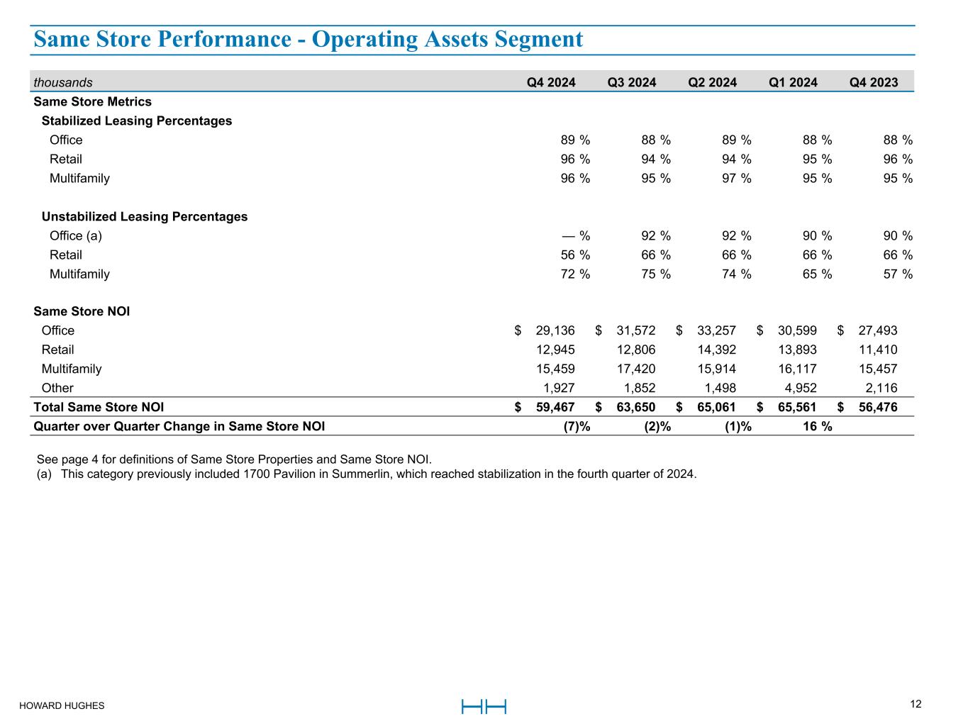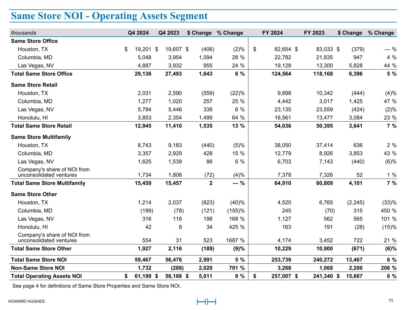 HOWARD HUGHES 11 thousands Q4 2024 Q4 2023 $ Change % Change FY 2024 FY 2023 $ Change % Change Same Store Office Houston, TX $ 19,201 $ 19,607 $ (406) (2) % $ 82,654 $ 83,033 $ (379) — % Columbia, MD 5,048 3,954 1,094 28 % 22,782 21,835 947 4 % Las Vegas, NV 4,887 3,932 955 24 % 19,128 13,300 5,828 44 % Total Same Store Office 29,136 27,493 1,643 6 % 124,564 118,168 6,396 5 % Same Store Retail Houston, TX 2,031 2,590 (559) (22) % 9,898 10,342 (444) (4) % Columbia, MD 1,277 1,020 257 25 % 4,442 3,017 1,425 47 % Las Vegas, NV 5,784 5,446 338 6 % 23,135 23,559 (424) (2) % Honolulu, HI 3,853 2,354 1,499 64 % 16,561 13,477 3,084 23 % Total Same Store Retail 12,945 11,410 1,535 13 % 54,036 50,395 3,641 7 % Same Store Multifamily Houston, TX 8,743 9,183 (440) (5) % 38,050 37,414 636 2 % Columbia, MD 3,357 2,929 428 15 % 12,779 8,926 3,853 43 % Las Vegas, NV 1,625 1,539 86 6 % 6,703 7,143 (440) (6) % Company's share of NOI from unconsolidated ventures 1,734 1,806 (72) (4) % 7,378 7,326 52 1 % Total Same Store Multifamily 15,459 15,457 2 — % 64,910 60,809 4,101 7 % Same Store Other Houston, TX 1,214 2,037 (823) (40) % 4,520 6,765 (2,245) (33) % Columbia, MD (199) (78) (121) (155) % 245 (70) 315 450 % Las Vegas, NV 316 118 198 168 % 1,127 562 565 101 % Honolulu, HI 42 8 34 425 % 163 191 (28) (15) % Company's share of NOI from unconsolidated ventures 554 31 523 1687 % 4,174 3,452 722 21 % Total Same Store Other 1,927 2,116 (189) (9) % 10,229 10,900 (671) (6) % Total Same Store NOI 59,467 56,476 2,991 5 % 253,739 240,272 13,467 6 % Non-Same Store NOI 1,732 (288) 2,020 701 % 3,268 1,068 2,200 206 % Total Operating Assets NOI $ 61,199 $ 56,188 $ 5,011 9 % $ 257,007 $ 241,340 $ 15,667 6 % See page 4 for definitions of Same Store Properties and Same Store NOI. Same Store NOI - Operating Assets Segment