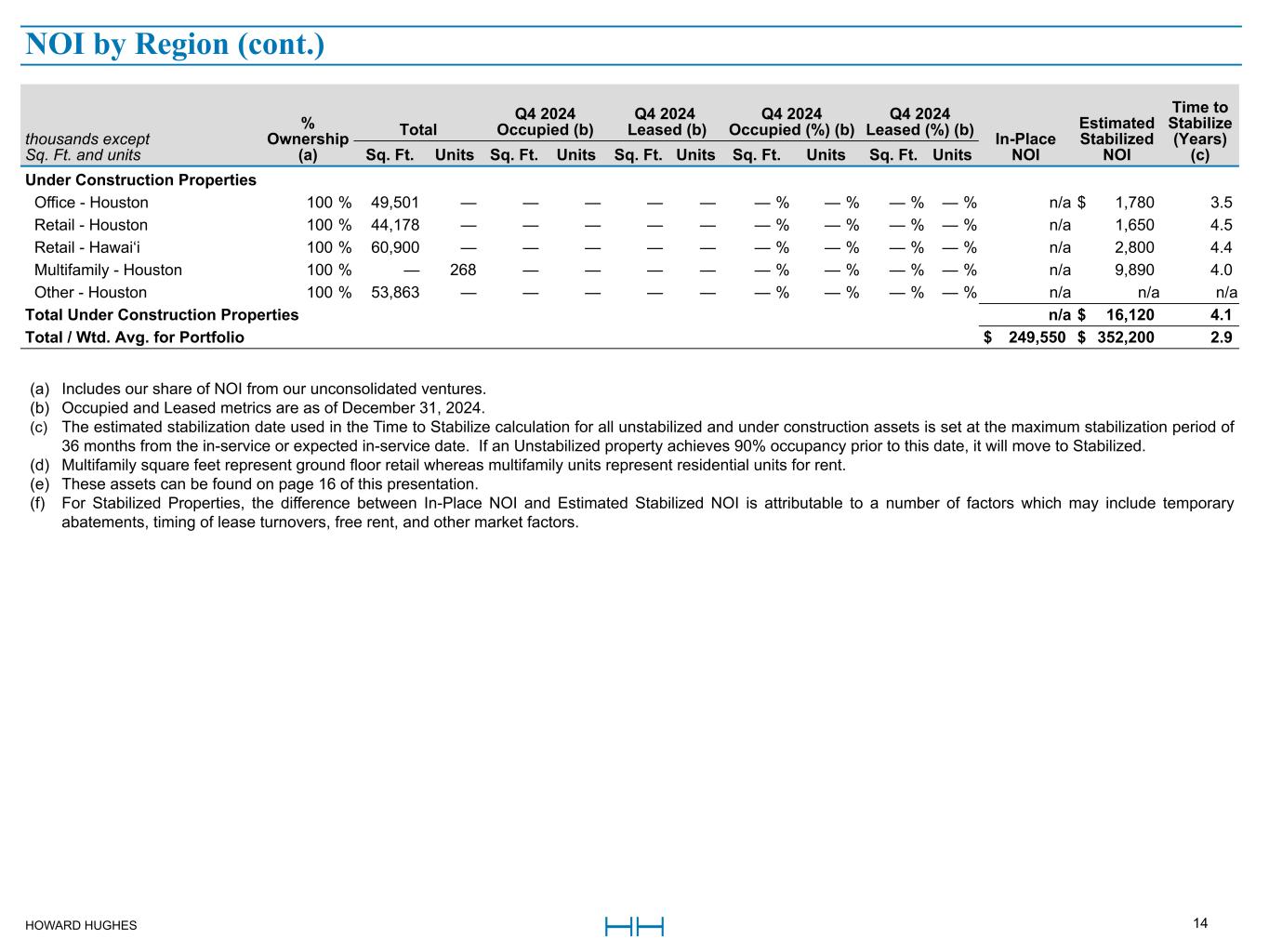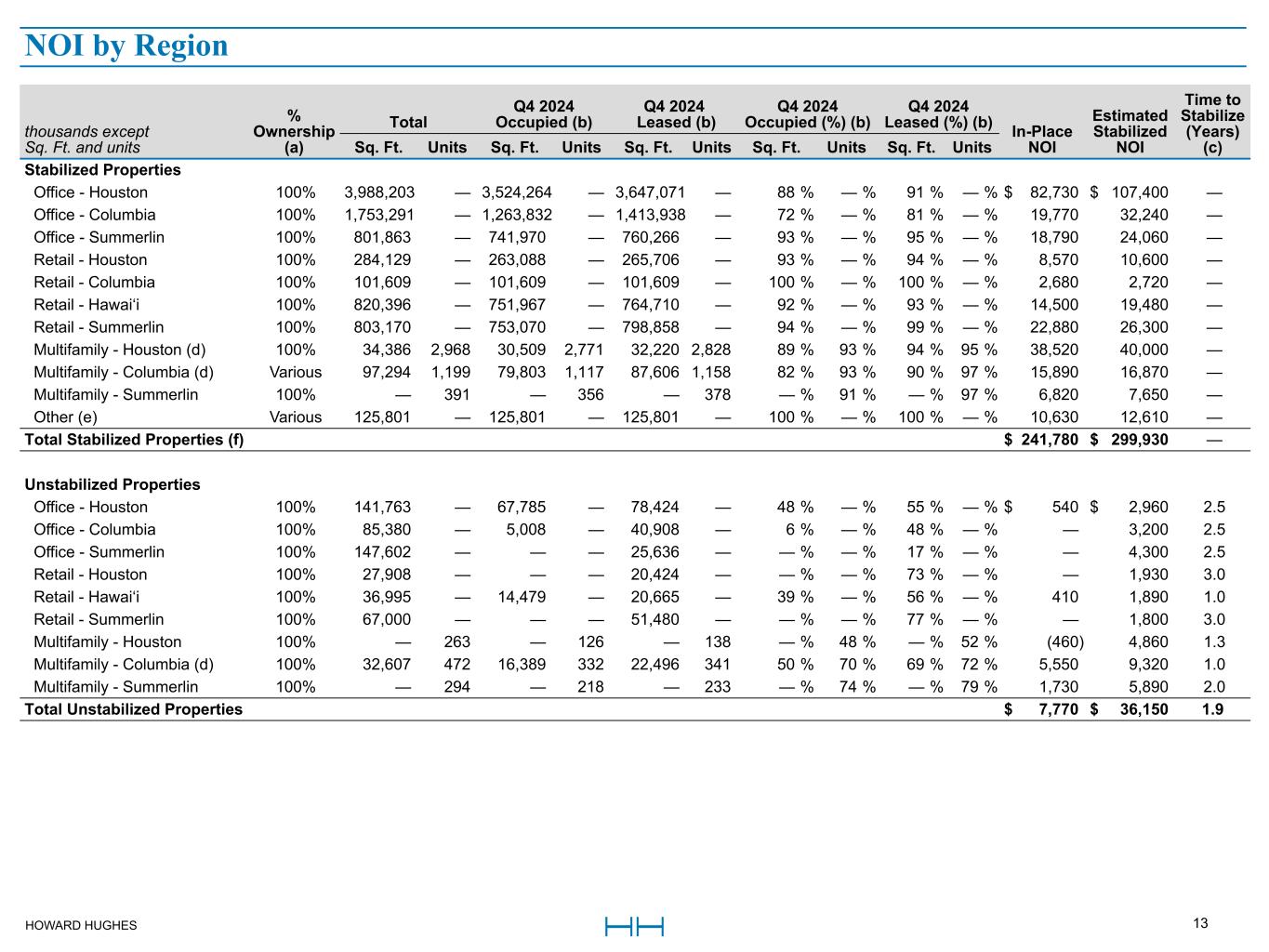 HOWARD HUGHES 13 thousands except Sq. Ft. and units % Ownership (a) Total Q4 2024 Occupied (b) Q4 2024 Leased (b) Q4 2024 Occupied (%) (b) Q4 2024 Leased (%) (b) In-Place NOI Estimated Stabilized NOI Time to Stabilize (Years) (c)Sq. Ft. Units Sq. Ft. Units Sq. Ft. Units Sq. Ft. Units Sq. Ft. Units Stabilized Properties Office - Houston 100% 3,988,203 — 3,524,264 — 3,647,071 — 88 % — % 91 % — % $ 82,730 $ 107,400 — Office - Columbia 100% 1,753,291 — 1,263,832 — 1,413,938 — 72 % — % 81 % — % 19,770 32,240 — Office - Summerlin 100% 801,863 — 741,970 — 760,266 — 93 % — % 95 % — % 18,790 24,060 — Retail - Houston 100% 284,129 — 263,088 — 265,706 — 93 % — % 94 % — % 8,570 10,600 — Retail - Columbia 100% 101,609 — 101,609 — 101,609 — 100 % — % 100 % — % 2,680 2,720 — Retail - Hawai‘i 100% 820,396 — 751,967 — 764,710 — 92 % — % 93 % — % 14,500 19,480 — Retail - Summerlin 100% 803,170 — 753,070 — 798,858 — 94 % — % 99 % — % 22,880 26,300 — Multifamily - Houston (d) 100% 34,386 2,968 30,509 2,771 32,220 2,828 89 % 93 % 94 % 95 % 38,520 40,000 — Multifamily - Columbia (d) Various 97,294 1,199 79,803 1,117 87,606 1,158 82 % 93 % 90 % 97 % 15,890 16,870 — Multifamily - Summerlin 100% — 391 — 356 — 378 — % 91 % — % 97 % 6,820 7,650 — Other (e) Various 125,801 — 125,801 — 125,801 — 100 % — % 100 % — % 10,630 12,610 — Total Stabilized Properties (f) $ 241,780 $ 299,930 — Unstabilized Properties Office - Houston 100% 141,763 — 67,785 — 78,424 — 48 % — % 55 % — % $ 540 $ 2,960 2.5 Office - Columbia 100% 85,380 — 5,008 — 40,908 — 6 % — % 48 % — % — 3,200 2.5 Office - Summerlin 100% 147,602 — — — 25,636 — — % — % 17 % — % — 4,300 2.5 Retail - Houston 100% 27,908 — — — 20,424 — — % — % 73 % — % — 1,930 3.0 Retail - Hawai‘i 100% 36,995 — 14,479 — 20,665 — 39 % — % 56 % — % 410 1,890 1.0 Retail - Summerlin 100% 67,000 — — — 51,480 — — % — % 77 % — % — 1,800 3.0 Multifamily - Houston 100% — 263 — 126 — 138 — % 48 % — % 52 % (460) 4,860 1.3 Multifamily - Columbia (d) 100% 32,607 472 16,389 332 22,496 341 50 % 70 % 69 % 72 % 5,550 9,320 1.0 Multifamily - Summerlin 100% — 294 — 218 — 233 — % 74 % — % 79 % 1,730 5,890 2.0 Total Unstabilized Properties $ 7,770 $ 36,150 1.9 NOI by Region