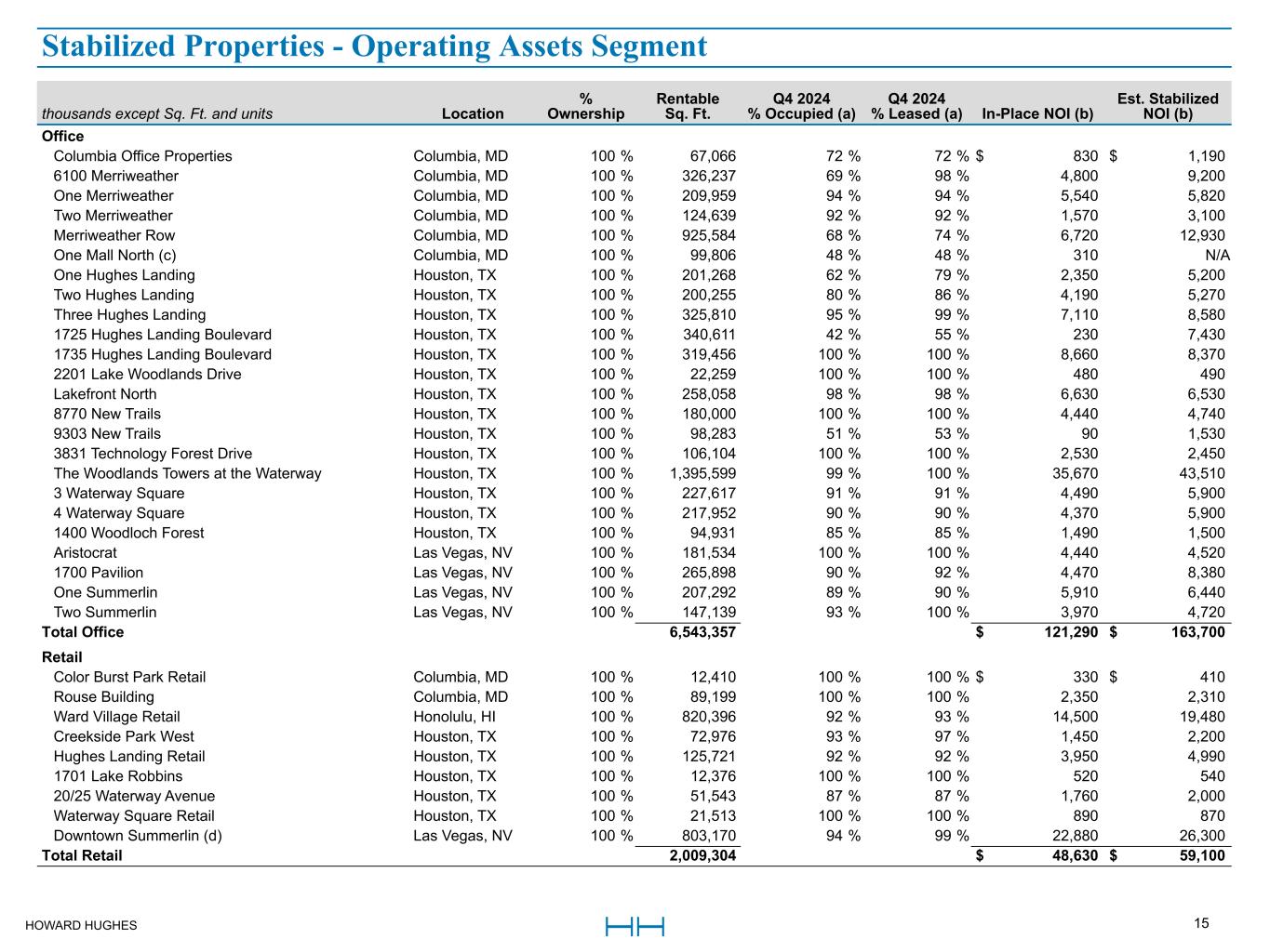 HOWARD HUGHES 15 thousands except Sq. Ft. and units Location % Ownership Rentable Sq. Ft. Q4 2024 % Occupied (a) Q4 2024 % Leased (a) In-Place NOI (b) Est. Stabilized NOI (b) Office Columbia Office Properties Columbia, MD 100 % 67,066 72 % 72 % $ 830 $ 1,190 6100 Merriweather Columbia, MD 100 % 326,237 69 % 98 % 4,800 9,200 One Merriweather Columbia, MD 100 % 209,959 94 % 94 % 5,540 5,820 Two Merriweather Columbia, MD 100 % 124,639 92 % 92 % 1,570 3,100 Merriweather Row Columbia, MD 100 % 925,584 68 % 74 % 6,720 12,930 One Mall North (c) Columbia, MD 100 % 99,806 48 % 48 % 310 N/A One Hughes Landing Houston, TX 100 % 201,268 62 % 79 % 2,350 5,200 Two Hughes Landing Houston, TX 100 % 200,255 80 % 86 % 4,190 5,270 Three Hughes Landing Houston, TX 100 % 325,810 95 % 99 % 7,110 8,580 1725 Hughes Landing Boulevard Houston, TX 100 % 340,611 42 % 55 % 230 7,430 1735 Hughes Landing Boulevard Houston, TX 100 % 319,456 100 % 100 % 8,660 8,370 2201 Lake Woodlands Drive Houston, TX 100 % 22,259 100 % 100 % 480 490 Lakefront North Houston, TX 100 % 258,058 98 % 98 % 6,630 6,530 8770 New Trails Houston, TX 100 % 180,000 100 % 100 % 4,440 4,740 9303 New Trails Houston, TX 100 % 98,283 51 % 53 % 90 1,530 3831 Technology Forest Drive Houston, TX 100 % 106,104 100 % 100 % 2,530 2,450 The Woodlands Towers at the Waterway Houston, TX 100 % 1,395,599 99 % 100 % 35,670 43,510 3 Waterway Square Houston, TX 100 % 227,617 91 % 91 % 4,490 5,900 4 Waterway Square Houston, TX 100 % 217,952 90 % 90 % 4,370 5,900 1400 Woodloch Forest Houston, TX 100 % 94,931 85 % 85 % 1,490 1,500 Aristocrat Las Vegas, NV 100 % 181,534 100 % 100 % 4,440 4,520 1700 Pavilion Las Vegas, NV 100 % 265,898 90 % 92 % 4,470 8,380 One Summerlin Las Vegas, NV 100 % 207,292 89 % 90 % 5,910 6,440 Two Summerlin Las Vegas, NV 100 % 147,139 93 % 100 % 3,970 4,720 Total Office 6,543,357 $ 121,290 $ 163,700 Retail Color Burst Park Retail Columbia, MD 100 % 12,410 100 % 100 % $ 330 $ 410 Rouse Building Columbia, MD 100 % 89,199 100 % 100 % 2,350 2,310 Ward Village Retail Honolulu, HI 100 % 820,396 92 % 93 % 14,500 19,480 Creekside Park West Houston, TX 100 % 72,976 93 % 97 % 1,450 2,200 Hughes Landing Retail Houston, TX 100 % 125,721 92 % 92 % 3,950 4,990 1701 Lake Robbins Houston, TX 100 % 12,376 100 % 100 % 520 540 20/25 Waterway Avenue Houston, TX 100 % 51,543 87 % 87 % 1,760 2,000 Waterway Square Retail Houston, TX 100 % 21,513 100 % 100 % 890 870 Downtown Summerlin (d) Las Vegas, NV 100 % 803,170 94 % 99 % 22,880 26,300 Total Retail 2,009,304 $ 48,630 $ 59,100 Stabilized Properties - Operating Assets Segment