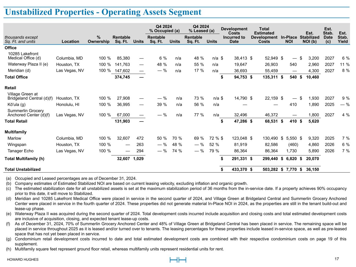 HOWARD HUGHES 16 Q4 2024 % Occupied (a) Q4 2024 % Leased (a) Estimated Stabilized NOI (b)thousands except Sq. Ft. and units Location % Ownership Rentable Sq. Ft. Units Rentable Sq. Ft. Units Rentable Sq. Ft. Units In-Place NOI (b) Multifamily Juniper Columbia, MD 100 % 55,677 382 81 % 95 % 95 % 96 % $ 8,440 $ 9,160 TEN.m.flats Columbia, MD 50 % 28,026 437 96 % 93 % 96 % 96 % 4,050 4,250 The Metropolitan Columbia, MD 50 % 13,591 380 56 % 92 % 56 % 98 % 3,400 3,460 Creekside Park Houston, TX 100 % — 292 n/a 92 % n/a 93 % 2,840 3,000 Creekside Park The Grove Houston, TX 100 % — 360 n/a 93 % n/a 95 % 3,720 4,210 One Lakes Edge Houston, TX 100 % 22,971 390 83 % 93 % 91 % 95 % 7,280 7,260 Two Lakes Edge Houston, TX 100 % 11,415 386 100 % 96 % 100 % 97 % 8,400 8,750 Lakeside Row Houston, TX 100 % — 312 n/a 91 % n/a 95 % 3,080 3,090 Millennium Six Pines Houston, TX 100 % — 314 n/a 93 % n/a 96 % 3,730 3,770 Millennium Waterway Houston, TX 100 % — 393 n/a 94 % n/a 96 % 3,870 3,910 Starling at Bridgeland Houston, TX 100 % — 358 — % 92 % — % 96 % 2,960 3,400 The Lane at Waterway Houston, TX 100 % — 163 n/a 96 % n/a 96 % 2,640 2,610 Constellation Las Vegas, NV 100 % — 124 n/a 95 % n/a 99 % 1,960 2,500 Tanager Las Vegas, NV 100 % — 267 n/a 89 % n/a 96 % 4,860 5,150 Total Multifamily (e) 131,680 4,558 $ 61,230 $ 64,520 Other Houston Ground Leases Houston, TX 100 % n/a n/a n/a n/a n/a n/a $ 3,090 $ 3,160 Hughes Landing Daycare Houston, TX 100 % — n/a — % n/a — % n/a 200 280 Stewart Title of Montgomery County, TX Houston, TX 50 % n/a n/a n/a n/a n/a n/a 750 1,600 The Woodlands Warehouse Houston, TX 100 % 125,801 n/a 100 % n/a 100 % n/a 1,430 1,520 Woodlands Sarofim Houston, TX 20 % n/a n/a n/a n/a n/a n/a 200 250 Kewalo Basin Harbor Honolulu, HI 100 % n/a n/a n/a n/a n/a n/a 1,910 1,900 Hockey Ground Lease Las Vegas, NV 100 % n/a n/a n/a n/a n/a n/a 640 590 Summerlin Hospital Medical Center Las Vegas, NV 5 % n/a n/a n/a n/a n/a n/a 3,240 4,640 Other Assets Various 100 % n/a n/a n/a n/a n/a n/a (830) (1,330) Total Other 125,801 — $ 10,630 $ 12,610 Total Stabilized $ 241,780 $ 299,930 (a) Occupied and Leased percentages are as of December 31, 2024. (b) For Stabilized Properties, the difference between In-Place NOI and Estimated Stabilized NOI is attributable to a number of factors which may include temporary abatements, timing of lease turnovers, free rent, and other market factors. (c) One Mall North will be decommissioned and moved to Strategic Developments for redevelopment in 2025. (d) Downtown Summerlin rentable sq. ft. excludes 381,767 sq. ft. of anchor space and 39,700 sq. ft. of office space. (e) Multifamily square feet represent ground floor retail whereas multifamily units represent residential units for rent. Stabilized Properties - Operating Assets Segment (cont.)