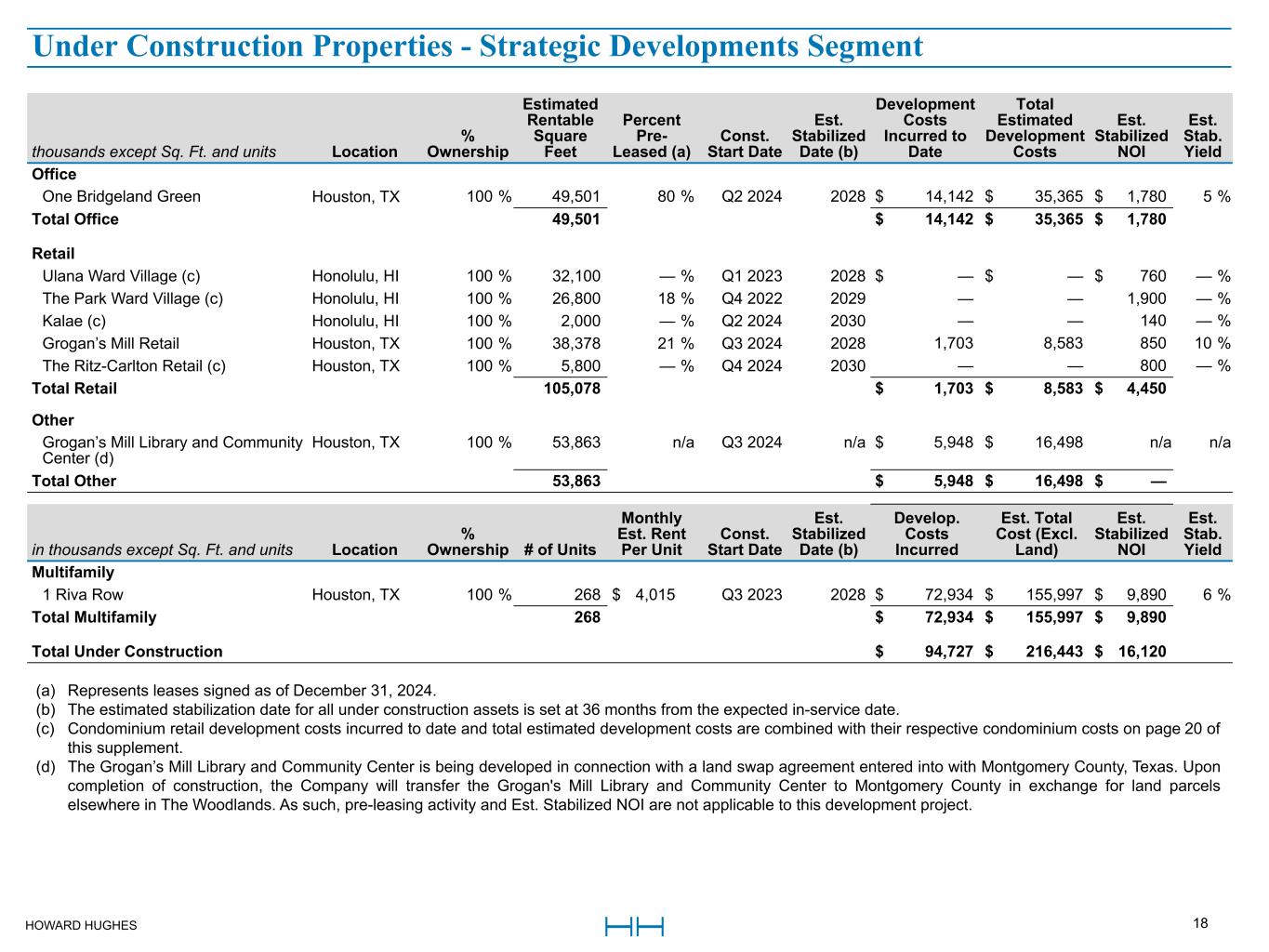 HOWARD HUGHES 18 Under Construction Properties thousands except Sq. Ft. and units Location % Ownership Estimated Rentable Square Feet Percent Pre- Leased (a) Const. Start Date Est. Stabilized Date (b) Development Costs Incurred to Date Total Estimated Development Costs Est. Stabilized NOI Est. Stab. Yield Office One Bridgeland Green Houston, TX 100 % 49,501 80 % Q2 2024 2028 $ 14,142 $ 35,365 $ 1,780 5 % Total Office 49,501 $ 14,142 $ 35,365 $ 1,780 Retail Ulana Ward Village (c) Honolulu, HI 100 % 32,100 — % Q1 2023 2028 $ — $ — $ 760 — % The Park Ward Village (c) Honolulu, HI 100 % 26,800 18 % Q4 2022 2029 — — 1,900 — % Kalae (c) Honolulu, HI 100 % 2,000 — % Q2 2024 2030 — — 140 — % Grogan’s Mill Retail Houston, TX 100 % 38,378 21 % Q3 2024 2028 1,703 8,583 850 10 % The Ritz-Carlton Retail (c) Houston, TX 100 % 5,800 — % Q4 2024 2030 — — 800 — % Total Retail 105,078 $ 1,703 $ 8,583 $ 4,450 Other Grogan’s Mill Library and Community Center (d) Houston, TX 100 % 53,863 n/a Q3 2024 n/a $ 5,948 $ 16,498 n/a n/a Total Other 53,863 $ 5,948 $ 16,498 $ — in thousands except Sq. Ft. and units Location % Ownership # of Units Monthly Est. Rent Per Unit Const. Start Date Est. Stabilized Date (b) Develop. Costs Incurred Est. Total Cost (Excl. Land) Est. Stabilized NOI Est. Stab. Yield Multifamily 1 Riva Row Houston, TX 100 % 268 $ 4,015 Q3 2023 2028 $ 72,934 $ 155,997 $ 9,890 6 % Total Multifamily 268 $ 72,934 $ 155,997 $ 9,890 Total Under Construction $ 94,727 $ 216,443 $ 16,120 (a) Represents leases signed as of December 31, 2024. (b) The estimated stabilization date for all under construction assets is set at 36 months from the expected in-service date. (c) Condominium retail development costs incurred to date and total estimated development costs are combined with their respective condominium costs on page 20 of this supplement. (d) The Grogan’s Mill Library and Community Center is being developed in connection with a land swap agreement entered into with Montgomery County, Texas. Upon completion of construction, the Company will transfer the Grogan's Mill Library and Community Center to Montgomery County in exchange for land parcels elsewhere in The Woodlands. As such, pre-leasing activity and Est. Stabilized NOI are not applicable to this development project. Under Construction Properties - Strategic Developments Segment