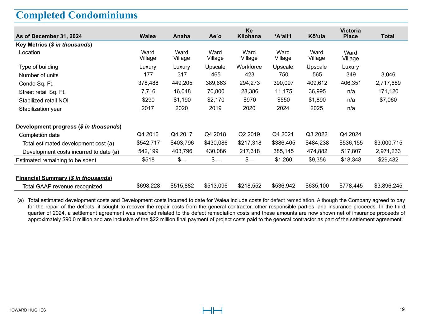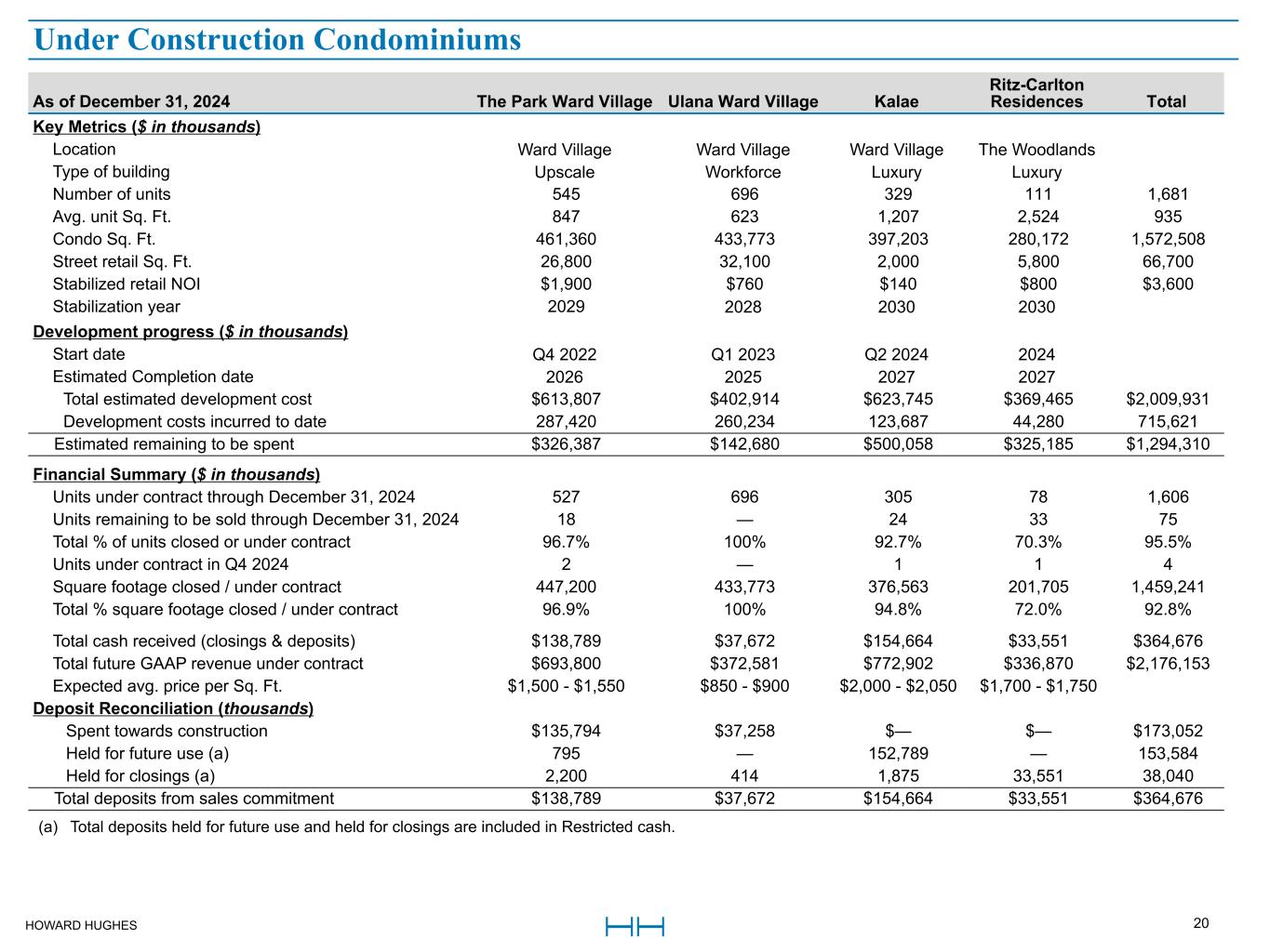 HOWARD HUGHES 19 As of December 31, 2024 Waiea Anaha Ae`o Ke Kilohana ‘A‘ali‘i Kō'ula Victoria Place Total Key Metrics ($ in thousands) Location Ward Village Ward Village Ward Village Ward Village Ward Village Ward Village Ward Village Type of building Luxury Luxury Upscale Workforce Upscale Upscale Luxury Number of units 177 317 465 423 750 565 349 3,046 Condo Sq. Ft. 378,488 449,205 389,663 294,273 390,097 409,612 406,351 2,717,689 Street retail Sq. Ft. 7,716 16,048 70,800 28,386 11,175 36,995 n/a 171,120 Stabilized retail NOI $290 $1,190 $2,170 $970 $550 $1,890 n/a $7,060 Stabilization year 2017 2020 2019 2020 2024 2025 n/a Development progress ($ in thousands) Completion date Q4 2016 Q4 2017 Q4 2018 Q2 2019 Q4 2021 Q3 2022 Q4 2024 Total estimated development cost (a) $542,717 $403,796 $430,086 $217,318 $386,405 $484,238 $536,155 $3,000,715 Development costs incurred to date (a) 542,199 403,796 430,086 217,318 385,145 474,882 517,807 2,971,233 Estimated remaining to be spent $518 $— $— $— $1,260 $9,356 $18,348 $29,482 Financial Summary ($ in thousands) Total GAAP revenue recognized $698,228 $515,882 $513,096 $218,552 $536,942 $635,100 $778,445 $3,896,245 Completed Condominiums (a) Total estimated development costs and Development costs incurred to date for Waiea include costs for defect remediation. Although the Company agreed to pay for the repair of the defects, it sought to recover the repair costs from the general contractor, other responsible parties, and insurance proceeds. In the third quarter of 2024, a settlement agreement was reached related to the defect remediation costs and these amounts are now shown net of insurance proceeds of approximately $90.0 million and are inclusive of the $22 million final payment of project costs paid to the general contractor as part of the settlement agreement.