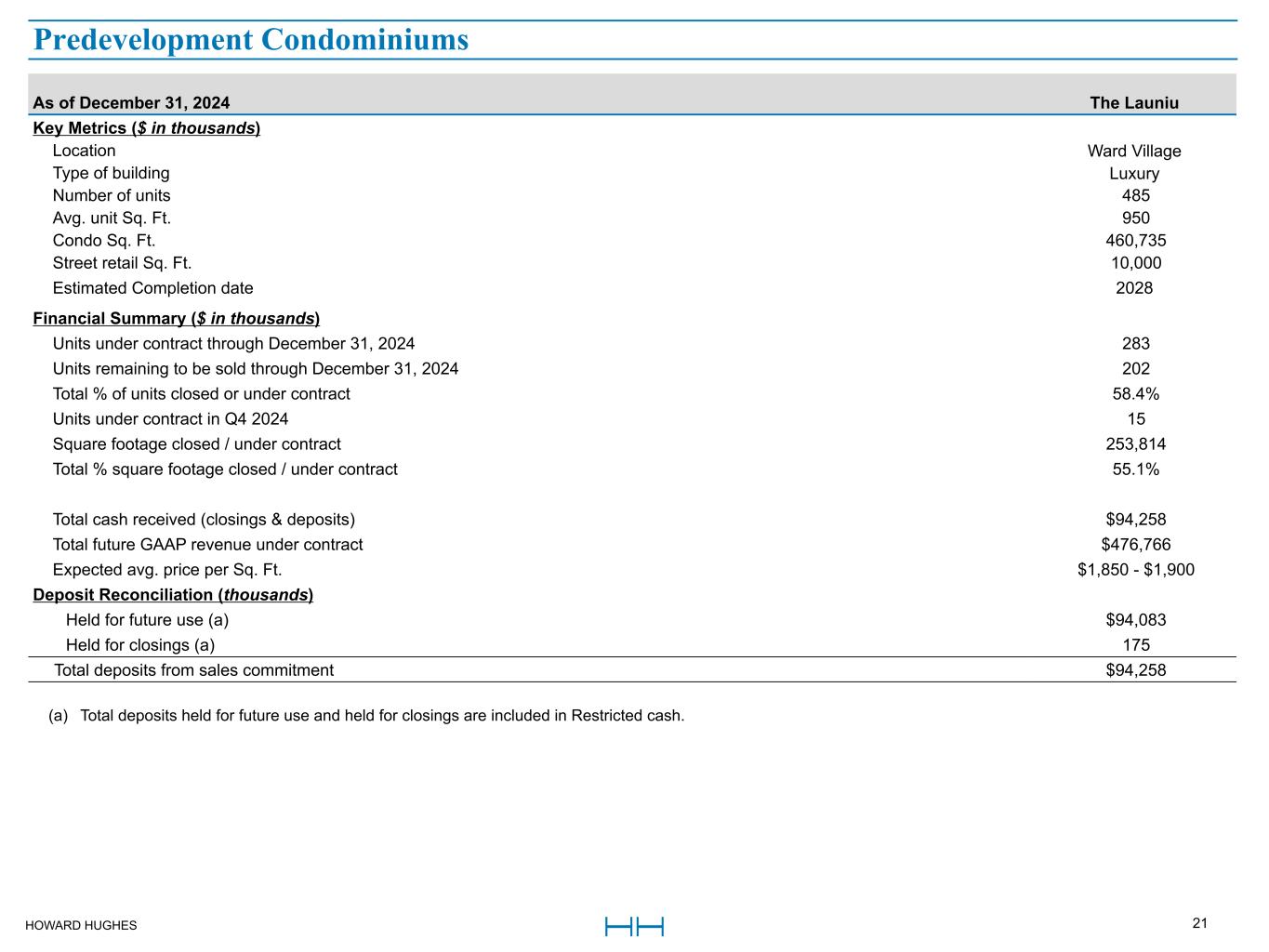HOWARD HUGHES 20 As of December 31, 2024 The Park Ward Village Ulana Ward Village Kalae Ritz-Carlton Residences Total Key Metrics ($ in thousands) Location Ward Village Ward Village Ward Village The Woodlands Type of building Upscale Workforce Luxury Luxury Number of units 545 696 329 111 1,681 Avg. unit Sq. Ft. 847 623 1,207 2,524 935 Condo Sq. Ft. 461,360 433,773 397,203 280,172 1,572,508 Street retail Sq. Ft. 26,800 32,100 2,000 5,800 66,700 Stabilized retail NOI $1,900 $760 $140 $800 $3,600 Stabilization year 2029 2028 2030 2030 Development progress ($ in thousands) Start date Q4 2022 Q1 2023 Q2 2024 2024 Estimated Completion date 2026 2025 2027 2027 Total estimated development cost $613,807 $402,914 $623,745 $369,465 $2,009,931 Development costs incurred to date 287,420 260,234 123,687 44,280 715,621 Estimated remaining to be spent $326,387 $142,680 $500,058 $325,185 $1,294,310 Financial Summary ($ in thousands) Units under contract through December 31, 2024 527 696 305 78 1,606 Units remaining to be sold through December 31, 2024 18 — 24 33 75 Total % of units closed or under contract 96.7% 100% 92.7% 70.3% 95.5% Units under contract in Q4 2024 2 — 1 1 4 Square footage closed / under contract 447,200 433,773 376,563 201,705 1,459,241 Total % square footage closed / under contract 96.9% 100% 94.8% 72.0% 92.8% Total cash received (closings & deposits) $138,789 $37,672 $154,664 $33,551 $364,676 Total future GAAP revenue under contract $693,800 $372,581 $772,902 $336,870 $2,176,153 Expected avg. price per Sq. Ft. $1,500 - $1,550 $850 - $900 $2,000 - $2,050 $1,700 - $1,750 Deposit Reconciliation (thousands) Spent towards construction $135,794 $37,258 $— $— $173,052 Held for future use (a) 795 — 152,789 — 153,584 Held for closings (a) 2,200 414 1,875 33,551 38,040 Total deposits from sales commitment $138,789 $37,672 $154,664 $33,551 $364,676 (a) Total deposits held for future use and held for closings are included in Restricted cash. Under Construction Condominiums