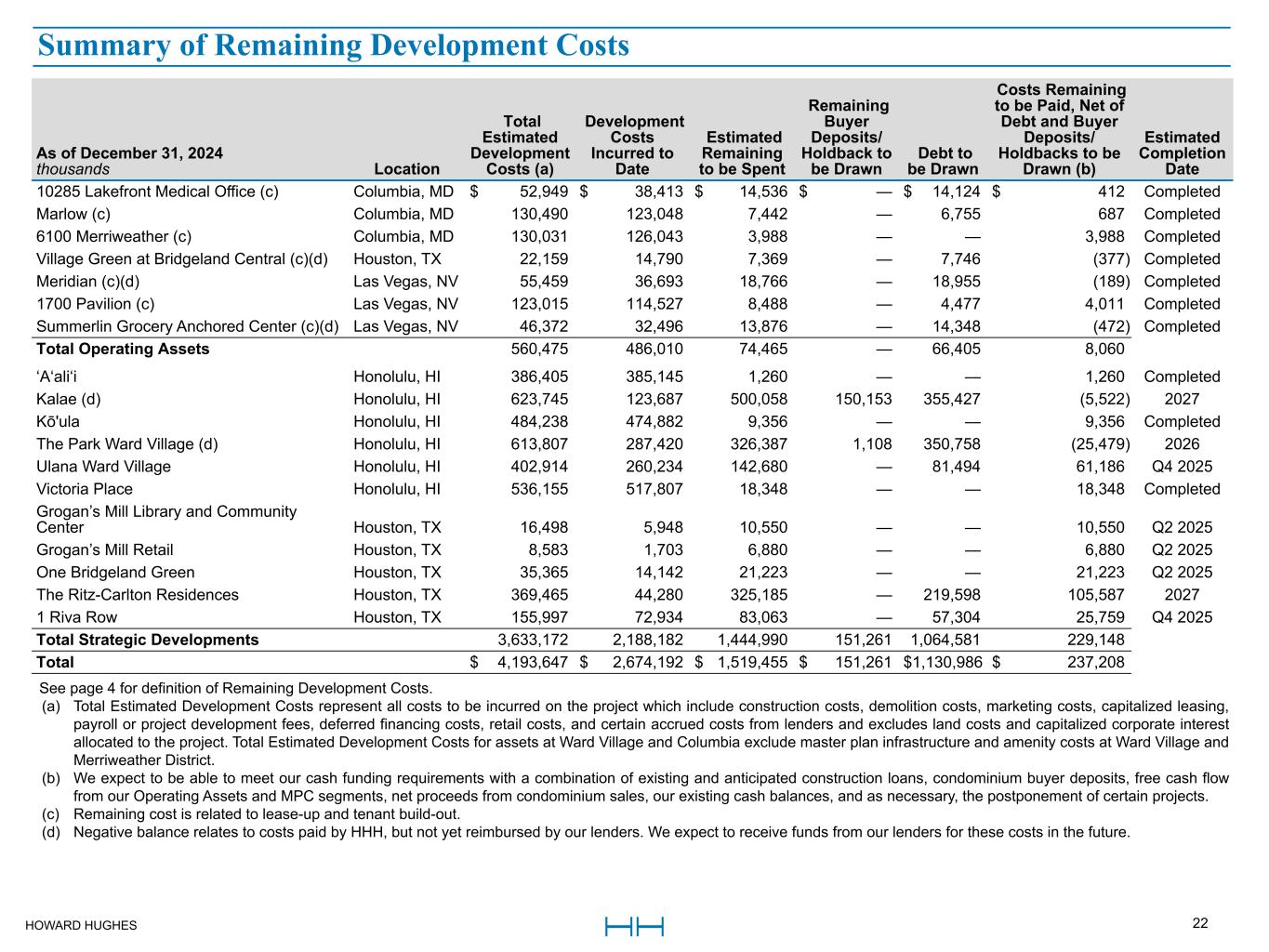HOWARD HUGHES 22 As of December 31, 2024 thousands Location Total Estimated Development Costs (a) Development Costs Incurred to Date Estimated Remaining to be Spent Remaining Buyer Deposits/ Holdback to be Drawn Debt to be Drawn Costs Remaining to be Paid, Net of Debt and Buyer Deposits/ Holdbacks to be Drawn (b) Estimated Completion Date 10285 Lakefront Medical Office (c) Columbia, MD $ 52,949 $ 38,413 $ 14,536 $ — $ 14,124 $ 412 Completed Marlow (c) Columbia, MD 130,490 123,048 7,442 — 6,755 687 Completed 6100 Merriweather (c) Columbia, MD 130,031 126,043 3,988 — — 3,988 Completed Village Green at Bridgeland Central (c)(d) Houston, TX 22,159 14,790 7,369 — 7,746 (377) Completed Meridian (c)(d) Las Vegas, NV 55,459 36,693 18,766 — 18,955 (189) Completed 1700 Pavilion (c) Las Vegas, NV 123,015 114,527 8,488 — 4,477 4,011 Completed Summerlin Grocery Anchored Center (c)(d) Las Vegas, NV 46,372 32,496 13,876 — 14,348 (472) Completed Total Operating Assets 560,475 486,010 74,465 — 66,405 8,060 ‘A‘ali‘i Honolulu, HI 386,405 385,145 1,260 — — 1,260 Completed Kalae (d) Honolulu, HI 623,745 123,687 500,058 150,153 355,427 (5,522) 2027 Kō'ula Honolulu, HI 484,238 474,882 9,356 — — 9,356 Completed The Park Ward Village (d) Honolulu, HI 613,807 287,420 326,387 1,108 350,758 (25,479) 2026 Ulana Ward Village Honolulu, HI 402,914 260,234 142,680 — 81,494 61,186 Q4 2025 Victoria Place Honolulu, HI 536,155 517,807 18,348 — — 18,348 Completed Grogan’s Mill Library and Community Center Houston, TX 16,498 5,948 10,550 — — 10,550 Q2 2025 Grogan’s Mill Retail Houston, TX 8,583 1,703 6,880 — — 6,880 Q2 2025 One Bridgeland Green Houston, TX 35,365 14,142 21,223 — — 21,223 Q2 2025 The Ritz-Carlton Residences Houston, TX 369,465 44,280 325,185 — 219,598 105,587 2027 1 Riva Row Houston, TX 155,997 72,934 83,063 — 57,304 25,759 Q4 2025 Total Strategic Developments 3,633,172 2,188,182 1,444,990 151,261 1,064,581 229,148 Total $ 4,193,647 $ 2,674,192 $ 1,519,455 $ 151,261 $ 1,130,986 $ 237,208 See page 4 for definition of Remaining Development Costs. (a) Total Estimated Development Costs represent all costs to be incurred on the project which include construction costs, demolition costs, marketing costs, capitalized leasing, payroll or project development fees, deferred financing costs, retail costs, and certain accrued costs from lenders and excludes land costs and capitalized corporate interest allocated to the project. Total Estimated Development Costs for assets at Ward Village and Columbia exclude master plan infrastructure and amenity costs at Ward Village and Merriweather District. (b) We expect to be able to meet our cash funding requirements with a combination of existing and anticipated construction loans, condominium buyer deposits, free cash flow from our Operating Assets and MPC segments, net proceeds from condominium sales, our existing cash balances, and as necessary, the postponement of certain projects. (c) Remaining cost is related to lease-up and tenant build-out. (d) Negative balance relates to costs paid by HHH, but not yet reimbursed by our lenders. We expect to receive funds from our lenders for these costs in the future. Summary of Remaining Development Costs