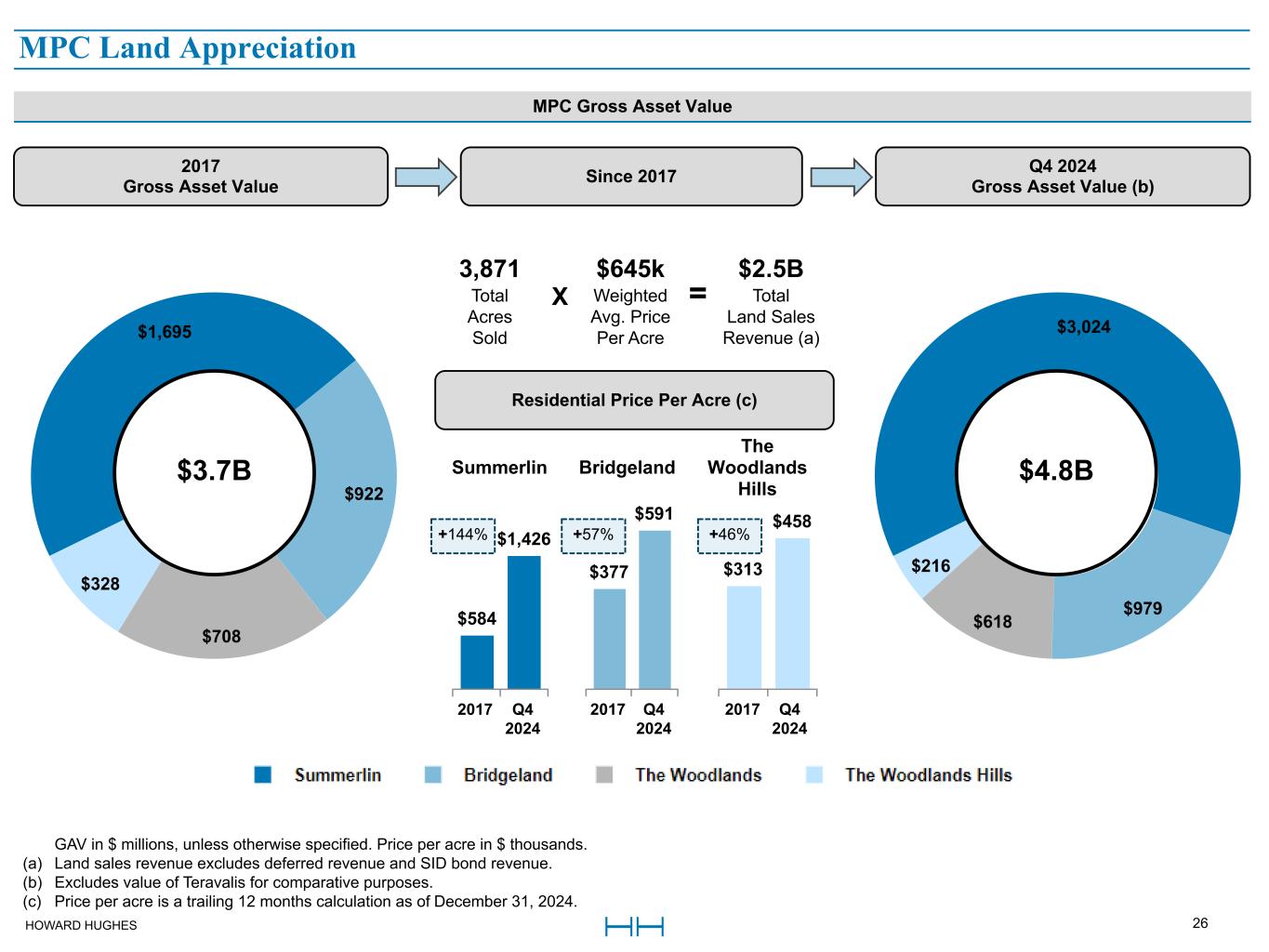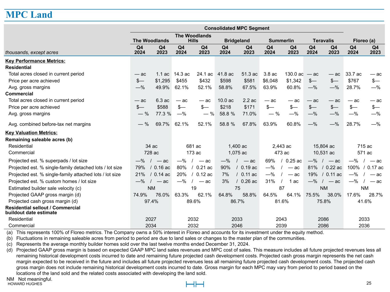 HOWARD HUGHES 25 Master Planned Community Land Consolidated MPC Segment The Woodlands The Woodlands Hills Bridgeland Summerlin Teravalis Floreo (a) thousands, except acres Q4 2024 Q4 2023 Q4 2024 Q4 2023 Q4 2024 Q4 2023 Q4 2024 Q4 2023 Q4 2024 Q4 2023 Q4 2024 Q4 2023 Key Performance Metrics: Residential Total acres closed in current period — ac 1.1 ac 14.3 ac 24.1 ac 41.8 ac 51.3 ac 3.8 ac 130.0 ac — ac — ac 33.7 ac — ac Price per acre achieved $— $1,295 $455 $432 $598 $581 $6,048 $1,342 $— $— $767 $— Avg. gross margins —% 49.9% 62.1% 52.1% 58.8% 67.5% 63.9% 60.8% —% —% 28.7% —% Commercial Total acres closed in current period — ac 6.3 ac — ac — ac 10.0 ac 2.2 ac — ac — ac — ac — ac — ac — ac Price per acre achieved $— $588 $— $— $218 $171 $— $— $— $— $— $— Avg. gross margins — % 77.3 % —% — % 58.8 % 71.0% — % —% —% —% —% —% Avg. combined before-tax net margins — % 69.7% 62.1% 52.1% 58.8 % 67.8% 63.9% 60.8% —% —% 28.7% —% Key Valuation Metrics: Remaining saleable acres (b) Residential 34 ac 681 ac 1,400 ac 2,443 ac 15,804 ac 715 ac Commercial 728 ac 173 ac 1,075 ac 473 ac 10,531 ac 571 ac Projected est. % superpads / lot size —% / — ac —% / — ac —% / — ac 69% / 0.25 ac —% / — ac —% / — ac Projected est. % single-family detached lots / lot size 79% / 0.16 ac 80% / 0.21 ac 90% / 0.19 ac —% / — ac 81% / 0.22 ac 100% / 0.17 ac Projected est. % single-family attached lots / lot size 21% / 0.14 ac 20% / 0.12 ac 7% / 0.11 ac —% / — ac 19% / 0.11 ac —% / — ac Projected est. % custom homes / lot size —% / — ac —% / — ac 3% / 0.26 ac 31% / 1 ac —% / — ac —% / — ac Estimated builder sale velocity (c) NM 19 75 87 NM NM Projected GAAP gross margin (d) 74.9% 76.0% 63.3% 62.1% 64.8% 58.8% 64.5% 64.1% 75.5% 38.0% 17.6% 28.7% Projected cash gross margin (d) 97.4% 89.6% 86.7% 81.6% 75.8% 41.6% Residential sellout / Commercial buildout date estimate Residential 2027 2032 2033 2043 2086 2033 Commercial 2034 2032 2046 2039 2086 2036 (a) This represents 100% of Floreo metrics. The Company owns a 50% interest in Floreo and accounts for its investment under the equity method. (b) Fluctuations in remaining saleable acres from period to period are due to land sales or changes to the master plan of the communities. (c) Represents the average monthly builder homes sold over the last twelve months ended December 31, 2024. (d) Projected GAAP gross margin is based on expected GAAP MPC land sales revenues and MPC cost of sales. This measure includes all future projected revenues less all remaining historical development costs incurred to date and remaining future projected cash development costs. Projected cash gross margin represents the net cash margin expected to be received in the future and includes all future projected revenues less all remaining future projected cash development costs. The projected cash gross margin does not include remaining historical development costs incurred to date. Gross margin for each MPC may vary from period to period based on the locations of the land sold and the related costs associated with developing the land sold. NM Not meaningful. MPC Land