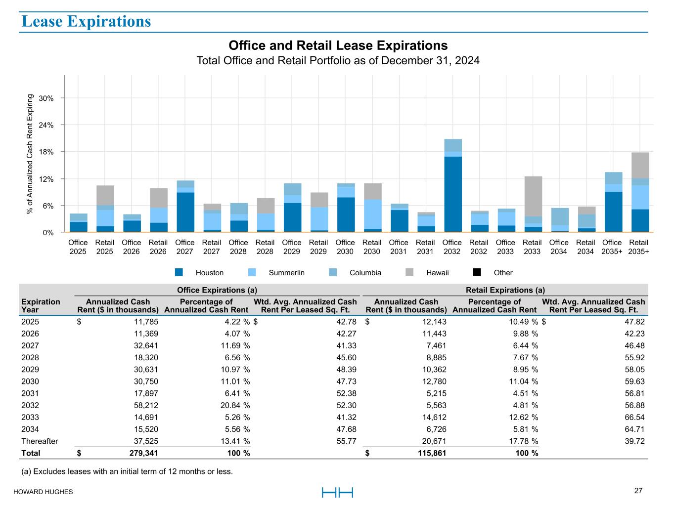 HOWARD HUGHES 27 Office Expirations (a) Retail Expirations (a) Expiration Year Annualized Cash Rent ($ in thousands) Percentage of Annualized Cash Rent Wtd. Avg. Annualized Cash Rent Per Leased Sq. Ft. Annualized Cash Rent ($ in thousands) Percentage of Annualized Cash Rent Wtd. Avg. Annualized Cash Rent Per Leased Sq. Ft. 2025 $ 11,785 4.22 % $ 42.78 $ 12,143 10.49 % $ 47.82 2026 11,369 4.07 % 42.27 11,443 9.88 % 42.23 2027 32,641 11.69 % 41.33 7,461 6.44 % 46.48 2028 18,320 6.56 % 45.60 8,885 7.67 % 55.92 2029 30,631 10.97 % 48.39 10,362 8.95 % 58.05 2030 30,750 11.01 % 47.73 12,780 11.04 % 59.63 2031 17,897 6.41 % 52.38 5,215 4.51 % 56.81 2032 58,212 20.84 % 52.30 5,563 4.81 % 56.88 2033 14,691 5.26 % 41.32 14,612 12.62 % 66.54 2034 15,520 5.56 % 47.68 6,726 5.81 % 64.71 Thereafter 37,525 13.41 % 55.77 20,671 17.78 % 39.72 Total $ 279,341 100 % $ 115,861 100 % (a) Excludes leases with an initial term of 12 months or less. Office and Retail Lease Expirations Total Office and Retail Portfolio as of December 31, 2024 % o f A nn ua liz ed C as h R en t E xp iri ng Houston Summerlin Columbia Hawaii Other Office 2025 Retail 2025 Office 2026 Retail 2026 Office 2027 Retail 2027 Office 2028 Retail 2028 Office 2029 Retail 2029 Office 2030 Retail 2030 Office 2031 Retail 2031 Office 2032 Retail 2032 Office 2033 Retail 2033 Office 2034 Retail 2034 Office 2035+ Retail 2035+ 0% 6% 12% 18% 24% 30% Lease Expirations