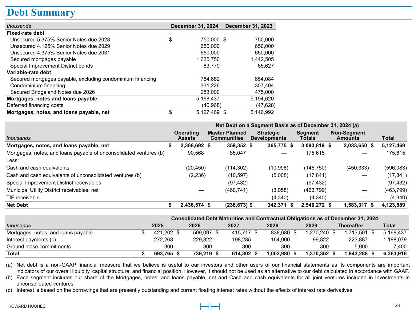 HOWARD HUGHES 28 thousands December 31, 2024 December 31, 2023 Fixed-rate debt Unsecured 5.375% Senior Notes due 2028 $ 750,000 $ 750,000 Unsecured 4.125% Senior Notes due 2029 650,000 650,000 Unsecured 4.375% Senior Notes due 2031 650,000 650,000 Secured mortgages payable 1,635,750 1,442,505 Special Improvement District bonds 83,779 65,627 Variable-rate debt Secured mortgages payable, excluding condominium financing 784,682 854,084 Condominium financing 331,226 307,404 Secured Bridgeland Notes due 2026 283,000 475,000 Mortgages, notes and loans payable 5,168,437 5,194,620 Deferred financing costs (40,968) (47,628) Mortgages, notes, and loans payable, net $ 5,127,469 $ 5,146,992 Net Debt on a Segment Basis as of December 31, 2024 (a) thousands Operating Assets Master Planned Communities Strategic Developments Segment Totals Non-Segment Amounts Total Mortgages, notes, and loans payable, net $ 2,368,692 $ 359,352 $ 365,775 $ 3,093,819 $ 2,033,650 $ 5,127,469 Mortgages, notes, and loans payable of unconsolidated ventures (b) 90,568 85,047 — 175,615 — 175,615 Less: Cash and cash equivalents (20,450) (114,302) (10,998) (145,750) (450,333) (596,083) Cash and cash equivalents of unconsolidated ventures (b) (2,236) (10,597) (5,008) (17,841) — (17,841) Special Improvement District receivables — (97,432) — (97,432) — (97,432) Municipal Utility District receivables, net — (460,741) (3,058) (463,799) — (463,799) TIF receivable — — (4,340) (4,340) — (4,340) Net Debt $ 2,436,574 $ (238,673) $ 342,371 $ 2,540,272 $ 1,583,317 $ 4,123,589 Consolidated Debt Maturities and Contractual Obligations as of December 31, 2024 thousands 2025 2026 2027 2028 2029 Thereafter Total Mortgages, notes, and loans payable $ 421,202 $ 509,097 $ 415,717 $ 838,680 $ 1,270,240 $ 1,713,501 $ 5,168,437 Interest payments (c) 272,263 229,822 198,285 164,000 99,822 223,887 1,188,079 Ground lease commitments 300 300 300 300 300 5,900 7,400 Total $ 693,765 $ 739,219 $ 614,302 $ 1,002,980 $ 1,370,362 $ 1,943,288 $ 6,363,916 Debt Summary (a) Net debt is a non-GAAP financial measure that we believe is useful to our investors and other users of our financial statements as its components are important indicators of our overall liquidity, capital structure, and financial position. However, it should not be used as an alternative to our debt calculated in accordance with GAAP. (b) Each segment includes our share of the Mortgages, notes, and loans payable, net and Cash and cash equivalents for all joint ventures included in Investments in unconsolidated ventures. (c) Interest is based on the borrowings that are presently outstanding and current floating interest rates without the effects of interest rate derivatives. Debt Summary