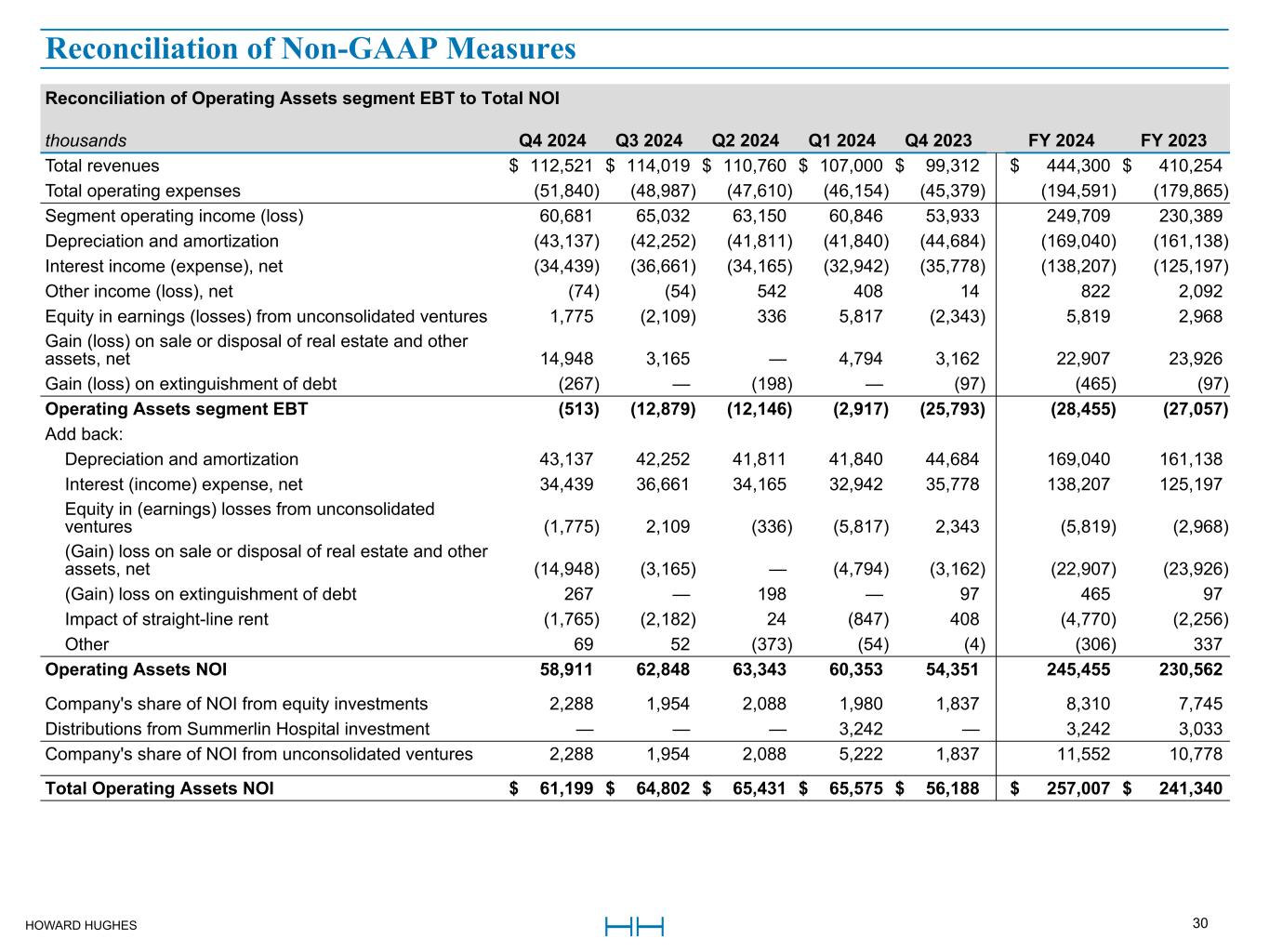 HOWARD HUGHES 30 Reconciliation of Operating Assets segment EBT to Total NOI thousands Q4 2024 Q3 2024 Q2 2024 Q1 2024 Q4 2023 FY 2024 FY 2023 Total revenues $ 112,521 $ 114,019 $ 110,760 $ 107,000 $ 99,312 $ 444,300 $ 410,254 Total operating expenses (51,840) (48,987) (47,610) (46,154) (45,379) (194,591) (179,865) Segment operating income (loss) 60,681 65,032 63,150 60,846 53,933 249,709 230,389 Depreciation and amortization (43,137) (42,252) (41,811) (41,840) (44,684) (169,040) (161,138) Interest income (expense), net (34,439) (36,661) (34,165) (32,942) (35,778) (138,207) (125,197) Other income (loss), net (74) (54) 542 408 14 822 2,092 Equity in earnings (losses) from unconsolidated ventures 1,775 (2,109) 336 5,817 (2,343) 5,819 2,968 Gain (loss) on sale or disposal of real estate and other assets, net 14,948 3,165 — 4,794 3,162 22,907 23,926 Gain (loss) on extinguishment of debt (267) — (198) — (97) (465) (97) Operating Assets segment EBT (513) (12,879) (12,146) (2,917) (25,793) (28,455) (27,057) Add back: Depreciation and amortization 43,137 42,252 41,811 41,840 44,684 169,040 161,138 Interest (income) expense, net 34,439 36,661 34,165 32,942 35,778 138,207 125,197 Equity in (earnings) losses from unconsolidated ventures (1,775) 2,109 (336) (5,817) 2,343 (5,819) (2,968) (Gain) loss on sale or disposal of real estate and other assets, net (14,948) (3,165) — (4,794) (3,162) (22,907) (23,926) (Gain) loss on extinguishment of debt 267 — 198 — 97 465 97 Impact of straight-line rent (1,765) (2,182) 24 (847) 408 (4,770) (2,256) Other 69 52 (373) (54) (4) (306) 337 Operating Assets NOI 58,911 62,848 63,343 60,353 54,351 245,455 230,562 Company's share of NOI from equity investments 2,288 1,954 2,088 1,980 1,837 8,310 7,745 Distributions from Summerlin Hospital investment — — — 3,242 — 3,242 3,033 Company's share of NOI from unconsolidated ventures 2,288 1,954 2,088 5,222 1,837 11,552 10,778 Total Operating Assets NOI $ 61,199 $ 64,802 $ 65,431 $ 65,575 $ 56,188 $ 257,007 $ 241,340 Reconciliation of Non-GAAP Measures