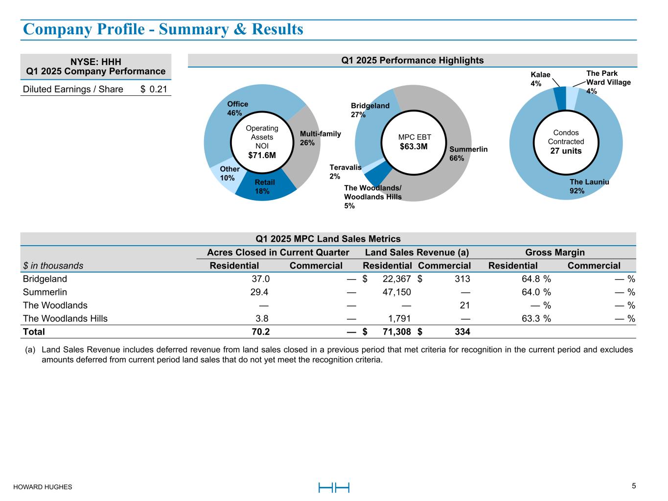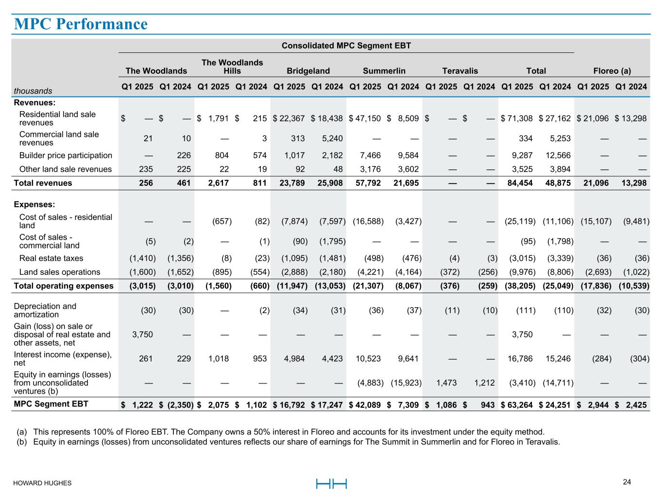 HOWARD HUGHES 24 Master Planned Community Land Consolidated MPC Segment EBT The Woodlands The Woodlands Hills Bridgeland Summerlin Teravalis Total Floreo (a) thousands Q1 2025 Q1 2024 Q1 2025 Q1 2024 Q1 2025 Q1 2024 Q1 2025 Q1 2024 Q1 2025 Q1 2024 Q1 2025 Q1 2024 Q1 2025 Q1 2024 Revenues: Residential land sale revenues $ — $ — $ 1,791 $ 215 $ 22,367 $ 18,438 $ 47,150 $ 8,509 $ — $ — $ 71,308 $ 27,162 $ 21,096 $ 13,298 Commercial land sale revenues 21 10 — 3 313 5,240 — — — — 334 5,253 — — Builder price participation — 226 804 574 1,017 2,182 7,466 9,584 — — 9,287 12,566 — — Other land sale revenues 235 225 22 19 92 48 3,176 3,602 — — 3,525 3,894 — — Total revenues 256 461 2,617 811 23,789 25,908 57,792 21,695 — — 84,454 48,875 21,096 13,298 Expenses: Cost of sales - residential land — — (657) (82) (7,874) (7,597) (16,588) (3,427) — — (25,119) (11,106) (15,107) (9,481) Cost of sales - commercial land (5) (2) — (1) (90) (1,795) — — — — (95) (1,798) — — Real estate taxes (1,410) (1,356) (8) (23) (1,095) (1,481) (498) (476) (4) (3) (3,015) (3,339) (36) (36) Land sales operations (1,600) (1,652) (895) (554) (2,888) (2,180) (4,221) (4,164) (372) (256) (9,976) (8,806) (2,693) (1,022) Total operating expenses (3,015) (3,010) (1,560) (660) (11,947) (13,053) (21,307) (8,067) (376) (259) (38,205) (25,049) (17,836) (10,539) Depreciation and amortization (30) (30) — (2) (34) (31) (36) (37) (11) (10) (111) (110) (32) (30) Gain (loss) on sale or disposal of real estate and other assets, net 3,750 — — — — — — — — — 3,750 — — — Interest income (expense), net 261 229 1,018 953 4,984 4,423 10,523 9,641 — — 16,786 15,246 (284) (304) Equity in earnings (losses) from unconsolidated ventures (b) — — — — — — (4,883) (15,923) 1,473 1,212 (3,410) (14,711) — — MPC Segment EBT $ 1,222 $ (2,350) $ 2,075 $ 1,102 $ 16,792 $ 17,247 $ 42,089 $ 7,309 $ 1,086 $ 943 $ 63,264 $ 24,251 $ 2,944 $ 2,425 (a) This represents 100% of Floreo EBT. The Company owns a 50% interest in Floreo and accounts for its investment under the equity method. (b) Equity in earnings (losses) from unconsolidated ventures reflects our share of earnings for The Summit in Summerlin and for Floreo in Teravalis. MPC Performance
