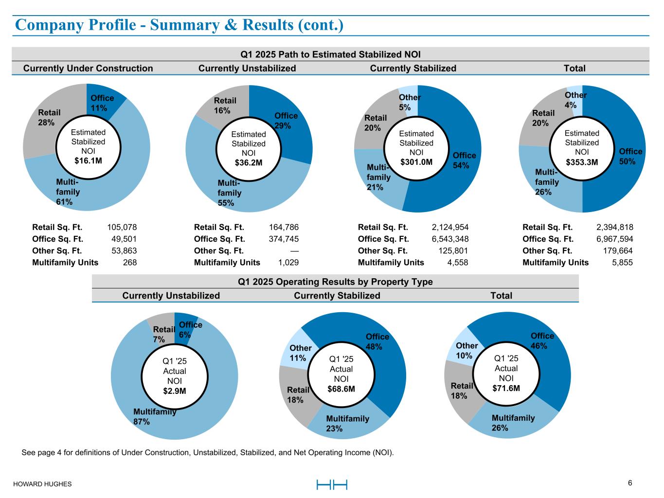 HOWARD HUGHES 4 Stabilized - Properties in the Operating Assets segment that have reached 90% occupancy or have been in service for 36 months or more, whichever occurs first. If an office, retail, or multifamily property has been in service for more than 36 months but does not exceed 90% occupancy, the asset is considered underperforming. Unstabilized - Properties in the Operating Assets segment that have been in service for less than 36 months and do not exceed 90% occupancy. Under Construction - Projects in the Strategic Developments segment for which construction has commenced as of March 31, 2025, unless otherwise noted. This excludes Master Planned Community (MPC) and condominium development. Net Operating Income (NOI) - We define net operating income (NOI) as operating revenues (rental income, tenant recoveries, and other revenues) less operating expenses (real estate taxes, repairs and maintenance, marketing, and other property expenses). NOI excludes straight-line rents and amortization of tenant incentives, net; interest expense, net; ground rent amortization; demolition costs; other income (loss); depreciation and amortization; development-related marketing costs; gain on sale or disposal of real estate and other assets, net; loss on extinguishment of debt; provision for impairment; and equity in earnings from unconsolidated ventures. We use NOI to evaluate our operating performance on a property-by-property basis because NOI allows us to evaluate the impact that property-specific factor, such as lease structure, lease rates, and tenant bases, have on our operating results, gross margins, and investment returns. We believe that NOI is a useful supplemental measure of the performance of our Operating Assets segment because it provides a performance measure that, when compared year over year, reflects the revenues and expenses directly associated with owning and operating real estate properties and the impact on operations from trends in rental and occupancy rates and operating costs. This amount is presented as Operating Assets NOI throughout this document. In-Place NOI - We define In-Place NOI as forecasted current year NOI, excluding certain items affecting comparability to Estimated Stabilized NOI, such as non-recurring items and other items not indicative of stabilized operations, for all properties included in the Operating Assets segment as of the end of the current period. Total Operating Assets NOI - This term represents NOI as defined above with the addition of our share of NOI from unconsolidated ventures. Estimated Stabilized NOI - Estimated Stabilized NOI is an asset's potential annual NOI. This measure is initially projected prior to the development of the asset based on market assumptions and is revised over the life of the asset as market conditions evolve. On a quarterly basis, each asset’s In-Place NOI is compared to its Estimated Stabilized NOI in conjunction with forecast data to determine if an adjustment is needed. Adjustments are made when changes to the asset's long-term performance are thought to be more than likely and permanent. Remaining Development Costs - Development costs and related debt held for projects that are under construction or substantially complete and in service in the Operating Assets segment are disclosed on the Summary of Remaining Development Costs slide if the project has more than $1.0 million of estimated costs remaining to be incurred. The total estimated costs and costs paid are prepared on a cash basis to reflect the total anticipated cash requirements for the projects. Projects not yet under construction are not included. Same Store Properties - The Company defines Same Store Properties as consolidated and unconsolidated properties that are acquired or placed in service prior to the beginning of the earliest period presented and owned by the Company through the end of the latest period presented. Same Store Properties exclude properties placed in service, acquired, repositioned, or in development or redevelopment after the beginning of the earliest period presented or disposed of prior to the end of the latest period presented. Accordingly, it takes at least one year and one quarter after a property is acquired or treated as in service for that property to be included in Same Store Properties. Same Store NOI - We calculate Same Store Net Operating Income (Same Store NOI) as Operating Assets NOI applicable to consolidated properties acquired or placed in service prior to the beginning of the earliest period presented and owned by the Company through the end of the latest period presented. Same Store NOI also includes the Company's share of NOI from unconsolidated ventures and the annual distribution from a cost basis investment. Same Store NOI is a non-GAAP financial measure and should not be viewed as an alternative to net income calculated in accordance with GAAP as a measurement of our operating performance. We believe that Same Store NOI is helpful to investors as a supplemental comparative performance measure of the income generated from the same group of properties from one period to the next. Other companies may not define Same Store NOI in the same manner as we do; therefore, our computation of Same Store NOI may not be comparable to that of other companies. Additionally, we do not control investments in unconsolidated properties, and while we consider disclosures of our share of NOI to be useful, they may not accurately depict the legal and economic implications of our investment arrangements. DefinitionsDefinitions