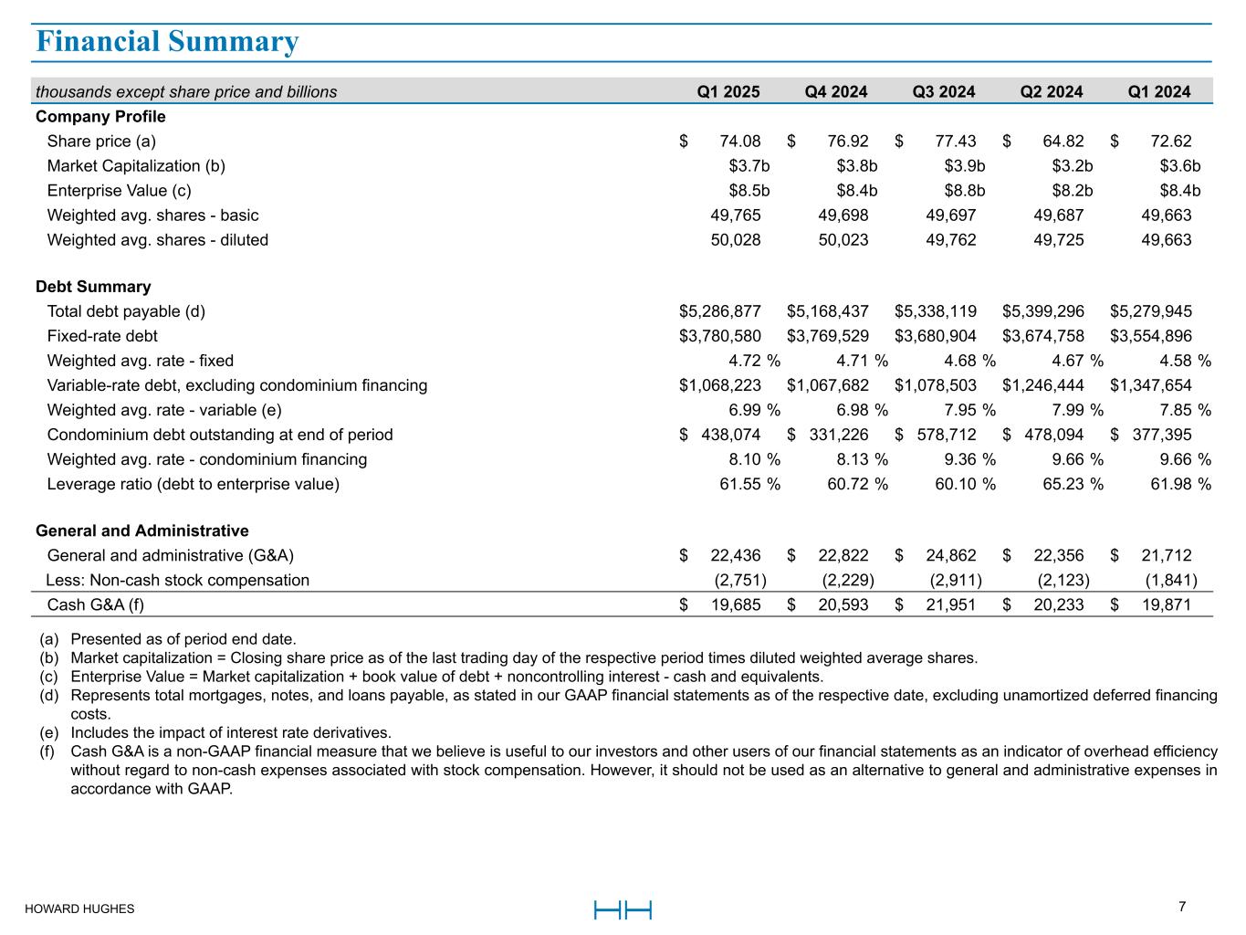 HOWARD HUGHES 7 thousands except share price and billions Q1 2025 Q4 2024 Q3 2024 Q2 2024 Q1 2024 Company Profile Share price (a) $ 74.08 $ 76.92 $ 77.43 $ 64.82 $ 72.62 Market Capitalization (b) $3.7b $3.8b $3.9b $3.2b $3.6b Enterprise Value (c) $8.5b $8.4b $8.8b $8.2b $8.4b Weighted avg. shares - basic 49,765 49,698 49,697 49,687 49,663 Weighted avg. shares - diluted 50,028 50,023 49,762 49,725 49,663 Debt Summary Total debt payable (d) $ 5,286,877 $ 5,168,437 $ 5,338,119 $ 5,399,296 $ 5,279,945 Fixed-rate debt $ 3,780,580 $ 3,769,529 $ 3,680,904 $ 3,674,758 $ 3,554,896 Weighted avg. rate - fixed 4.72 % 4.71 % 4.68 % 4.67 % 4.58 % Variable-rate debt, excluding condominium financing $ 1,068,223 $ 1,067,682 $ 1,078,503 $ 1,246,444 $ 1,347,654 Weighted avg. rate - variable (e) 6.99 % 6.98 % 7.95 % 7.99 % 7.85 % Condominium debt outstanding at end of period $ 438,074 $ 331,226 $ 578,712 $ 478,094 $ 377,395 Weighted avg. rate - condominium financing 8.10 % 8.13 % 9.36 % 9.66 % 9.66 % Leverage ratio (debt to enterprise value) 61.55 % 60.72 % 60.10 % 65.23 % 61.98 % General and Administrative General and administrative (G&A) $ 22,436 $ 22,822 $ 24,862 $ 22,356 $ 21,712 Less: Non-cash stock compensation (2,751) (2,229) (2,911) (2,123) (1,841) Cash G&A (f) $ 19,685 $ 20,593 $ 21,951 $ 20,233 $ 19,871 Financial Summary (a) Presented as of period end date. (b) Market capitalization = Closing share price as of the last trading day of the respective period times diluted weighted average shares. (c) Enterprise Value = Market capitalization + book value of debt + noncontrolling interest - cash and equivalents. (d) Represents total mortgages, notes, and loans payable, as stated in our GAAP financial statements as of the respective date, excluding unamortized deferred financing costs. (e) Includes the impact of interest rate derivatives. (f) Cash G&A is a non-GAAP financial measure that we believe is useful to our investors and other users of our financial statements as an indicator of overhead efficiency without regard to non-cash expenses associated with stock compensation. However, it should not be used as an alternative to general and administrative expenses in accordance with GAAP. Financial Summary