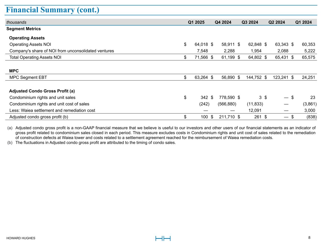 HOWARD HUGHES 8 Financial Summary (a) Adjusted condo gross profit is a non-GAAP financial measure that we believe is useful to our investors and other users of our financial statements as an indicator of gross profit related to condominium sales closed in each period. This measure excludes costs in Condominium rights and unit cost of sales related to the remediation of construction defects at Waiea tower and costs related to a settlement agreement reached for the reimbursement of Waiea remediation costs. (b) The fluctuations in Adjusted condo gross profit are attributed to the timing of condo sales. thousands Q1 2025 Q4 2024 Q3 2024 Q2 2024 Q1 2024 Segment Metrics Operating Assets Operating Assets NOI $ 64,018 $ 58,911 $ 62,848 $ 63,343 $ 60,353 Company's share of NOI from unconsolidated ventures 7,548 2,288 1,954 2,088 5,222 Total Operating Assets NOI $ 71,566 $ 61,199 $ 64,802 $ 65,431 $ 65,575 MPC MPC Segment EBT $ 63,264 $ 56,890 $ 144,752 $ 123,241 $ 24,251 Adjusted Condo Gross Profit (a) Condominium rights and unit sales $ 342 $ 778,590 $ 3 $ — $ 23 Condominium rights and unit cost of sales (242) (566,880) (11,833) — (3,861) Less: Waiea settlement and remediation cost — — 12,091 — 3,000 Adjusted condo gross profit (b) $ 100 $ 211,710 $ 261 $ — $ (838) Financial Summary (cont.)