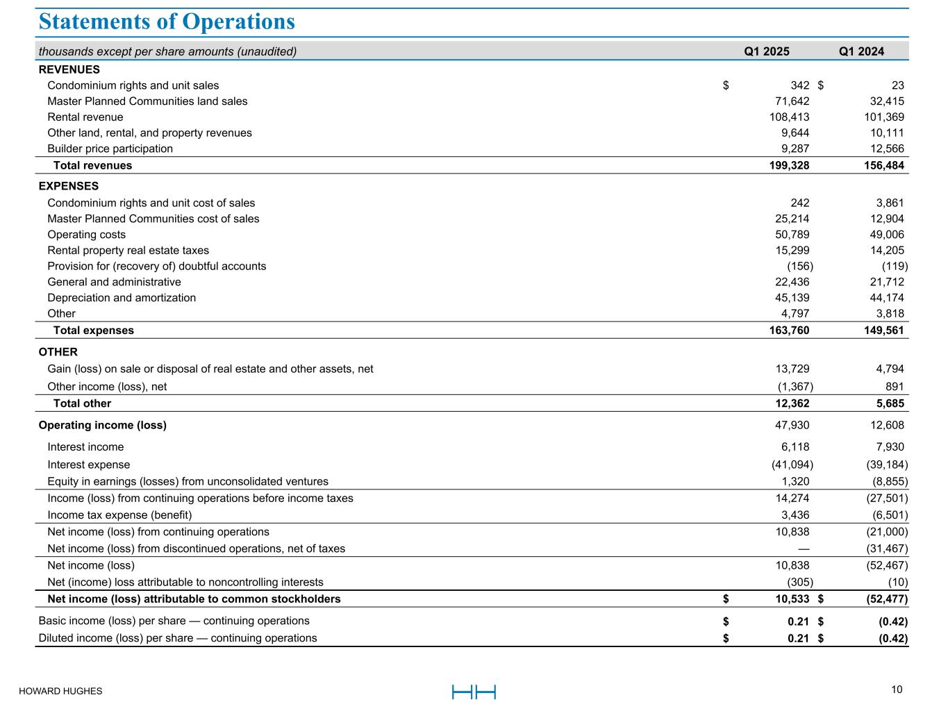 HOWARD HUGHES 10 thousands except per share amounts (unaudited) Q1 2025 Q1 2024 REVENUES Condominium rights and unit sales $ 342 $ 23 Master Planned Communities land sales 71,642 32,415 Rental revenue 108,413 101,369 Other land, rental, and property revenues 9,644 10,111 Builder price participation 9,287 12,566 Total revenues 199,328 156,484 EXPENSES Condominium rights and unit cost of sales 242 3,861 Master Planned Communities cost of sales 25,214 12,904 Operating costs 50,789 49,006 Rental property real estate taxes 15,299 14,205 Provision for (recovery of) doubtful accounts (156) (119) General and administrative 22,436 21,712 Depreciation and amortization 45,139 44,174 Other 4,797 3,818 Total expenses 163,760 149,561 OTHER Gain (loss) on sale or disposal of real estate and other assets, net 13,729 4,794 Other income (loss), net (1,367) 891 Total other 12,362 5,685 Operating income (loss) 47,930 12,608 Interest income 6,118 7,930 Interest expense (41,094) (39,184) Equity in earnings (losses) from unconsolidated ventures 1,320 (8,855) Income (loss) from continuing operations before income taxes 14,274 (27,501) Income tax expense (benefit) 3,436 (6,501) Net income (loss) from continuing operations 10,838 (21,000) Net income (loss) from discontinued operations, net of taxes — (31,467) Net income (loss) 10,838 (52,467) Net (income) loss attributable to noncontrolling interests (305) (10) Net income (loss) attributable to common stockholders $ 10,533 $ (52,477) Basic income (loss) per share — continuing operations $ 0.21 $ (0.42) Diluted income (loss) per share — continuing operations $ 0.21 $ (0.42) Statements of Operations