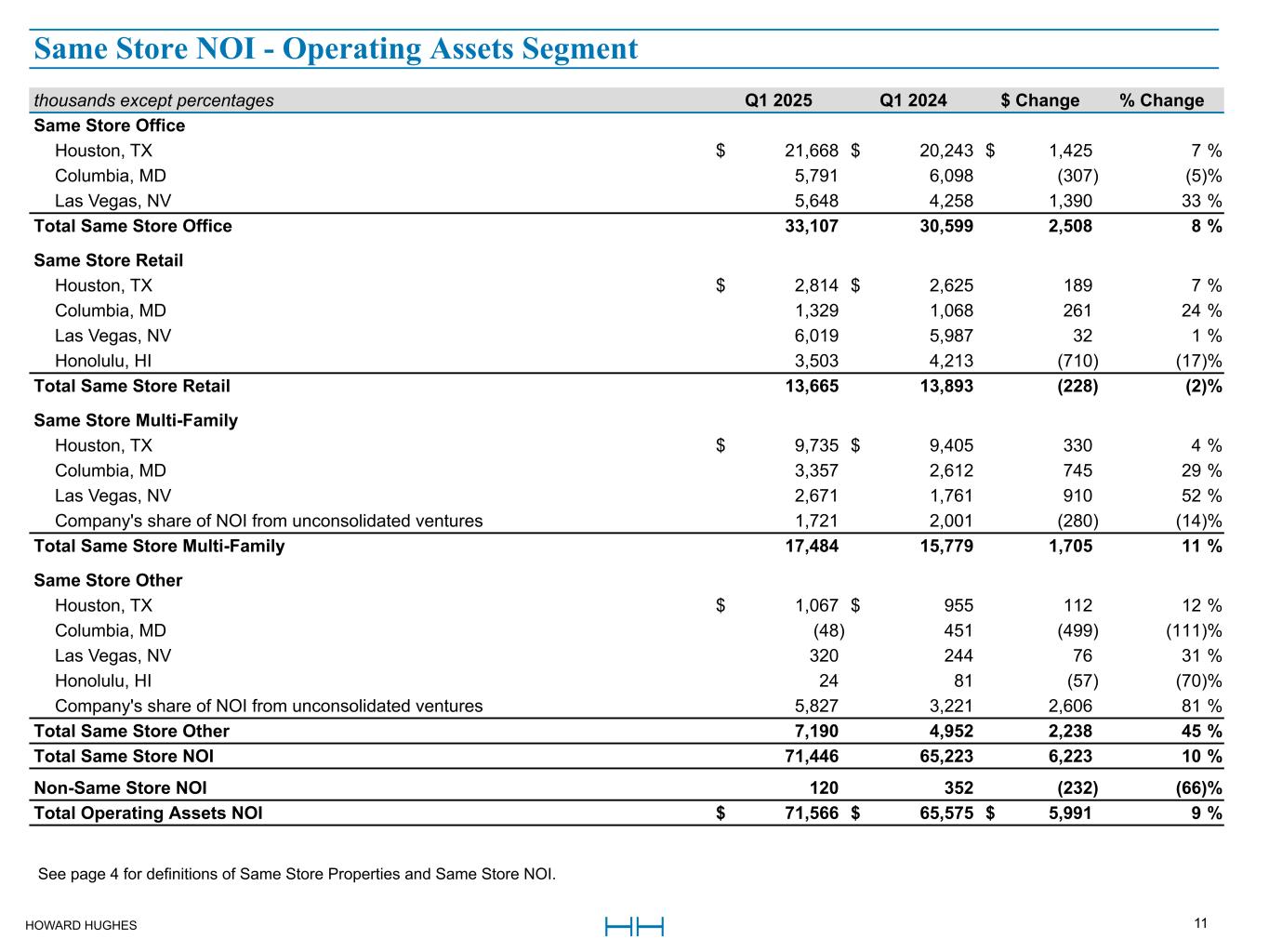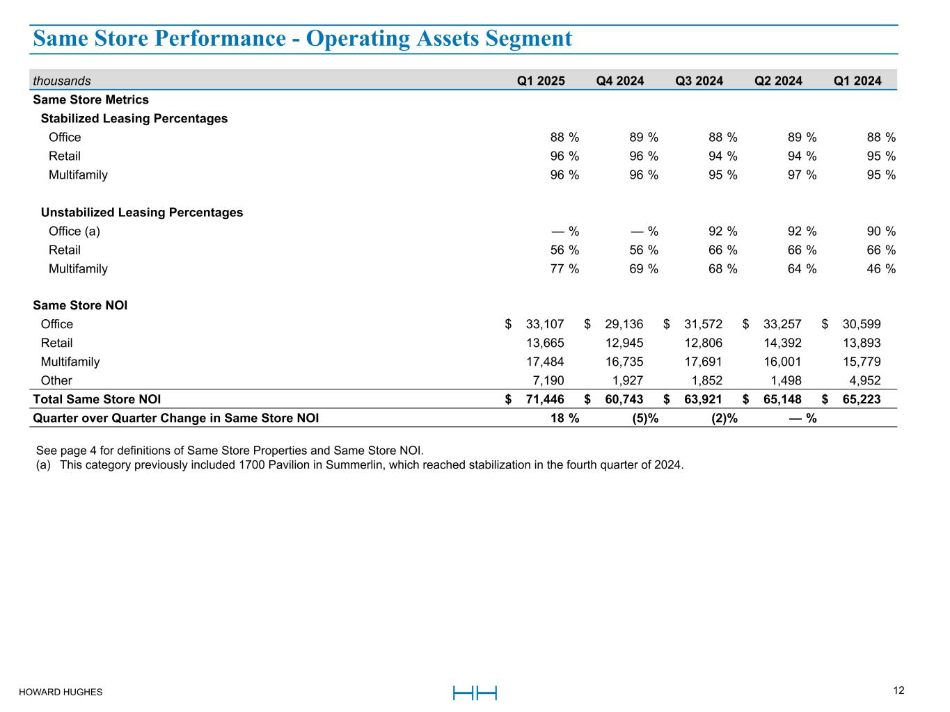 HOWARD HUGHES 11 thousands except percentages Q1 2025 Q1 2024 $ Change % Change Same Store Office Houston, TX $ 21,668 $ 20,243 $ 1,425 7 % Columbia, MD 5,791 6,098 (307) (5) % Las Vegas, NV 5,648 4,258 1,390 33 % Total Same Store Office 33,107 30,599 2,508 8 % Same Store Retail Houston, TX $ 2,814 $ 2,625 189 7 % Columbia, MD 1,329 1,068 261 24 % Las Vegas, NV 6,019 5,987 32 1 % Honolulu, HI 3,503 4,213 (710) (17) % Total Same Store Retail 13,665 13,893 (228) (2) % Same Store Multi-Family Houston, TX $ 9,735 $ 9,405 330 4 % Columbia, MD 3,357 2,612 745 29 % Las Vegas, NV 2,671 1,761 910 52 % Company's share of NOI from unconsolidated ventures 1,721 2,001 (280) (14) % Total Same Store Multi-Family 17,484 15,779 1,705 11 % Same Store Other Houston, TX $ 1,067 $ 955 112 12 % Columbia, MD (48) 451 (499) (111) % Las Vegas, NV 320 244 76 31 % Honolulu, HI 24 81 (57) (70) % Company's share of NOI from unconsolidated ventures 5,827 3,221 2,606 81 % Total Same Store Other 7,190 4,952 2,238 45 % Total Same Store NOI 71,446 65,223 6,223 10 % Non-Same Store NOI 120 352 (232) (66) % Total Operating Assets NOI $ 71,566 $ 65,575 $ 5,991 9 % See page 4 for definitions of Same Store Properties and Same Store NOI. Same Store NOI - Operating Assets Segment