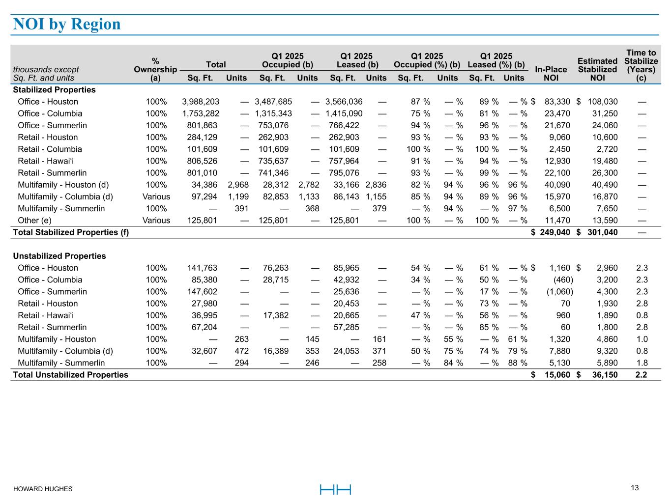 HOWARD HUGHES 13 NOI by Region thousands except Sq. Ft. and units % Ownership (a) Total Q1 2025 Occupied (b) Q1 2025 Leased (b) Q1 2025 Occupied (%) (b) Q1 2025 Leased (%) (b) In-Place NOI Estimated Stabilized NOI Time to Stabilize (Years) (c)Sq. Ft. Units Sq. Ft. Units Sq. Ft. Units Sq. Ft. Units Sq. Ft. Units Stabilized Properties Office - Houston 100% 3,988,203 — 3,487,685 — 3,566,036 — 87 % — % 89 % — % $ 83,330 $ 108,030 — Office - Columbia 100% 1,753,282 — 1,315,343 — 1,415,090 — 75 % — % 81 % — % 23,470 31,250 — Office - Summerlin 100% 801,863 — 753,076 — 766,422 — 94 % — % 96 % — % 21,670 24,060 — Retail - Houston 100% 284,129 — 262,903 — 262,903 — 93 % — % 93 % — % 9,060 10,600 — Retail - Columbia 100% 101,609 — 101,609 — 101,609 — 100 % — % 100 % — % 2,450 2,720 — Retail - Hawai‘i 100% 806,526 — 735,637 — 757,964 — 91 % — % 94 % — % 12,930 19,480 — Retail - Summerlin 100% 801,010 — 741,346 — 795,076 — 93 % — % 99 % — % 22,100 26,300 — Multifamily - Houston (d) 100% 34,386 2,968 28,312 2,782 33,166 2,836 82 % 94 % 96 % 96 % 40,090 40,490 — Multifamily - Columbia (d) Various 97,294 1,199 82,853 1,133 86,143 1,155 85 % 94 % 89 % 96 % 15,970 16,870 — Multifamily - Summerlin 100% — 391 — 368 — 379 — % 94 % — % 97 % 6,500 7,650 — Other (e) Various 125,801 — 125,801 — 125,801 — 100 % — % 100 % — % 11,470 13,590 — Total Stabilized Properties (f) $ 249,040 $ 301,040 — Unstabilized Properties Office - Houston 100% 141,763 — 76,263 — 85,965 — 54 % — % 61 % — % $ 1,160 $ 2,960 2.3 Office - Columbia 100% 85,380 — 28,715 — 42,932 — 34 % — % 50 % — % (460) 3,200 2.3 Office - Summerlin 100% 147,602 — — — 25,636 — — % — % 17 % — % (1,060) 4,300 2.3 Retail - Houston 100% 27,980 — — — 20,453 — — % — % 73 % — % 70 1,930 2.8 Retail - Hawai‘i 100% 36,995 — 17,382 — 20,665 — 47 % — % 56 % — % 960 1,890 0.8 Retail - Summerlin 100% 67,204 — — — 57,285 — — % — % 85 % — % 60 1,800 2.8 Multifamily - Houston 100% — 263 — 145 — 161 — % 55 % — % 61 % 1,320 4,860 1.0 Multifamily - Columbia (d) 100% 32,607 472 16,389 353 24,053 371 50 % 75 % 74 % 79 % 7,880 9,320 0.8 Multifamily - Summerlin 100% — 294 — 246 — 258 — % 84 % — % 88 % 5,130 5,890 1.8 Total Unstabilized Properties $ 15,060 $ 36,150 2.2