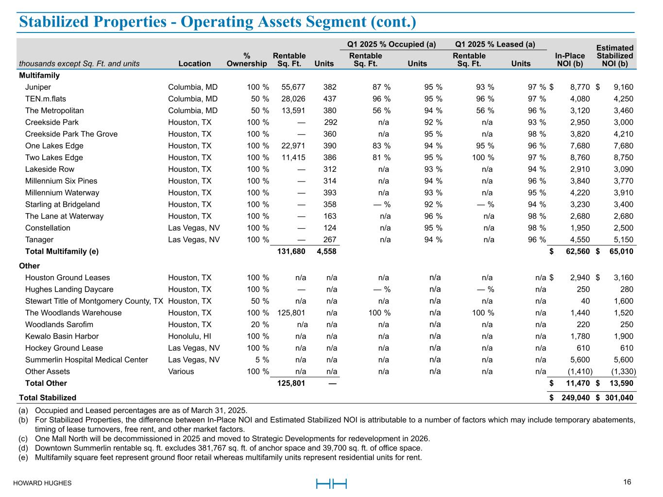 HOWARD HUGHES 15 thousands except Sq. Ft. and units Location % Ownership Rentable Sq. Ft. Q1 2025 % Occupied (a) Q1 2025 % Leased (a) In-Place NOI Est. Stabilized NOI (b) Office Columbia Office Properties Columbia, MD 100 % 67,066 72 % 72 % $ 390 $ 950 6100 Merriweather Columbia, MD 100 % 326,237 83 % 98 % 8,480 9,200 One Merriweather Columbia, MD 100 % 209,950 94 % 94 % 5,370 5,630 Two Merriweather Columbia, MD 100 % 124,639 84 % 92 % 2,420 3,100 Merriweather Row Columbia, MD 100 % 925,584 70 % 74 % 6,660 12,370 One Mall North (c) Columbia, MD 100 % 99,806 48 % 48 % 150 N/A One Hughes Landing Houston, TX 100 % 201,268 58 % 83 % 1,700 5,200 Two Hughes Landing Houston, TX 100 % 200,255 71 % 74 % 2,420 5,270 Three Hughes Landing Houston, TX 100 % 325,810 98 % 98 % 8,920 8,580 1725 Hughes Landing Boulevard Houston, TX 100 % 340,611 54 % 55 % 210 7,430 1735 Hughes Landing Boulevard Houston, TX 100 % 319,456 95 % 95 % 8,160 8,370 2201 Lake Woodlands Drive Houston, TX 100 % 22,259 100 % 100 % 330 330 Lakefront North Houston, TX 100 % 258,058 97 % 97 % 7,320 7,320 8770 New Trails Houston, TX 100 % 180,000 100 % 100 % 4,560 4,740 9303 New Trails Houston, TX 100 % 98,283 51 % 51 % 170 1,530 3831 Technology Forest Drive Houston, TX 100 % 106,104 79 % 86 % (110) 2,450 The Woodlands Towers at the Waterway Houston, TX 100 % 1,395,599 99 % 100 % 41,880 43,510 3 Waterway Square Houston, TX 100 % 227,617 91 % 91 % 3,350 5,900 4 Waterway Square Houston, TX 100 % 217,952 78 % 78 % 3,340 5,900 1400 Woodloch Forest Houston, TX 100 % 94,931 85 % 85 % 1,080 1,500 Aristocrat Las Vegas, NV 100 % 181,534 100 % 100 % 4,510 4,520 1700 Pavilion Las Vegas, NV 100 % 265,898 92 % 92 % 6,830 8,380 One Summerlin Las Vegas, NV 100 % 207,292 87 % 93 % 5,940 6,440 Two Summerlin Las Vegas, NV 100 % 147,139 100 % 100 % 4,390 4,720 Total Office 6,543,348 $ 128,470 $ 163,340 Retail Color Burst Park Retail Columbia, MD 100 % 12,410 100 % 100 % $ 470 $ 410 Rouse Building Columbia, MD 100 % 89,199 100 % 100 % 1,980 2,310 Ward Village Retail Honolulu, HI 100 % 806,526 91 % 94 % 12,930 19,480 Creekside Park West Houston, TX 100 % 72,976 97 % 97 % 1,910 2,200 Hughes Landing Retail Houston, TX 100 % 125,721 90 % 90 % 4,340 4,990 1701 Lake Robbins Houston, TX 100 % 12,376 100 % 100 % 540 540 20/25 Waterway Avenue Houston, TX 100 % 51,543 87 % 87 % 1,400 2,000 Waterway Square Retail Houston, TX 100 % 21,513 100 % 100 % 870 870 Downtown Summerlin (d) Las Vegas, NV 100 % 801,010 93 % 99 % 22,100 26,300 Total Retail 1,993,274 $ 46,540 $ 59,100 Stabilized Properties - Operating Assets Segment