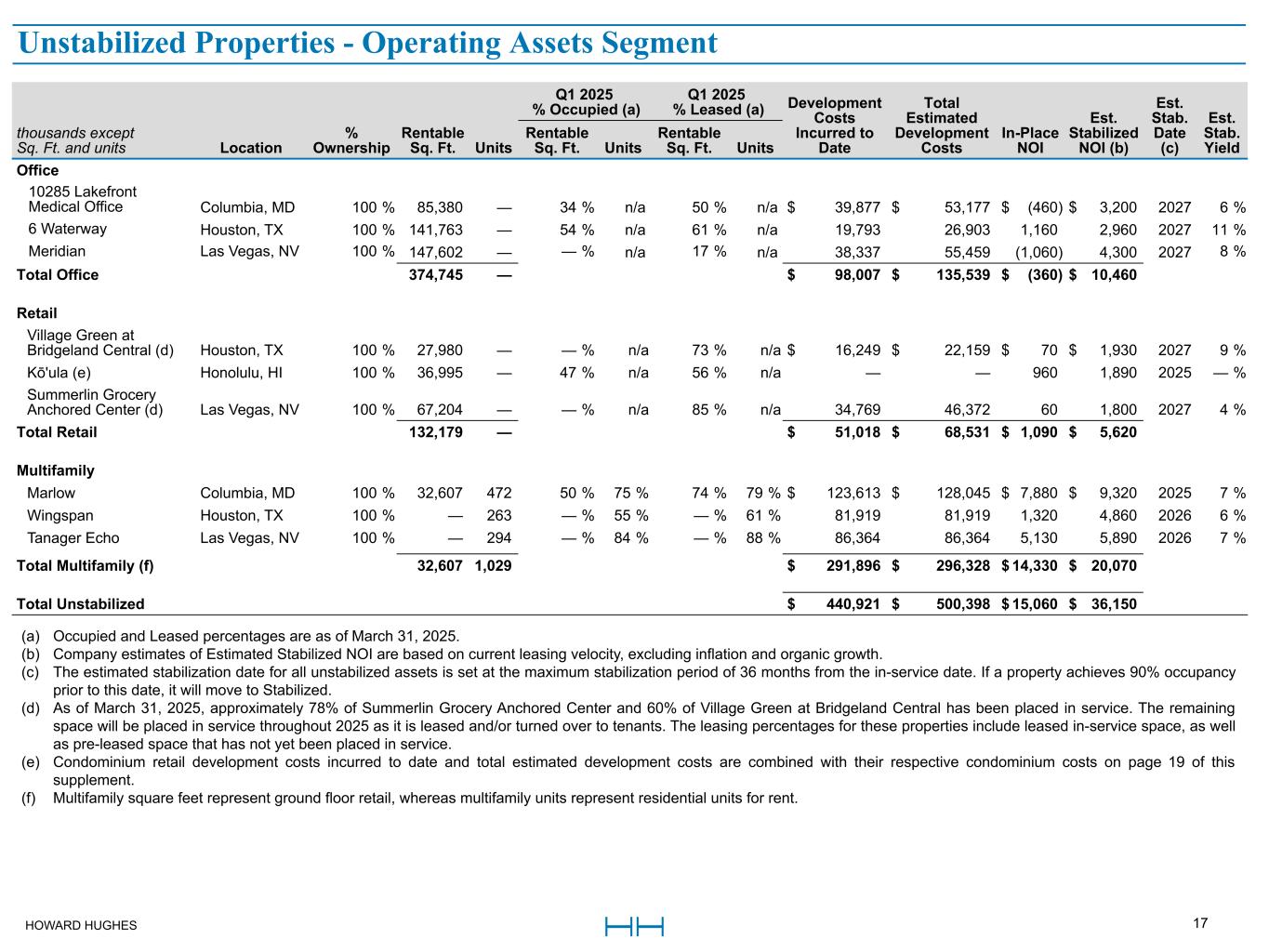 HOWARD HUGHES 16 Q1 2025 % Occupied (a) Q1 2025 % Leased (a) Estimated Stabilized NOI (b)thousands except Sq. Ft. and units Location % Ownership Rentable Sq. Ft. Units Rentable Sq. Ft. Units Rentable Sq. Ft. Units In-Place NOI (b) Multifamily Juniper Columbia, MD 100 % 55,677 382 87 % 95 % 93 % 97 % $ 8,770 $ 9,160 TEN.m.flats Columbia, MD 50 % 28,026 437 96 % 95 % 96 % 97 % 4,080 4,250 The Metropolitan Columbia, MD 50 % 13,591 380 56 % 94 % 56 % 96 % 3,120 3,460 Creekside Park Houston, TX 100 % — 292 n/a 92 % n/a 93 % 2,950 3,000 Creekside Park The Grove Houston, TX 100 % — 360 n/a 95 % n/a 98 % 3,820 4,210 One Lakes Edge Houston, TX 100 % 22,971 390 83 % 94 % 95 % 96 % 7,680 7,680 Two Lakes Edge Houston, TX 100 % 11,415 386 81 % 95 % 100 % 97 % 8,760 8,750 Lakeside Row Houston, TX 100 % — 312 n/a 93 % n/a 94 % 2,910 3,090 Millennium Six Pines Houston, TX 100 % — 314 n/a 94 % n/a 96 % 3,840 3,770 Millennium Waterway Houston, TX 100 % — 393 n/a 93 % n/a 95 % 4,220 3,910 Starling at Bridgeland Houston, TX 100 % — 358 — % 92 % — % 94 % 3,230 3,400 The Lane at Waterway Houston, TX 100 % — 163 n/a 96 % n/a 98 % 2,680 2,680 Constellation Las Vegas, NV 100 % — 124 n/a 95 % n/a 98 % 1,950 2,500 Tanager Las Vegas, NV 100 % — 267 n/a 94 % n/a 96 % 4,550 5,150 Total Multifamily (e) 131,680 4,558 $ 62,560 $ 65,010 Other Houston Ground Leases Houston, TX 100 % n/a n/a n/a n/a n/a n/a $ 2,940 $ 3,160 Hughes Landing Daycare Houston, TX 100 % — n/a — % n/a — % n/a 250 280 Stewart Title of Montgomery County, TX Houston, TX 50 % n/a n/a n/a n/a n/a n/a 40 1,600 The Woodlands Warehouse Houston, TX 100 % 125,801 n/a 100 % n/a 100 % n/a 1,440 1,520 Woodlands Sarofim Houston, TX 20 % n/a n/a n/a n/a n/a n/a 220 250 Kewalo Basin Harbor Honolulu, HI 100 % n/a n/a n/a n/a n/a n/a 1,780 1,900 Hockey Ground Lease Las Vegas, NV 100 % n/a n/a n/a n/a n/a n/a 610 610 Summerlin Hospital Medical Center Las Vegas, NV 5 % n/a n/a n/a n/a n/a n/a 5,600 5,600 Other Assets Various 100 % n/a n/a n/a n/a n/a n/a (1,410) (1,330) Total Other 125,801 — $ 11,470 $ 13,590 Total Stabilized $ 249,040 $ 301,040 (a) Occupied and Leased percentages are as of March 31, 2025. (b) For Stabilized Properties, the difference between In-Place NOI and Estimated Stabilized NOI is attributable to a number of factors which may include temporary abatements, timing of lease turnovers, free rent, and other market factors. (c) One Mall North will be decommissioned in 2025 and moved to Strategic Developments for redevelopment in 2026. (d) Downtown Summerlin rentable sq. ft. excludes 381,767 sq. ft. of anchor space and 39,700 sq. ft. of office space. (e) Multifamily square feet represent ground floor retail whereas multifamily units represent residential units for rent. Stabilized Properties - Operating Assets Segment (cont.)