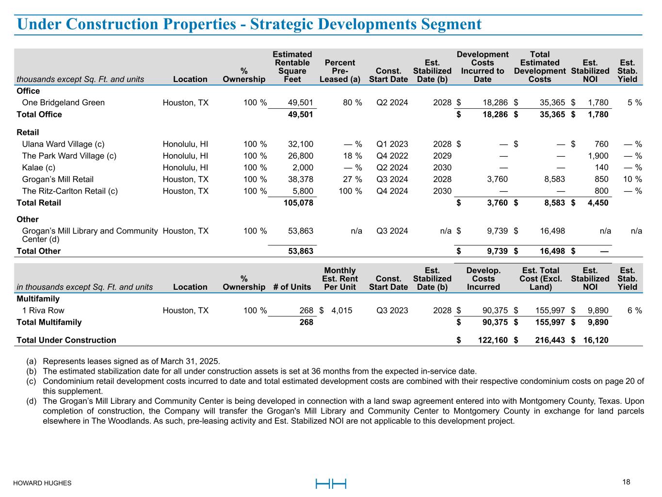 HOWARD HUGHES 17 Q1 2025 % Occupied (a) Q1 2025 % Leased (a) Development Costs Incurred to Date Total Estimated Development Costs In-Place NOI Est. Stabilized NOI (b) Est. Stab. Date (c) Est. Stab. Yield thousands except Sq. Ft. and units Location % Ownership Rentable Sq. Ft. Units Rentable Sq. Ft. Units Rentable Sq. Ft. Units Office 10285 Lakefront Medical Office Columbia, MD 100 % 85,380 — 34 % n/a 50 % n/a $ 39,877 $ 53,177 $ (460) $ 3,200 2027 6 % 6 Waterway Houston, TX 100 % 141,763 — 54 % n/a 61 % n/a 19,793 26,903 1,160 2,960 2027 11 % Meridian Las Vegas, NV 100 % 147,602 — — % n/a 17 % n/a 38,337 55,459 (1,060) 4,300 2027 8 % Total Office 374,745 — $ 98,007 $ 135,539 $ (360) $ 10,460 Retail Village Green at Bridgeland Central (d) Houston, TX 100 % 27,980 — — % n/a 73 % n/a $ 16,249 $ 22,159 $ 70 $ 1,930 2027 9 % Kō'ula (e) Honolulu, HI 100 % 36,995 — 47 % n/a 56 % n/a — — 960 1,890 2025 — % Summerlin Grocery Anchored Center (d) Las Vegas, NV 100 % 67,204 — — % n/a 85 % n/a 34,769 46,372 60 1,800 2027 4 % Total Retail 132,179 — $ 51,018 $ 68,531 $ 1,090 $ 5,620 Multifamily Marlow Columbia, MD 100 % 32,607 472 50 % 75 % 74 % 79 % $ 123,613 $ 128,045 $ 7,880 $ 9,320 2025 7 % Wingspan Houston, TX 100 % — 263 — % 55 % — % 61 % 81,919 81,919 1,320 4,860 2026 6 % Tanager Echo Las Vegas, NV 100 % — 294 — % 84 % — % 88 % 86,364 86,364 5,130 5,890 2026 7 % Total Multifamily (f) 32,607 1,029 $ 291,896 $ 296,328 $ 14,330 $ 20,070 Total Unstabilized $ 440,921 $ 500,398 $ 15,060 $ 36,150 (a) Occupied and Leased percentages are as of March 31, 2025. (b) Company estimates of Estimated Stabilized NOI are based on current leasing velocity, excluding inflation and organic growth. (c) The estimated stabilization date for all unstabilized assets is set at the maximum stabilization period of 36 months from the in-service date. If a property achieves 90% occupancy prior to this date, it will move to Stabilized. (d) As of March 31, 2025, approximately 78% of Summerlin Grocery Anchored Center and 60% of Village Green at Bridgeland Central has been placed in service. The remaining space will be placed in service throughout 2025 as it is leased and/or turned over to tenants. The leasing percentages for these properties include leased in-service space, as well as pre-leased space that has not yet been placed in service. (e) Condominium retail development costs incurred to date and total estimated development costs are combined with their respective condominium costs on page 19 of this supplement. (f) Multifamily square feet represent ground floor retail, whereas multifamily units represent residential units for rent. Unstabilized Properties - Operating Assets Segment