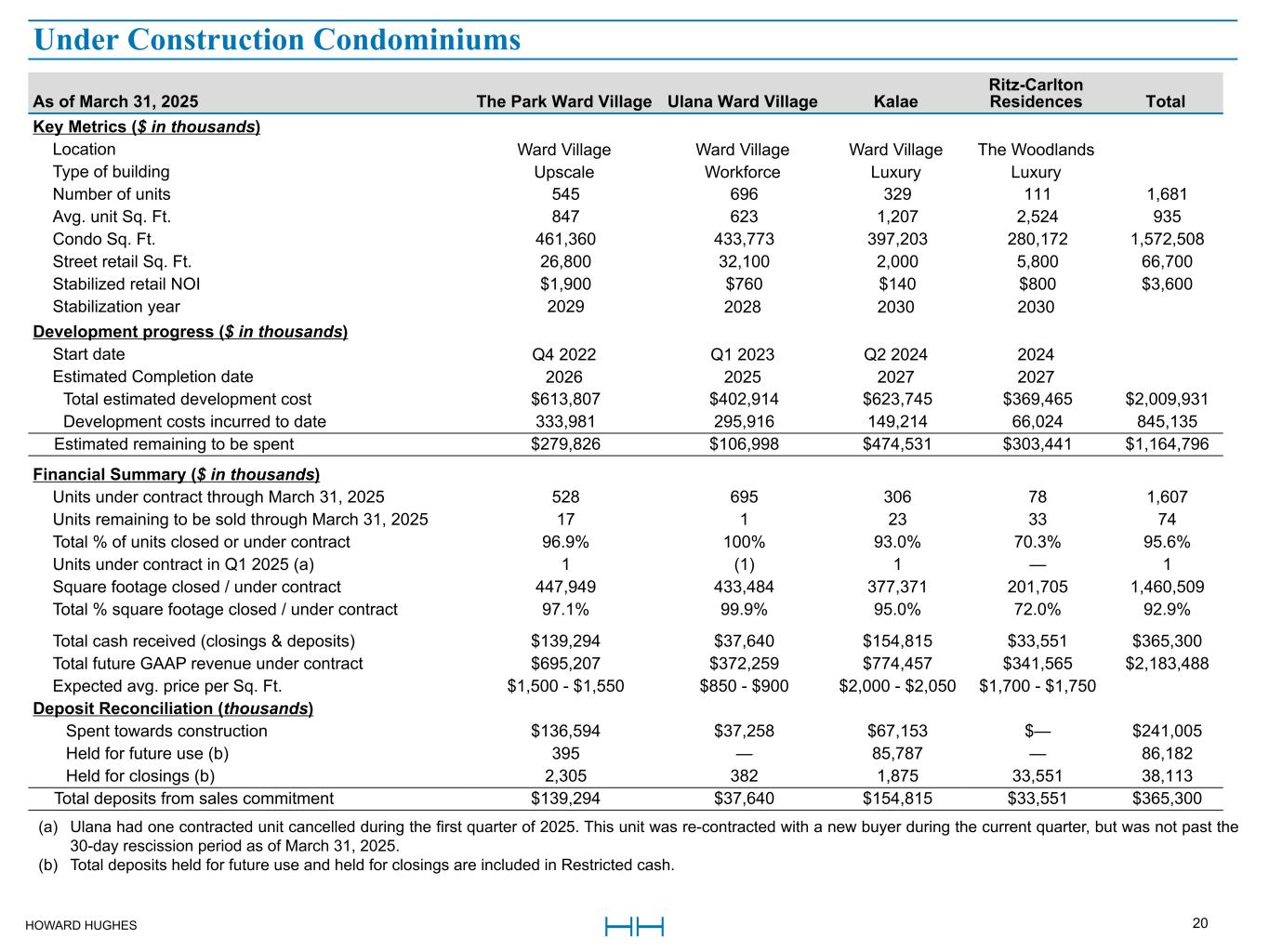HOWARD HUGHES 19 As of March 31, 2025 Waiea Anaha Ae`o Ke Kilohana ‘A‘ali‘i Kō'ula Victoria Place Total Key Metrics ($ in thousands) Location Ward Village Ward Village Ward Village Ward Village Ward Village Ward Village Ward Village Type of building Luxury Luxury Upscale Workforce Upscale Upscale Luxury Number of units 177 317 465 423 750 565 349 3,046 Condo Sq. Ft. 378,488 449,205 389,663 294,273 390,097 409,612 406,351 2,717,689 Street retail Sq. Ft. 7,716 16,048 70,800 28,386 11,175 36,995 n/a 171,120 Stabilized retail NOI $290 $1,190 $2,170 $970 $550 $1,890 n/a $7,060 Stabilization year 2017 2020 2019 2020 2024 2025 n/a Development progress ($ in thousands) Completion date Q4 2016 Q4 2017 Q4 2018 Q2 2019 Q4 2021 Q3 2022 Q4 2024 Total estimated development cost (a) $542,631 $403,796 $430,086 $217,318 $386,405 $484,238 $536,155 $3,000,629 Development costs incurred to date (a) 542,226 403,796 430,086 217,318 385,158 477,125 529,289 2,984,998 Estimated remaining to be spent $405 $— $— $— $1,247 $7,113 $6,866 $15,631 Financial Summary ($ in thousands) Total GAAP revenue recognized $698,228 $515,882 $513,096 $218,552 $536,942 $635,100 $778,787 $3,896,587 Completed Condominiums (a) Total estimated development costs and Development costs incurred to date for Waiea include costs for defect remediation. Although the Company agreed to pay for the repair of the defects, it sought to recover the repair costs from the general contractor, other responsible parties, and insurance proceeds. In the third quarter of 2024, a settlement agreement was reached related to the defect remediation costs and these amounts are now shown net of insurance proceeds of approximately $90.0 million and are inclusive of the $22 million final payment of project costs paid to the general contractor as part of the settlement agreement.