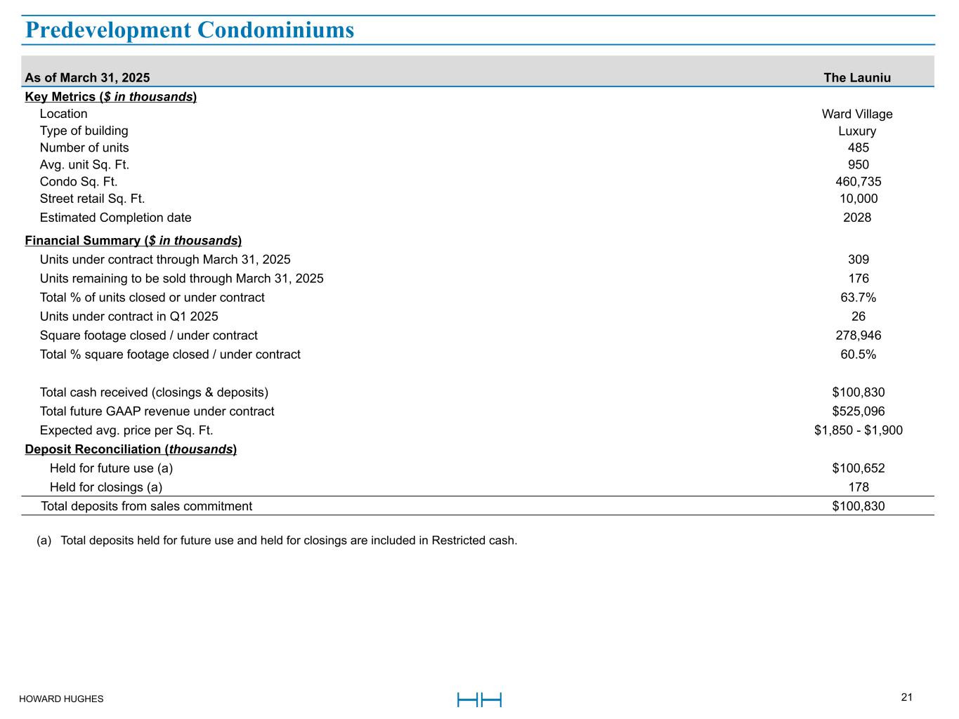 HOWARD HUGHES 20 As of March 31, 2025 The Park Ward Village Ulana Ward Village Kalae Ritz-Carlton Residences Total Key Metrics ($ in thousands) Location Ward Village Ward Village Ward Village The Woodlands Type of building Upscale Workforce Luxury Luxury Number of units 545 696 329 111 1,681 Avg. unit Sq. Ft. 847 623 1,207 2,524 935 Condo Sq. Ft. 461,360 433,773 397,203 280,172 1,572,508 Street retail Sq. Ft. 26,800 32,100 2,000 5,800 66,700 Stabilized retail NOI $1,900 $760 $140 $800 $3,600 Stabilization year 2029 2028 2030 2030 Development progress ($ in thousands) Start date Q4 2022 Q1 2023 Q2 2024 2024 Estimated Completion date 2026 2025 2027 2027 Total estimated development cost $613,807 $402,914 $623,745 $369,465 $2,009,931 Development costs incurred to date 333,981 295,916 149,214 66,024 845,135 Estimated remaining to be spent $279,826 $106,998 $474,531 $303,441 $1,164,796 Financial Summary ($ in thousands) Units under contract through March 31, 2025 528 695 306 78 1,607 Units remaining to be sold through March 31, 2025 17 1 23 33 74 Total % of units closed or under contract 96.9% 100% 93.0% 70.3% 95.6% Units under contract in Q1 2025 (a) 1 (1) 1 — 1 Square footage closed / under contract 447,949 433,484 377,371 201,705 1,460,509 Total % square footage closed / under contract 97.1% 99.9% 95.0% 72.0% 92.9% Total cash received (closings & deposits) $139,294 $37,640 $154,815 $33,551 $365,300 Total future GAAP revenue under contract $695,207 $372,259 $774,457 $341,565 $2,183,488 Expected avg. price per Sq. Ft. $1,500 - $1,550 $850 - $900 $2,000 - $2,050 $1,700 - $1,750 Deposit Reconciliation (thousands) Spent towards construction $136,594 $37,258 $67,153 $— $241,005 Held for future use (b) 395 — 85,787 — 86,182 Held for closings (b) 2,305 382 1,875 33,551 38,113 Total deposits from sales commitment $139,294 $37,640 $154,815 $33,551 $365,300 (a) Ulana had one contracted unit cancelled during the first quarter of 2025. This unit was re-contracted with a new buyer during the current quarter, but was not past the 30-day rescission period as of March 31, 2025. (b) Total deposits held for future use and held for closings are included in Restricted cash. Under Construction Condominiums