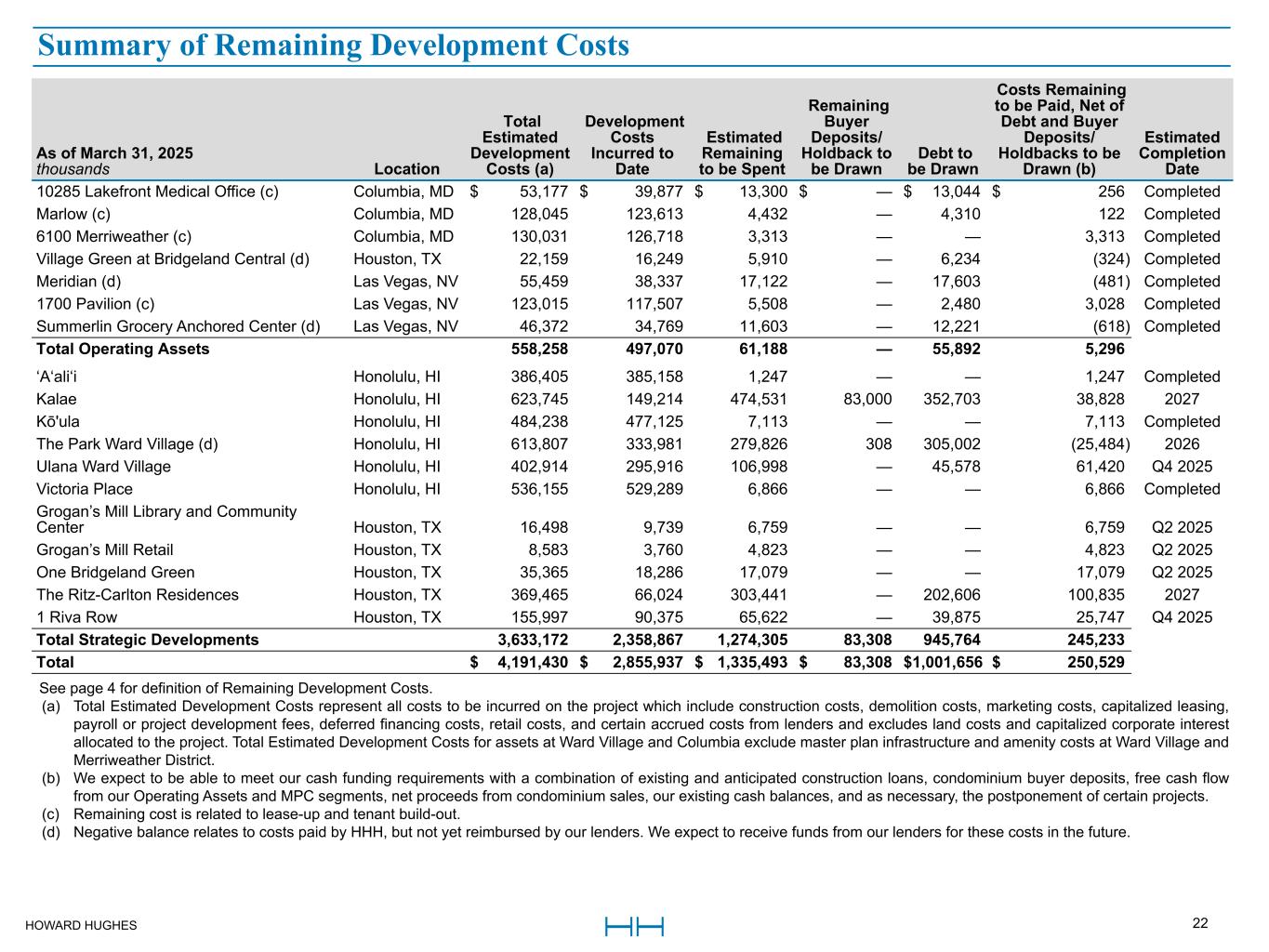 HOWARD HUGHES 22 As of March 31, 2025 thousands Location Total Estimated Development Costs (a) Development Costs Incurred to Date Estimated Remaining to be Spent Remaining Buyer Deposits/ Holdback to be Drawn Debt to be Drawn Costs Remaining to be Paid, Net of Debt and Buyer Deposits/ Holdbacks to be Drawn (b) Estimated Completion Date 10285 Lakefront Medical Office (c) Columbia, MD $ 53,177 $ 39,877 $ 13,300 $ — $ 13,044 $ 256 Completed Marlow (c) Columbia, MD 128,045 123,613 4,432 — 4,310 122 Completed 6100 Merriweather (c) Columbia, MD 130,031 126,718 3,313 — — 3,313 Completed Village Green at Bridgeland Central (d) Houston, TX 22,159 16,249 5,910 — 6,234 (324) Completed Meridian (d) Las Vegas, NV 55,459 38,337 17,122 — 17,603 (481) Completed 1700 Pavilion (c) Las Vegas, NV 123,015 117,507 5,508 — 2,480 3,028 Completed Summerlin Grocery Anchored Center (d) Las Vegas, NV 46,372 34,769 11,603 — 12,221 (618) Completed Total Operating Assets 558,258 497,070 61,188 — 55,892 5,296 ‘A‘ali‘i Honolulu, HI 386,405 385,158 1,247 — — 1,247 Completed Kalae Honolulu, HI 623,745 149,214 474,531 83,000 352,703 38,828 2027 Kō'ula Honolulu, HI 484,238 477,125 7,113 — — 7,113 Completed The Park Ward Village (d) Honolulu, HI 613,807 333,981 279,826 308 305,002 (25,484) 2026 Ulana Ward Village Honolulu, HI 402,914 295,916 106,998 — 45,578 61,420 Q4 2025 Victoria Place Honolulu, HI 536,155 529,289 6,866 — — 6,866 Completed Grogan’s Mill Library and Community Center Houston, TX 16,498 9,739 6,759 — — 6,759 Q2 2025 Grogan’s Mill Retail Houston, TX 8,583 3,760 4,823 — — 4,823 Q2 2025 One Bridgeland Green Houston, TX 35,365 18,286 17,079 — — 17,079 Q2 2025 The Ritz-Carlton Residences Houston, TX 369,465 66,024 303,441 — 202,606 100,835 2027 1 Riva Row Houston, TX 155,997 90,375 65,622 — 39,875 25,747 Q4 2025 Total Strategic Developments 3,633,172 2,358,867 1,274,305 83,308 945,764 245,233 Total $ 4,191,430 $ 2,855,937 $ 1,335,493 $ 83,308 $ 1,001,656 $ 250,529 See page 4 for definition of Remaining Development Costs. (a) Total Estimated Development Costs represent all costs to be incurred on the project which include construction costs, demolition costs, marketing costs, capitalized leasing, payroll or project development fees, deferred financing costs, retail costs, and certain accrued costs from lenders and excludes land costs and capitalized corporate interest allocated to the project. Total Estimated Development Costs for assets at Ward Village and Columbia exclude master plan infrastructure and amenity costs at Ward Village and Merriweather District. (b) We expect to be able to meet our cash funding requirements with a combination of existing and anticipated construction loans, condominium buyer deposits, free cash flow from our Operating Assets and MPC segments, net proceeds from condominium sales, our existing cash balances, and as necessary, the postponement of certain projects. (c) Remaining cost is related to lease-up and tenant build-out. (d) Negative balance relates to costs paid by HHH, but not yet reimbursed by our lenders. We expect to receive funds from our lenders for these costs in the future. Summary of Remaining Development Costs