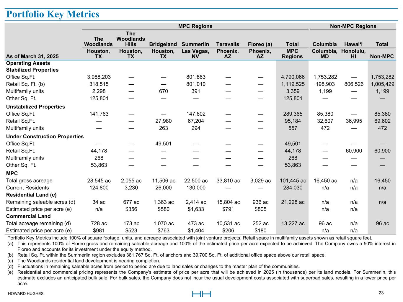 HOWARD HUGHES 23 MPC Regions Non-MPC Regions The Woodlands The Woodlands Hills Bridgeland Summerlin Teravalis Floreo (a) Total Columbia Hawai‘i Total As of March 31, 2025 Houston, TX Houston, TX Houston, TX Las Vegas, NV Phoenix, AZ Phoenix, AZ MPC Regions Columbia, MD Honolulu, HI Non-MPC Operating Assets Stabilized Properties Office Sq.Ft. 3,988,203 — — 801,863 — — 4,790,066 1,753,282 — 1,753,282 Retail Sq. Ft. (b) 318,515 — — 801,010 — — 1,119,525 198,903 806,526 1,005,429 Multifamily units 2,298 — 670 391 — — 3,359 1,199 — 1,199 Other Sq. Ft. 125,801 — — — — — 125,801 — — — Unstabilized Properties Office Sq.Ft. 141,763 — — 147,602 — — 289,365 85,380 — 85,380 Retail Sq.Ft. — — 27,980 67,204 — — 95,184 32,607 36,995 69,602 Multifamily units — — 263 294 — — 557 472 — 472 Under Construction Properties Office Sq.Ft. — — 49,501 — — — 49,501 — — — Retail Sq.Ft. 44,178 — — — — — 44,178 — 60,900 60,900 Multifamily units 268 — — — — — 268 — — — Other Sq. Ft. 53,863 — — — — — 53,863 — — — MPC Total gross acreage 28,545 ac 2,055 ac 11,506 ac 22,500 ac 33,810 ac 3,029 ac 101,445 ac 16,450 ac n/a 16,450 Current Residents 124,800 3,230 26,000 130,000 — — 284,030 n/a n/a n/a Residential Land (c) Remaining saleable acres (d) 34 ac 677 ac 1,363 ac 2,414 ac 15,804 ac 936 ac 21,228 ac n/a n/a n/a Estimated price per acre (e) n/a $356 $580 $1,633 $791 $805 n/a n/a Commercial Land Total acreage remaining (d) 728 ac 173 ac 1,070 ac 473 ac 10,531 ac 252 ac 13,227 ac 96 ac n/a 96 ac Estimated price per acre (e) $981 $523 $763 $1,404 $206 $180 n/a n/a Portfolio Key Metrics Portfolio Key Metrics include 100% of square footage, units, and acreage associated with joint venture projects. Retail space in multifamily assets shown as retail square feet. (a) This represents 100% of Floreo gross and remaining saleable acreage and 100% of the estimated price per acre expected to be achieved. The Company owns a 50% interest in Floreo and accounts for its investment under the equity method. (b) Retail Sq. Ft. within the Summerlin region excludes 381,767 Sq. Ft. of anchors and 39,700 Sq. Ft. of additional office space above our retail space. (c) The Woodlands residential land development is nearing completion. (d) Fluctuations in remaining saleable acres from period to period are due to land sales or changes to the master plan of the communities. (e) Residential and commercial pricing represents the Company's estimate of price per acre that will be achieved in 2025 (in thousands) per its land models. For Summerlin, this estimate excludes an anticipated bulk sale. For bulk sales, the Company does not incur the usual development costs associated with superpad sales, resulting in a lower price per acre. Portfolio Key Metrics