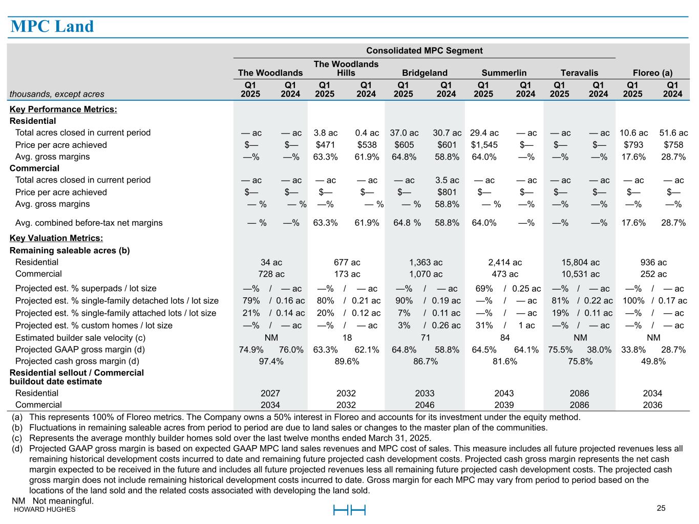 HOWARD HUGHES 25 Master Planned Community Land Consolidated MPC Segment The Woodlands The Woodlands Hills Bridgeland Summerlin Teravalis Floreo (a) thousands, except acres Q1 2025 Q1 2024 Q1 2025 Q1 2024 Q1 2025 Q1 2024 Q1 2025 Q1 2024 Q1 2025 Q1 2024 Q1 2025 Q1 2024 Key Performance Metrics: Residential Total acres closed in current period — ac — ac 3.8 ac 0.4 ac 37.0 ac 30.7 ac 29.4 ac — ac — ac — ac 10.6 ac 51.6 ac Price per acre achieved $— $— $471 $538 $605 $601 $1,545 $— $— $— $793 $758 Avg. gross margins —% —% 63.3% 61.9% 64.8% 58.8% 64.0% —% —% —% 17.6% 28.7% Commercial Total acres closed in current period — ac — ac — ac — ac — ac 3.5 ac — ac — ac — ac — ac — ac — ac Price per acre achieved $— $— $— $— $— $801 $— $— $— $— $— $— Avg. gross margins — % — % —% — % — % 58.8% — % —% —% —% —% —% Avg. combined before-tax net margins — % —% 63.3% 61.9% 64.8 % 58.8% 64.0% —% —% —% 17.6% 28.7% Key Valuation Metrics: Remaining saleable acres (b) Residential 34 ac 677 ac 1,363 ac 2,414 ac 15,804 ac 936 ac Commercial 728 ac 173 ac 1,070 ac 473 ac 10,531 ac 252 ac Projected est. % superpads / lot size —% / — ac —% / — ac —% / — ac 69% / 0.25 ac —% / — ac —% / — ac Projected est. % single-family detached lots / lot size 79% / 0.16 ac 80% / 0.21 ac 90% / 0.19 ac —% / — ac 81% / 0.22 ac 100% / 0.17 ac Projected est. % single-family attached lots / lot size 21% / 0.14 ac 20% / 0.12 ac 7% / 0.11 ac —% / — ac 19% / 0.11 ac —% / — ac Projected est. % custom homes / lot size —% / — ac —% / — ac 3% / 0.26 ac 31% / 1 ac —% / — ac —% / — ac Estimated builder sale velocity (c) NM 18 71 84 NM NM Projected GAAP gross margin (d) 74.9% 76.0% 63.3% 62.1% 64.8% 58.8% 64.5% 64.1% 75.5% 38.0% 33.8% 28.7% Projected cash gross margin (d) 97.4% 89.6% 86.7% 81.6% 75.8% 49.8% Residential sellout / Commercial buildout date estimate Residential 2027 2032 2033 2043 2086 2034 Commercial 2034 2032 2046 2039 2086 2036 (a) This represents 100% of Floreo metrics. The Company owns a 50% interest in Floreo and accounts for its investment under the equity method. (b) Fluctuations in remaining saleable acres from period to period are due to land sales or changes to the master plan of the communities. (c) Represents the average monthly builder homes sold over the last twelve months ended March 31, 2025. (d) Projected GAAP gross margin is based on expected GAAP MPC land sales revenues and MPC cost of sales. This measure includes all future projected revenues less all remaining historical development costs incurred to date and remaining future projected cash development costs. Projected cash gross margin represents the net cash margin expected to be received in the future and includes all future projected revenues less all remaining future projected cash development costs. The projected cash gross margin does not include remaining historical development costs incurred to date. Gross margin for each MPC may vary from period to period based on the locations of the land sold and the related costs associated with developing the land sold. NM Not meaningful. MPC Land