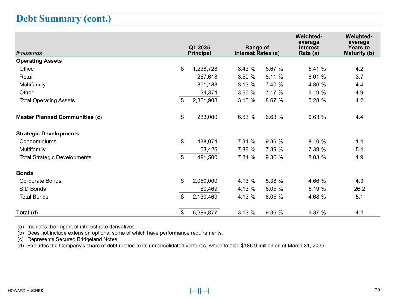 HOWARD HUGHES 28 thousands March 31, 2025 December 31, 2024 Fixed-rate debt Unsecured 5.375% Senior Notes due 2028 $ 750,000 $ 750,000 Unsecured 4.125% Senior Notes due 2029 650,000 650,000 Unsecured 4.375% Senior Notes due 2031 650,000 650,000 Secured mortgages payable 1,650,111 1,635,750 Special Improvement District bonds 80,469 83,779 Variable-rate debt Secured mortgages payable, excluding condominium financing 785,223 784,682 Condominium financing 438,074 331,226 Secured Bridgeland Notes due 2026 283,000 283,000 Mortgages, notes and loans payable 5,286,877 5,168,437 Deferred financing costs (37,812) (40,968) Mortgages, notes, and loans payable, net $ 5,249,065 $ 5,127,469 Net Debt on a Segment Basis as of March 31, 2025 (a) thousands Operating Assets Master Planned Communities Strategic Developments Segment Totals Non-Segment Amounts Total Mortgages, notes, and loans payable, net $ 2,368,172 $ 356,264 $ 490,056 $ 3,214,492 $ 2,034,573 $ 5,249,065 Mortgages, notes, and loans payable of unconsolidated ventures (b) 90,552 96,348 — 186,900 — 186,900 Less: Cash and cash equivalents (22,319) (115,469) (10,101) (147,889) (345,768) (493,657) Cash and cash equivalents of unconsolidated ventures (b) (2,406) (11,661) (6,809) (20,876) — (20,876) Special Improvement District receivables — (88,331) — (88,331) — (88,331) Municipal Utility District receivables, net — (500,255) (3,113) (503,368) — (503,368) TIF receivable — — (5,567) (5,567) — (5,567) Net Debt $ 2,433,999 $ (263,104) $ 464,466 $ 2,635,361 $ 1,688,805 $ 4,324,166 Consolidated Debt Maturities and Contractual Obligations as of March 31, 2025 thousands 2025 2026 2027 2028 2029 Thereafter Total Mortgages, notes, and loans payable $ 425,414 $ 586,010 $ 436,786 $ 840,807 $ 1,270,240 $ 1,727,620 $ 5,286,877 Interest payments (c) 210,166 231,503 199,196 163,804 100,072 219,096 1,123,837 Ground lease commitments 300 300 300 300 300 5,600 7,100 Total $ 635,880 $ 817,813 $ 636,282 $ 1,004,911 $ 1,370,612 $ 1,952,316 $ 6,417,814 Debt Summary (a) Net debt is a non-GAAP financial measure that we believe is useful to our investors and other users of our financial statements as its components are important indicators of our overall liquidity, capital structure, and financial position. However, it should not be used as an alternative to our debt calculated in accordance with GAAP. (b) Each segment includes our share of the Mortgages, notes, and loans payable, net and Cash and cash equivalents for all joint ventures included in Investments in unconsolidated ventures. (c) Interest is based on the borrowings that are presently outstanding and current floating interest rates without the effects of interest rate derivatives. Debt Summary