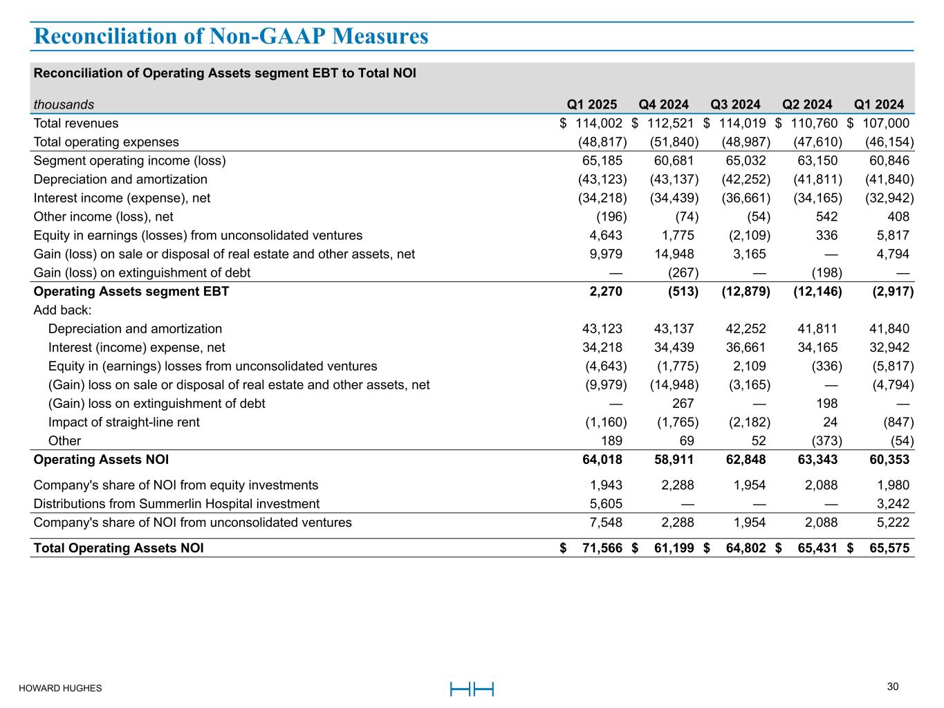 HOWARD HUGHES 30 Reconciliation of Operating Assets segment EBT to Total NOI thousands Q1 2025 Q4 2024 Q3 2024 Q2 2024 Q1 2024 Total revenues $ 114,002 $ 112,521 $ 114,019 $ 110,760 $ 107,000 Total operating expenses (48,817) (51,840) (48,987) (47,610) (46,154) Segment operating income (loss) 65,185 60,681 65,032 63,150 60,846 Depreciation and amortization (43,123) (43,137) (42,252) (41,811) (41,840) Interest income (expense), net (34,218) (34,439) (36,661) (34,165) (32,942) Other income (loss), net (196) (74) (54) 542 408 Equity in earnings (losses) from unconsolidated ventures 4,643 1,775 (2,109) 336 5,817 Gain (loss) on sale or disposal of real estate and other assets, net 9,979 14,948 3,165 — 4,794 Gain (loss) on extinguishment of debt — (267) — (198) — Operating Assets segment EBT 2,270 (513) (12,879) (12,146) (2,917) Add back: Depreciation and amortization 43,123 43,137 42,252 41,811 41,840 Interest (income) expense, net 34,218 34,439 36,661 34,165 32,942 Equity in (earnings) losses from unconsolidated ventures (4,643) (1,775) 2,109 (336) (5,817) (Gain) loss on sale or disposal of real estate and other assets, net (9,979) (14,948) (3,165) — (4,794) (Gain) loss on extinguishment of debt — 267 — 198 — Impact of straight-line rent (1,160) (1,765) (2,182) 24 (847) Other 189 69 52 (373) (54) Operating Assets NOI 64,018 58,911 62,848 63,343 60,353 Company's share of NOI from equity investments 1,943 2,288 1,954 2,088 1,980 Distributions from Summerlin Hospital investment 5,605 — — — 3,242 Company's share of NOI from unconsolidated ventures 7,548 2,288 1,954 2,088 5,222 Total Operating Assets NOI $ 71,566 $ 61,199 $ 64,802 $ 65,431 $ 65,575 Reconciliation of Non-GAAP Measures