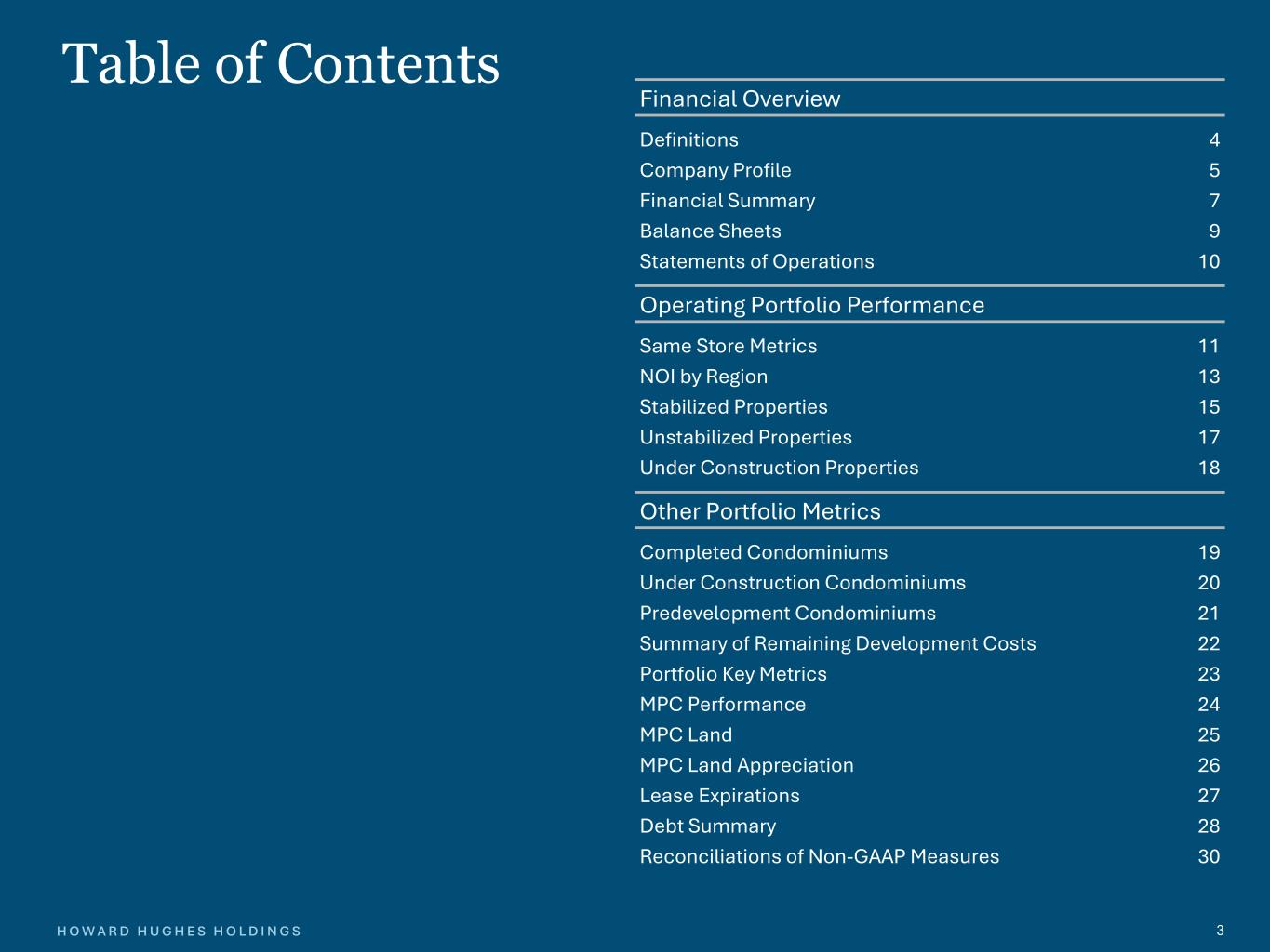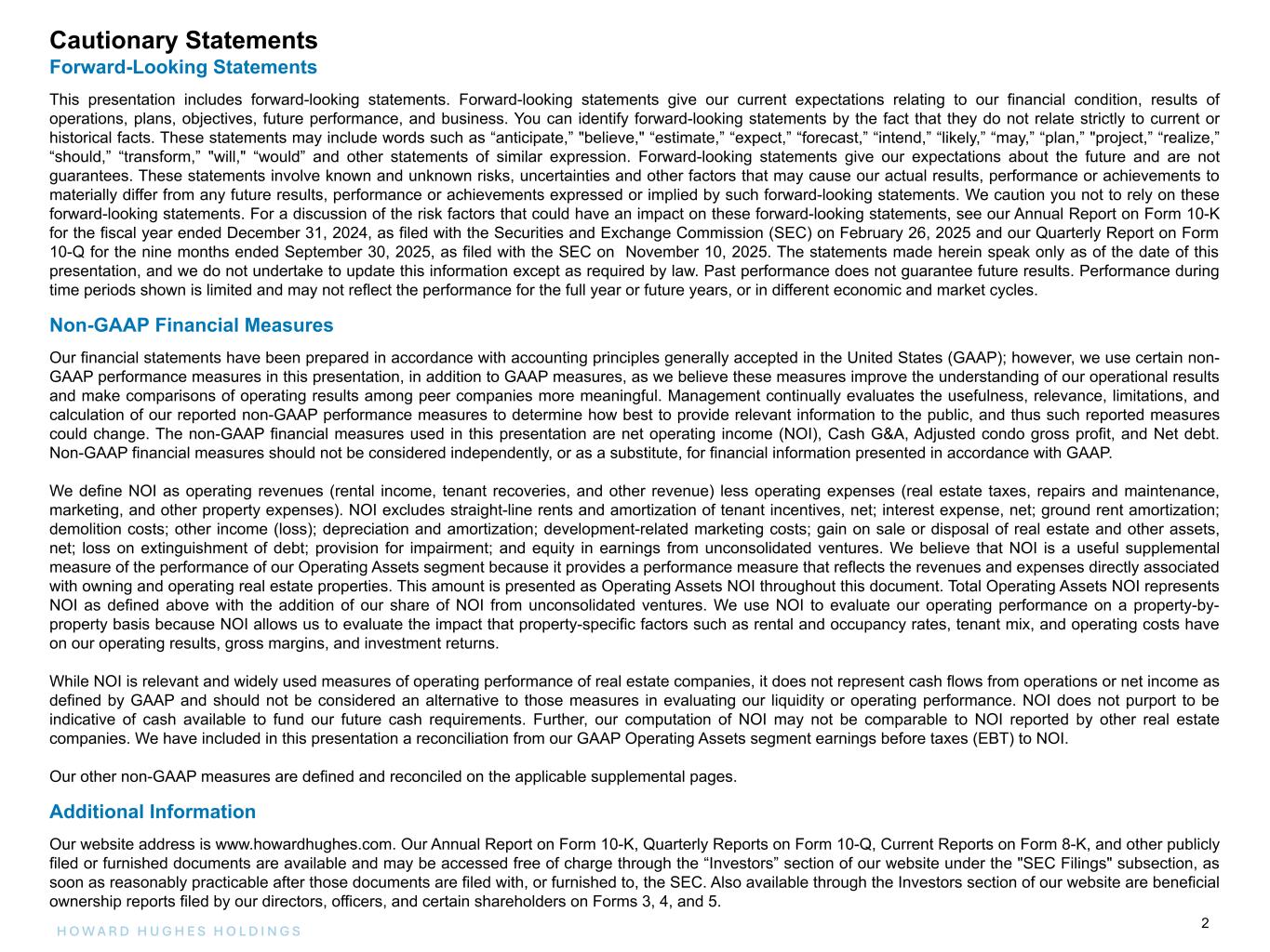 2H O W A R D H U G H E S H O L D I N G S 2 Cautionary StatementsCautionary Statements Forward-Looking Statements This presentation includes forward-looking statements. Forward-looking statements give our current expectations relating to our financial condition, results of operations, plans, objectives, future performance, and business. You can identify forward-looking statements by the fact that they do not relate strictly to current or historical facts. These statements may include words such as “anticipate,” "believe," “estimate,” “expect,” “forecast,” “intend,” “likely,” “may,” “plan,” "project,” “realize,” “should,” “transform,” "will," “would” and other statements of similar expression. Forward-looking statements give our expectations about the future and are not guarantees. These statements involve known and unknown risks, uncertainties and other factors that may cause our actual results, performance or achievements to materially differ from any future results, performance or achievements expressed or implied by such forward-looking statements. We caution you not to rely on these forward-looking statements. For a discussion of the risk factors that could have an impact on these forward-looking statements, see our Annual Report on Form 10-K for the fiscal year ended December 31, 2024, as filed with the Securities and Exchange Commission (SEC) on February 26, 2025 and our Quarterly Report on Form 10-Q for the nine months ended September 30, 2025, as filed with the SEC on November 10, 2025. The statements made herein speak only as of the date of this presentation, and we do not undertake to update this information except as required by law. Past performance does not guarantee future results. Performance during time periods shown is limited and may not reflect the performance for the full year or future years, or in different economic and market cycles. Non-GAAP Financial Measures Our financial statements have been prepared in accordance with accounting principles generally accepted in the United States (GAAP); however, we use certain non- GAAP performance measures in this presentation, in addition to GAAP measures, as we believe these measures improve the understanding of our operational results and make comparisons of operating results among peer companies more meaningful. Management continually evaluates the usefulness, relevance, limitations, and calculation of our reported non-GAAP performance measures to determine how best to provide relevant information to the public, and thus such reported measures could change. The non-GAAP financial measures used in this presentation are net operating income (NOI), Cash G&A, Adjusted condo gross profit, and Net debt. Non-GAAP financial measures should not be considered independently, or as a substitute, for financial information presented in accordance with GAAP. We define NOI as operating revenues (rental income, tenant recoveries, and other revenue) less operating expenses (real estate taxes, repairs and maintenance, marketing, and other property expenses). NOI excludes straight-line rents and amortization of tenant incentives, net; interest expense, net; ground rent amortization; demolition costs; other income (loss); depreciation and amortization; development-related marketing costs; gain on sale or disposal of real estate and other assets, net; loss on extinguishment of debt; provision for impairment; and equity in earnings from unconsolidated ventures. We believe that NOI is a useful supplemental measure of the performance of our Operating Assets segment because it provides a performance measure that reflects the revenues and expenses directly associated with owning and operating real estate properties. This amount is presented as Operating Assets NOI throughout this document. Total Operating Assets NOI represents NOI as defined above with the addition of our share of NOI from unconsolidated ventures. We use NOI to evaluate our operating performance on a property-by- property basis because NOI allows us to evaluate the impact that property-specific factors such as rental and occupancy rates, tenant mix, and operating costs have on our operating results, gross margins, and investment returns. While NOI is relevant and widely used measures of operating performance of real estate companies, it does not represent cash flows from operations or net income as defined by GAAP and should not be considered an alternative to those measures in evaluating our liquidity or operating performance. NOI does not purport to be indicative of cash available to fund our future cash requirements. Further, our computation of NOI may not be comparable to NOI reported by other real estate companies. We have included in this presentation a reconciliation from our GAAP Operating Assets segment earnings before taxes (EBT) to NOI. Our other non-GAAP measures are defined and reconciled on the applicable supplemental pages. Additional Information Our website address is www.howardhughes.com. Our Annual Report on Form 10-K, Quarterly Reports on Form 10-Q, Current Reports on Form 8-K, and other publicly filed or furnished documents are available and may be accessed free of charge through the “Investors” section of our website under the "SEC Filings" subsection, as soon as reasonably practicable after those documents are filed with, or furnished to, the SEC. Also available through the Investors section of our website are beneficial ownership reports filed by our directors, officers, and certain shareholders on Forms 3, 4, and 5.