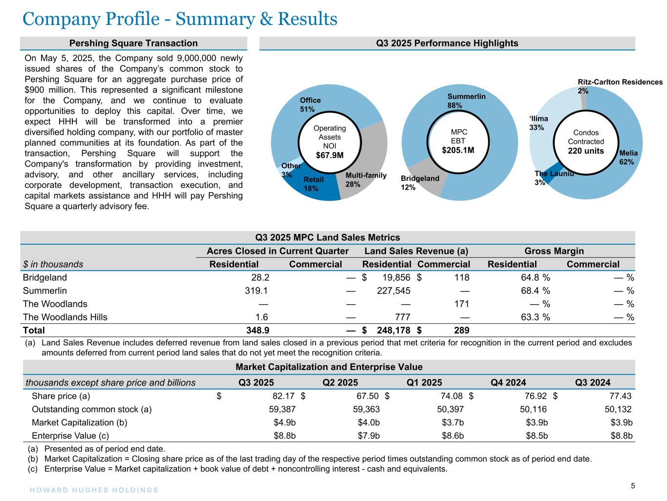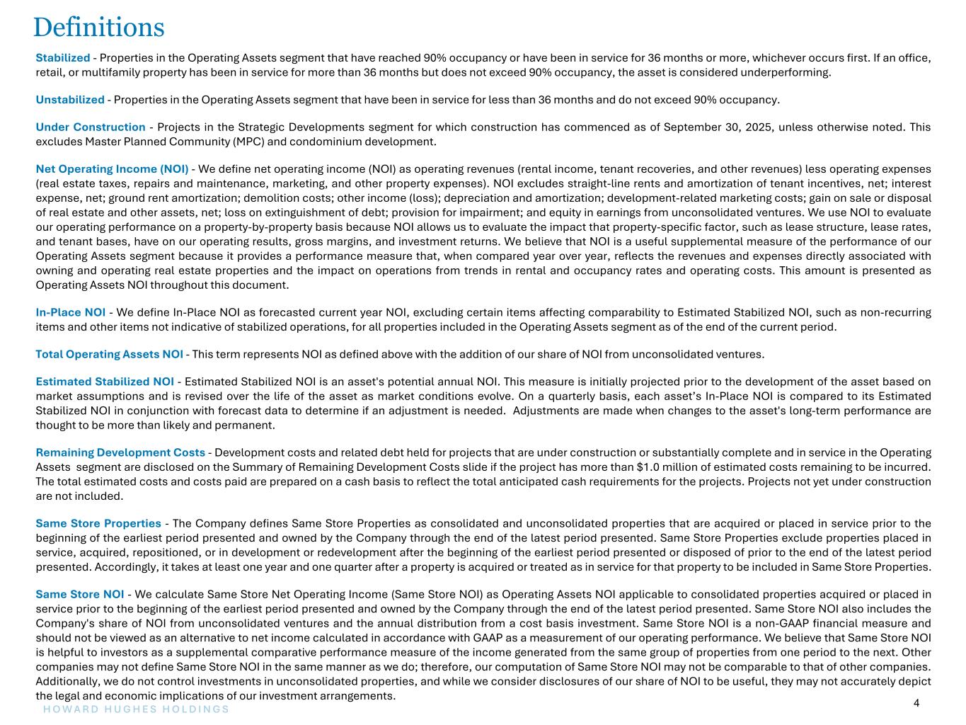 4H O W A R D H U G H E S H O L D I N G S 4 Stabilized - Properties in the Operating Assets segment that have reached 90% occupancy or have been in service for 36 months or more, whichever occurs first. If an office, retail, or multifamily property has been in service for more than 36 months but does not exceed 90% occupancy, the asset is considered underperforming. Unstabilized - Properties in the Operating Assets segment that have been in service for less than 36 months and do not exceed 90% occupancy. Under Construction - Projects in the Strategic Developments segment for which construction has commenced as of September  30, 2025, unless otherwise noted. This excludes Master Planned Community (MPC) and condominium development. Net Operating Income (NOI) - We define net operating income (NOI) as operating revenues (rental income, tenant recoveries, and other revenues) less operating expenses (real estate taxes, repairs and maintenance, marketing, and other property expenses). NOI excludes straight-line rents and amortization of tenant incentives, net; interest expense, net; ground rent amortization; demolition costs; other income (loss); depreciation and amortization; development-related marketing costs; gain on sale or disposal of real estate and other assets, net; loss on extinguishment of debt; provision for impairment; and equity in earnings from unconsolidated ventures. We use NOI to evaluate our operating performance on a property-by-property basis because NOI allows us to evaluate the impact that property-specific factor, such as lease structure, lease rates, and tenant bases, have on our operating results, gross margins, and investment returns. We believe that NOI is a useful supplemental measure of the performance of our Operating Assets segment because it provides a performance measure that, when compared year over year, reflects the revenues and expenses directly associated with owning and operating real estate properties and the impact on operations from trends in rental and occupancy rates and operating costs. This amount is presented as Operating Assets NOI throughout this document. In-Place NOI - We define In-Place NOI as forecasted current year NOI, excluding certain items affecting comparability to Estimated Stabilized NOI, such as non-recurring items and other items not indicative of stabilized operations, for all properties included in the Operating Assets segment as of the end of the current period. Total Operating Assets NOI - This term represents NOI as defined above with the addition of our share of NOI from unconsolidated ventures. Estimated Stabilized NOI - Estimated Stabilized NOI is an asset's potential annual NOI. This measure is initially projected prior to the development of the asset based on market assumptions and is revised over the life of the asset as market conditions evolve. On a quarterly basis, each asset’s In-Place NOI is compared to its Estimated Stabilized NOI in conjunction with forecast data to determine if an adjustment is needed. Adjustments are made when changes to the asset's long-term performance are thought to be more than likely and permanent. Remaining Development Costs - Development costs and related debt held for projects that are under construction or substantially complete and in service in the Operating Assets segment are disclosed on the Summary of Remaining Development Costs slide if the project has more than $1.0 million of estimated costs remaining to be incurred. The total estimated costs and costs paid are prepared on a cash basis to reflect the total anticipated cash requirements for the projects. Projects not yet under construction are not included. Same Store Properties - The Company defines Same Store Properties as consolidated and unconsolidated properties that are acquired or placed in service prior to the beginning of the earliest period presented and owned by the Company through the end of the latest period presented. Same Store Properties exclude properties placed in service, acquired, repositioned, or in development or redevelopment after the beginning of the earliest period presented or disposed of prior to the end of the latest period presented. Accordingly, it takes at least one year and one quarter after a property is acquired or treated as in service for that property to be included in Same Store Properties. Same Store NOI - We calculate Same Store Net Operating Income (Same Store NOI) as Operating Assets NOI applicable to consolidated properties acquired or placed in service prior to the beginning of the earliest period presented and owned by the Company through the end of the latest period presented. Same Store NOI also includes the Company's share of NOI from unconsolidated ventures and the annual distribution from a cost basis investment. Same  Store NOI is a non-GAAP financial measure and should not be viewed as an alternative to net income calculated in accordance with GAAP as a measurement of our operating performance. We believe that Same Store NOI is helpful to investors as a supplemental comparative performance measure of the income generated from the same group of properties from one period to the next. Other companies may not define Same Store NOI in the same manner as we do; therefore, our computation of Same Store NOI may not be comparable to that of other companies. Additionally, we do not control investments in unconsolidated properties, and while we consider disclosures of our share of NOI to be useful, they may not accurately depict the legal and economic implications of our investment arrangements. Definitions