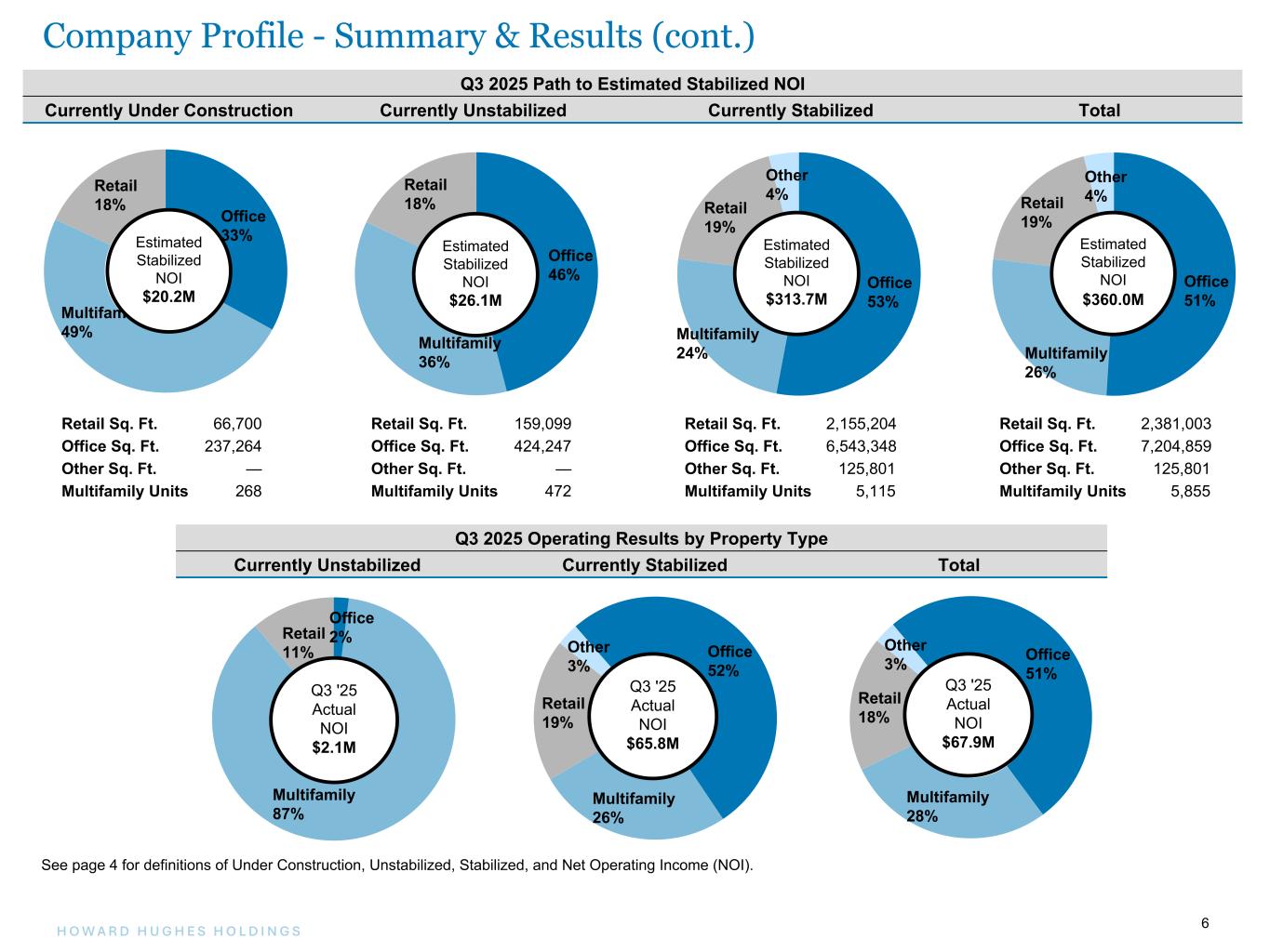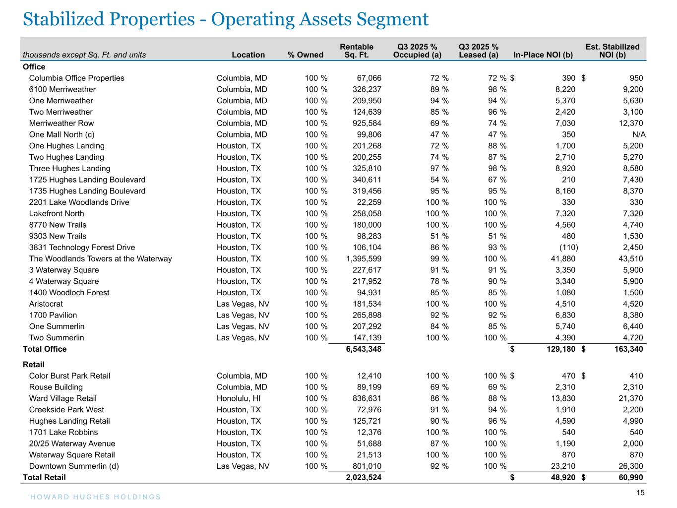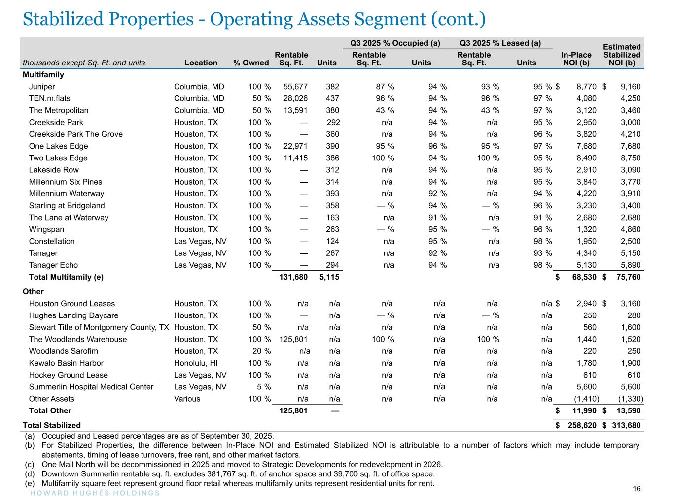 15H O W A R D H U G H E S H O L D I N G S 15 thousands except Sq. Ft. and units Location % Owned Rentable Sq. Ft. Q3 2025 % Occupied (a) Q3 2025 % Leased (a) In-Place NOI (b) Est. Stabilized NOI (b) Office Columbia Office Properties Columbia, MD 100 % 67,066 72 % 72 % $ 390 $ 950 6100 Merriweather Columbia, MD 100 % 326,237 89 % 98 % 8,220 9,200 One Merriweather Columbia, MD 100 % 209,950 94 % 94 % 5,370 5,630 Two Merriweather Columbia, MD 100 % 124,639 85 % 96 % 2,420 3,100 Merriweather Row Columbia, MD 100 % 925,584 69 % 74 % 7,030 12,370 One Mall North (c) Columbia, MD 100 % 99,806 47 % 47 % 350 N/A One Hughes Landing Houston, TX 100 % 201,268 72 % 88 % 1,700 5,200 Two Hughes Landing Houston, TX 100 % 200,255 74 % 87 % 2,710 5,270 Three Hughes Landing Houston, TX 100 % 325,810 97 % 98 % 8,920 8,580 1725 Hughes Landing Boulevard Houston, TX 100 % 340,611 54 % 67 % 210 7,430 1735 Hughes Landing Boulevard Houston, TX 100 % 319,456 95 % 95 % 8,160 8,370 2201 Lake Woodlands Drive Houston, TX 100 % 22,259 100 % 100 % 330 330 Lakefront North Houston, TX 100 % 258,058 100 % 100 % 7,320 7,320 8770 New Trails Houston, TX 100 % 180,000 100 % 100 % 4,560 4,740 9303 New Trails Houston, TX 100 % 98,283 51 % 51 % 480 1,530 3831 Technology Forest Drive Houston, TX 100 % 106,104 86 % 93 % (110) 2,450 The Woodlands Towers at the Waterway Houston, TX 100 % 1,395,599 99 % 100 % 41,880 43,510 3 Waterway Square Houston, TX 100 % 227,617 91 % 91 % 3,350 5,900 4 Waterway Square Houston, TX 100 % 217,952 78 % 90 % 3,340 5,900 1400 Woodloch Forest Houston, TX 100 % 94,931 85 % 85 % 1,080 1,500 Aristocrat Las Vegas, NV 100 % 181,534 100 % 100 % 4,510 4,520 1700 Pavilion Las Vegas, NV 100 % 265,898 92 % 92 % 6,830 8,380 One Summerlin Las Vegas, NV 100 % 207,292 84 % 85 % 5,740 6,440 Two Summerlin Las Vegas, NV 100 % 147,139 100 % 100 % 4,390 4,720 Total Office 6,543,348 $ 129,180 $ 163,340 Retail Color Burst Park Retail Columbia, MD 100 % 12,410 100 % 100 % $ 470 $ 410 Rouse Building Columbia, MD 100 % 89,199 69 % 69 % 2,310 2,310 Ward Village Retail Honolulu, HI 100 % 836,631 86 % 88 % 13,830 21,370 Creekside Park West Houston, TX 100 % 72,976 91 % 94 % 1,910 2,200 Hughes Landing Retail Houston, TX 100 % 125,721 90 % 96 % 4,590 4,990 1701 Lake Robbins Houston, TX 100 % 12,376 100 % 100 % 540 540 20/25 Waterway Avenue Houston, TX 100 % 51,688 87 % 100 % 1,190 2,000 Waterway Square Retail Houston, TX 100 % 21,513 100 % 100 % 870 870 Downtown Summerlin (d) Las Vegas, NV 100 % 801,010 92 % 100 % 23,210 26,300 Total Retail 2,023,524 $ 48,920 $ 60,990 Stabilized Properties - Operating Assets Segment