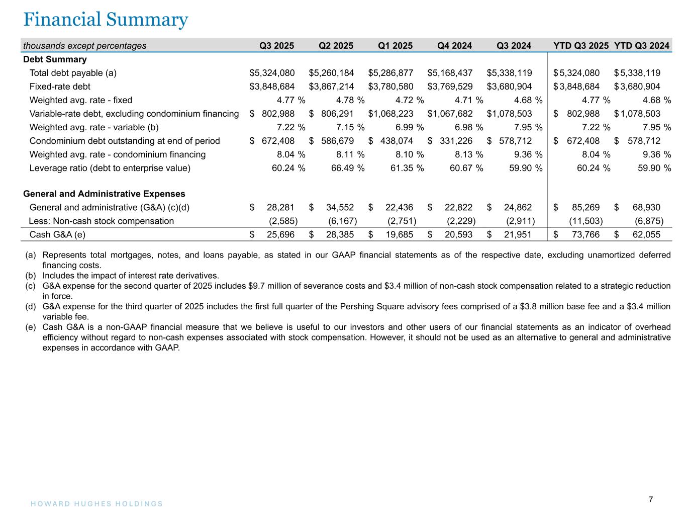 7H O W A R D H U G H E S H O L D I N G S 7 thousands except percentages Q3 2025 Q2 2025 Q1 2025 Q4 2024 Q3 2024 YTD Q3 2025 YTD Q3 2024 Debt Summary Total debt payable (a) $ 5,324,080 $ 5,260,184 $ 5,286,877 $ 5,168,437 $ 5,338,119 $ 5,324,080 $ 5,338,119 Fixed-rate debt $ 3,848,684 $ 3,867,214 $ 3,780,580 $ 3,769,529 $ 3,680,904 $ 3,848,684 $ 3,680,904 Weighted avg. rate - fixed 4.77 % 4.78 % 4.72 % 4.71 % 4.68 % 4.77 % 4.68 % Variable-rate debt, excluding condominium financing $ 802,988 $ 806,291 $ 1,068,223 $ 1,067,682 $ 1,078,503 $ 802,988 $ 1,078,503 Weighted avg. rate - variable (b) 7.22 % 7.15 % 6.99 % 6.98 % 7.95 % 7.22 % 7.95 % Condominium debt outstanding at end of period $ 672,408 $ 586,679 $ 438,074 $ 331,226 $ 578,712 $ 672,408 $ 578,712 Weighted avg. rate - condominium financing 8.04 % 8.11 % 8.10 % 8.13 % 9.36 % 8.04 % 9.36 % Leverage ratio (debt to enterprise value) 60.24 % 66.49 % 61.35 % 60.67 % 59.90 % 60.24 % 59.90 % General and Administrative Expenses General and administrative (G&A) (c)(d) $ 28,281 $ 34,552 $ 22,436 $ 22,822 $ 24,862 $ 85,269 $ 68,930 Less: Non-cash stock compensation (2,585) (6,167) (2,751) (2,229) (2,911) (11,503) (6,875) Cash G&A (e) $ 25,696 $ 28,385 $ 19,685 $ 20,593 $ 21,951 $ 73,766 $ 62,055 (a) Represents total mortgages, notes, and loans payable, as stated in our GAAP financial statements as of the respective date, excluding unamortized deferred financing costs. (b) Includes the impact of interest rate derivatives. (c) G&A expense for the second quarter of 2025 includes $9.7 million of severance costs and $3.4 million of non-cash stock compensation related to a strategic reduction in force. (d) G&A expense for the third quarter of 2025 includes the first full quarter of the Pershing Square advisory fees comprised of a $3.8 million base fee and a $3.4 million variable fee. (e) Cash G&A is a non-GAAP financial measure that we believe is useful to our investors and other users of our financial statements as an indicator of overhead efficiency without regard to non-cash expenses associated with stock compensation. However, it should not be used as an alternative to general and administrative expenses in accordance with GAAP. Financial Summary