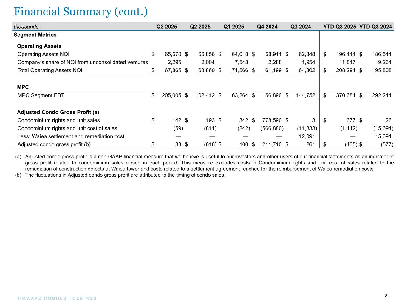8H O W A R D H U G H E S H O L D I N G S 8 (a) Adjusted condo gross profit is a non-GAAP financial measure that we believe is useful to our investors and other users of our financial statements as an indicator of gross profit related to condominium sales closed in each period. This measure excludes costs in Condominium rights and unit cost of sales related to the remediation of construction defects at Waiea tower and costs related to a settlement agreement reached for the reimbursement of Waiea remediation costs. (b) The fluctuations in Adjusted condo gross profit are attributed to the timing of condo sales. thousands Q3 2025 Q2 2025 Q1 2025 Q4 2024 Q3 2024 YTD Q3 2025 YTD Q3 2024 Segment Metrics Operating Assets Operating Assets NOI $ 65,570 $ 66,856 $ 64,018 $ 58,911 $ 62,848 $ 196,444 $ 186,544 Company's share of NOI from unconsolidated ventures 2,295 2,004 7,548 2,288 1,954 11,847 9,264 Total Operating Assets NOI $ 67,865 $ 68,860 $ 71,566 $ 61,199 $ 64,802 $ 208,291 $ 195,808 MPC MPC Segment EBT $ 205,005 $ 102,412 $ 63,264 $ 56,890 $ 144,752 $ 370,681 $ 292,244 Adjusted Condo Gross Profit (a) Condominium rights and unit sales $ 142 $ 193 $ 342 $ 778,590 $ 3 $ 677 $ 26 Condominium rights and unit cost of sales (59) (811) (242) (566,880) (11,833) (1,112) (15,694) Less: Waiea settlement and remediation cost — — — — 12,091 — 15,091 Adjusted condo gross profit (b) $ 83 $ (618) $ 100 $ 211,710 $ 261 $ (435) $ (577) Financial Summary (cont.)