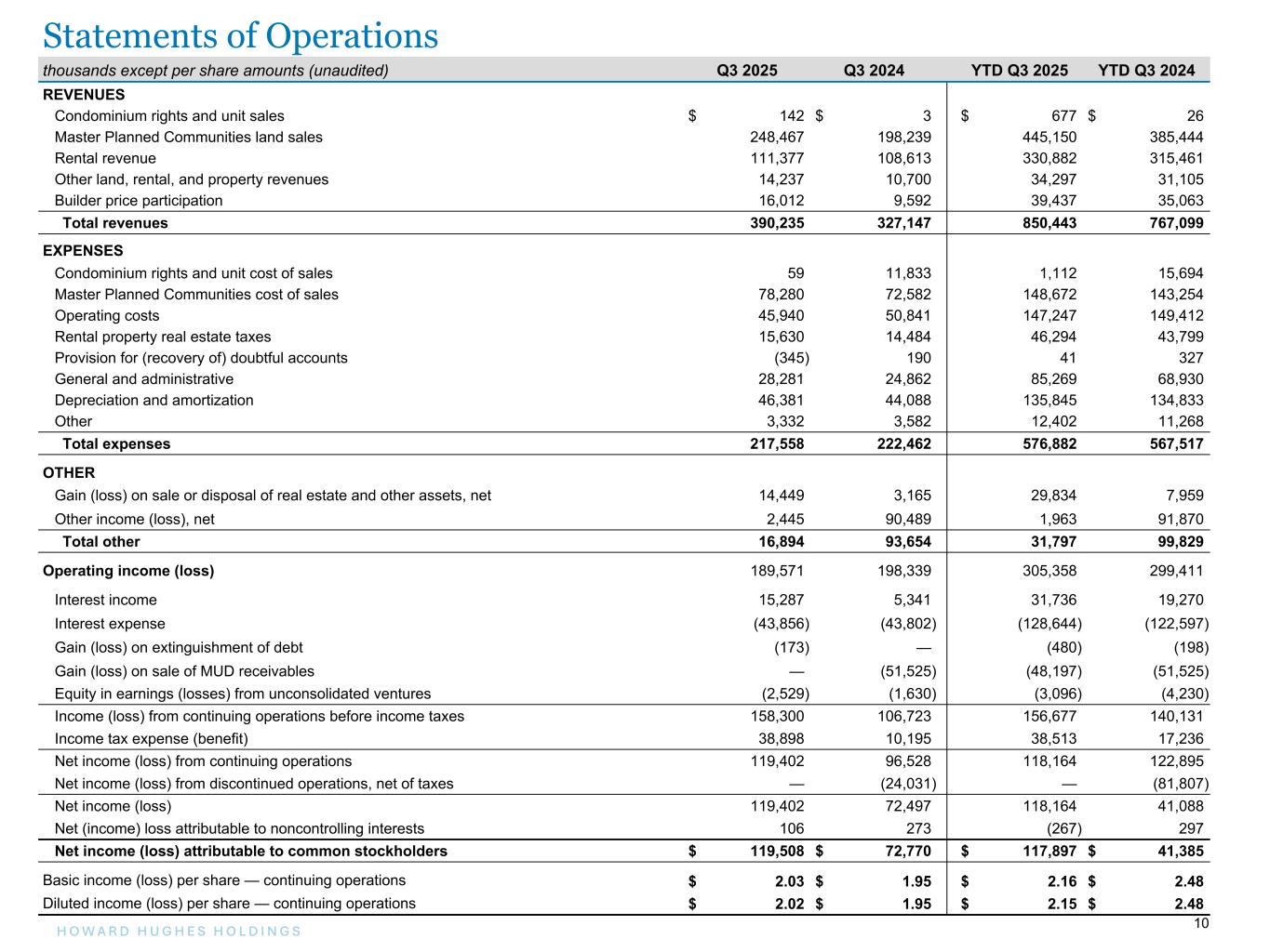 10H O W A R D H U G H E S H O L D I N G S 10 thousands except per share amounts (unaudited) Q3 2025 Q3 2024 YTD Q3 2025 YTD Q3 2024 REVENUES Condominium rights and unit sales $ 142 $ 3 $ 677 $ 26 Master Planned Communities land sales 248,467 198,239 445,150 385,444 Rental revenue 111,377 108,613 330,882 315,461 Other land, rental, and property revenues 14,237 10,700 34,297 31,105 Builder price participation 16,012 9,592 39,437 35,063 Total revenues 390,235 327,147 850,443 767,099 EXPENSES Condominium rights and unit cost of sales 59 11,833 1,112 15,694 Master Planned Communities cost of sales 78,280 72,582 148,672 143,254 Operating costs 45,940 50,841 147,247 149,412 Rental property real estate taxes 15,630 14,484 46,294 43,799 Provision for (recovery of) doubtful accounts (345) 190 41 327 General and administrative 28,281 24,862 85,269 68,930 Depreciation and amortization 46,381 44,088 135,845 134,833 Other 3,332 3,582 12,402 11,268 Total expenses 217,558 222,462 576,882 567,517 OTHER Gain (loss) on sale or disposal of real estate and other assets, net 14,449 3,165 29,834 7,959 Other income (loss), net 2,445 90,489 1,963 91,870 Total other 16,894 93,654 31,797 99,829 Operating income (loss) 189,571 198,339 305,358 299,411 Interest income 15,287 5,341 31,736 19,270 Interest expense (43,856) (43,802) (128,644) (122,597) Gain (loss) on extinguishment of debt (173) — (480) (198) Gain (loss) on sale of MUD receivables — (51,525) (48,197) (51,525) Equity in earnings (losses) from unconsolidated ventures (2,529) (1,630) (3,096) (4,230) Income (loss) from continuing operations before income taxes 158,300 106,723 156,677 140,131 Income tax expense (benefit) 38,898 10,195 38,513 17,236 Net income (loss) from continuing operations 119,402 96,528 118,164 122,895 Net income (loss) from discontinued operations, net of taxes — (24,031) — (81,807) Net income (loss) 119,402 72,497 118,164 41,088 Net (income) loss attributable to noncontrolling interests 106 273 (267) 297 Net income (loss) attributable to common stockholders $ 119,508 $ 72,770 $ 117,897 $ 41,385 Basic income (loss) per share — continuing operations $ 2.03 $ 1.95 $ 2.16 $ 2.48 Diluted income (loss) per share — continuing operations $ 2.02 $ 1.95 $ 2.15 $ 2.48 Statements of Operations