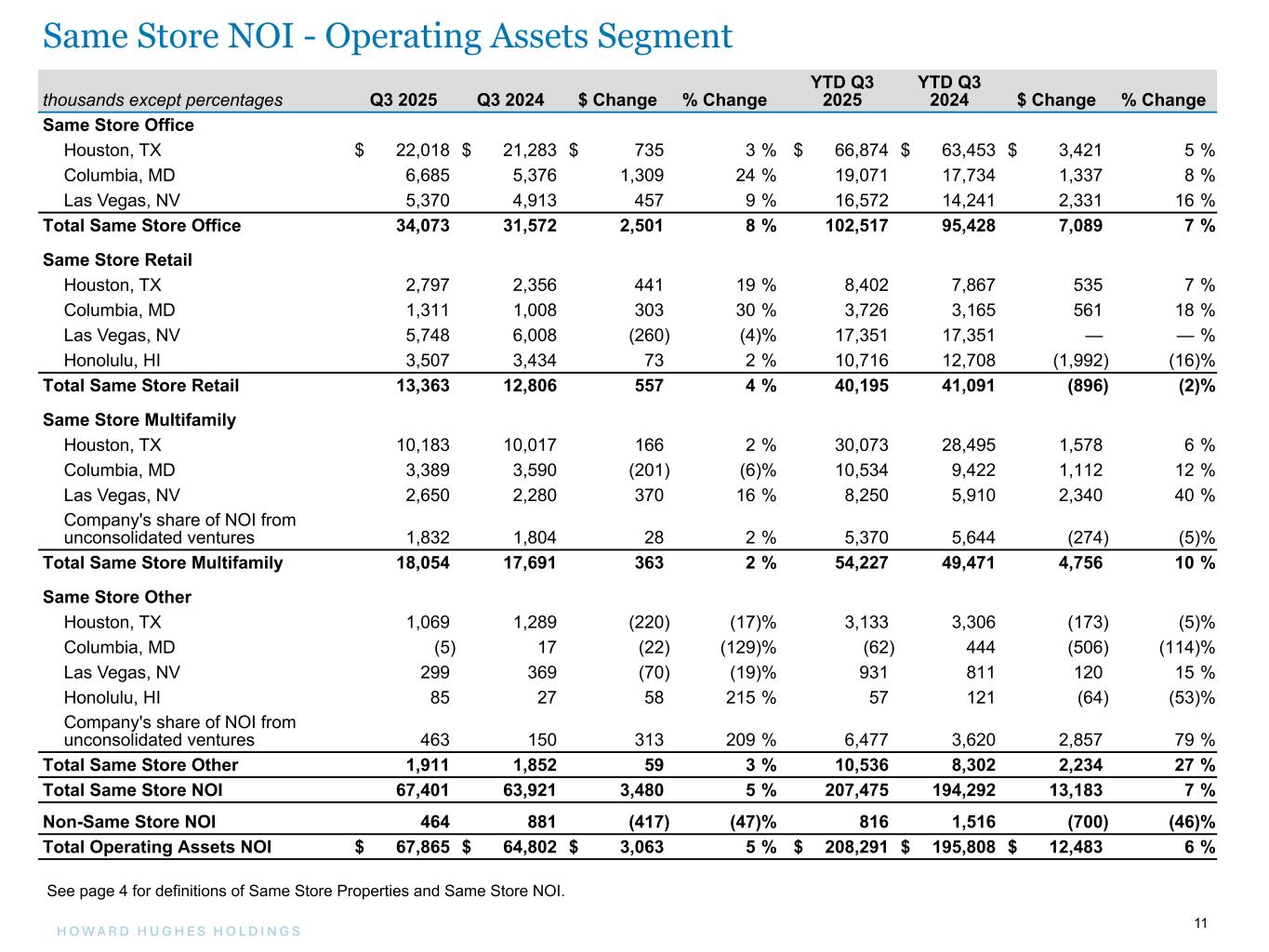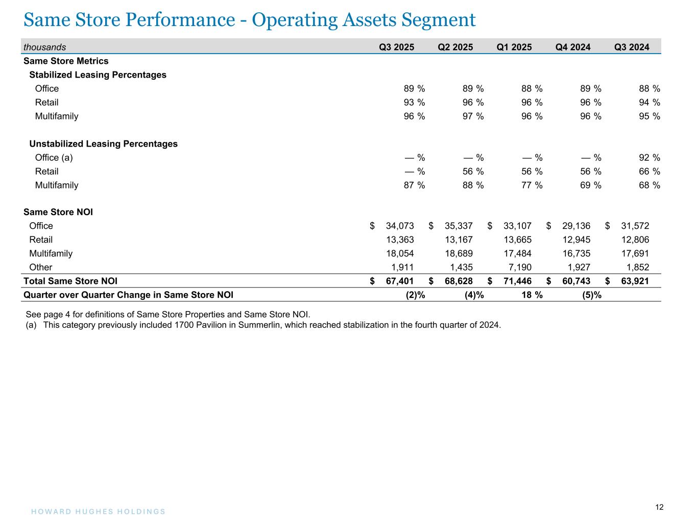 11H O W A R D H U G H E S H O L D I N G S 11 thousands except percentages Q3 2025 Q3 2024 $ Change % Change YTD Q3 2025 YTD Q3 2024 $ Change % Change Same Store Office Houston, TX $ 22,018 $ 21,283 $ 735 3 % $ 66,874 $ 63,453 $ 3,421 5 % Columbia, MD 6,685 5,376 1,309 24 % 19,071 17,734 1,337 8 % Las Vegas, NV 5,370 4,913 457 9 % 16,572 14,241 2,331 16 % Total Same Store Office 34,073 31,572 2,501 8 % 102,517 95,428 7,089 7 % Same Store Retail Houston, TX 2,797 2,356 441 19 % 8,402 7,867 535 7 % Columbia, MD 1,311 1,008 303 30 % 3,726 3,165 561 18 % Las Vegas, NV 5,748 6,008 (260) (4) % 17,351 17,351 — — % Honolulu, HI 3,507 3,434 73 2 % 10,716 12,708 (1,992) (16) % Total Same Store Retail 13,363 12,806 557 4 % 40,195 41,091 (896) (2) % Same Store Multifamily Houston, TX 10,183 10,017 166 2 % 30,073 28,495 1,578 6 % Columbia, MD 3,389 3,590 (201) (6) % 10,534 9,422 1,112 12 % Las Vegas, NV 2,650 2,280 370 16 % 8,250 5,910 2,340 40 % Company's share of NOI from unconsolidated ventures 1,832 1,804 28 2 % 5,370 5,644 (274) (5) % Total Same Store Multifamily 18,054 17,691 363 2 % 54,227 49,471 4,756 10 % Same Store Other Houston, TX 1,069 1,289 (220) (17) % 3,133 3,306 (173) (5) % Columbia, MD (5) 17 (22) (129) % (62) 444 (506) (114) % Las Vegas, NV 299 369 (70) (19) % 931 811 120 15 % Honolulu, HI 85 27 58 215 % 57 121 (64) (53) % Company's share of NOI from unconsolidated ventures 463 150 313 209 % 6,477 3,620 2,857 79 % Total Same Store Other 1,911 1,852 59 3 % 10,536 8,302 2,234 27 % Total Same Store NOI 67,401 63,921 3,480 5 % 207,475 194,292 13,183 7 % Non-Same Store NOI 464 881 (417) (47) % 816 1,516 (700) (46) % Total Operating Assets NOI $ 67,865 $ 64,802 $ 3,063 5 % $ 208,291 $ 195,808 $ 12,483 6 % See page 4 for definitions of Same Store Properties and Same Store NOI. Same Store NOI - Operating Assets Segment