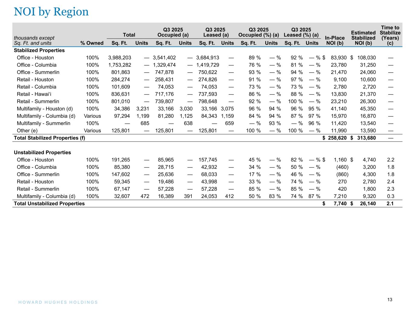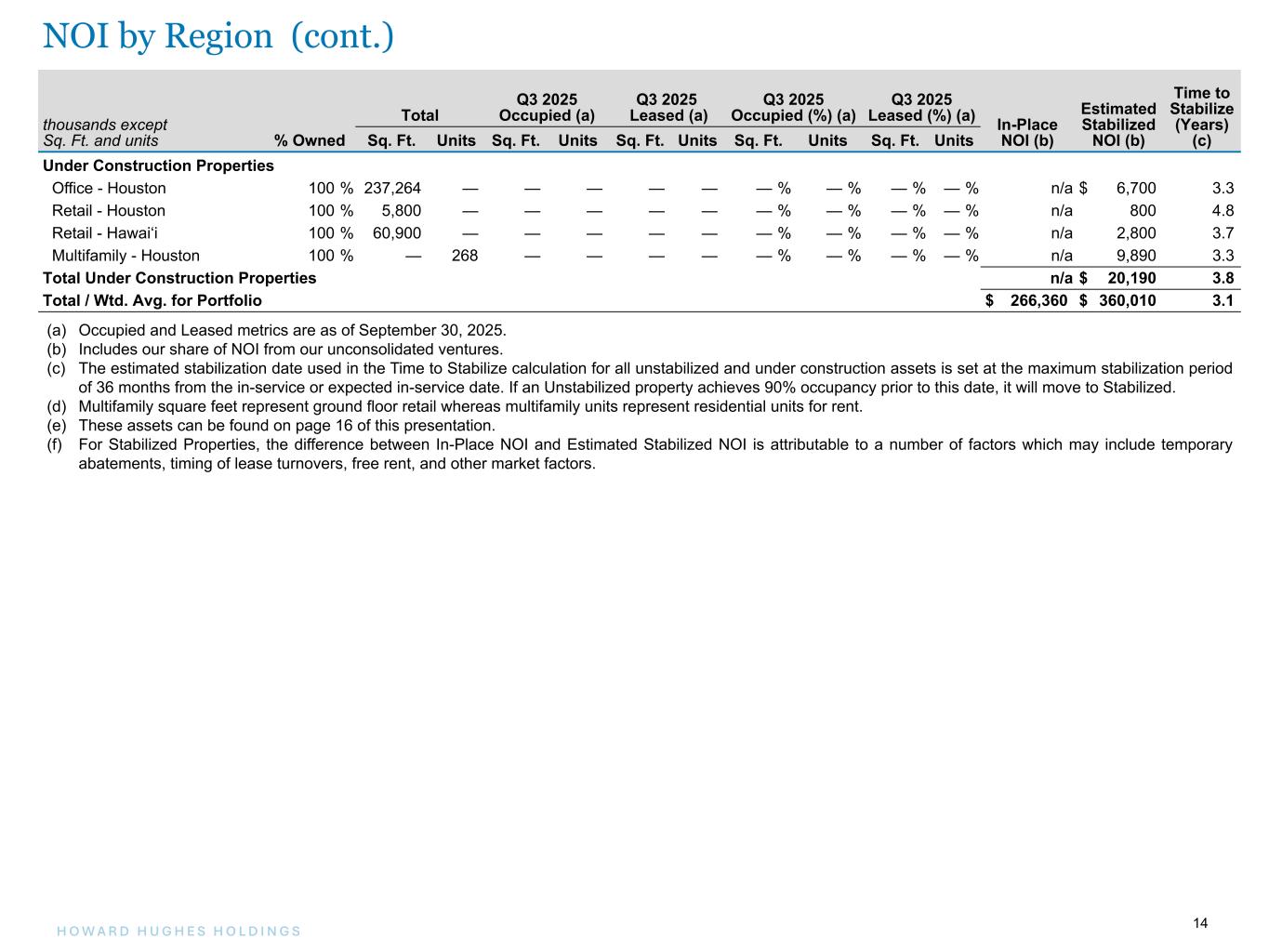 13H O W A R D H U G H E S H O L D I N G S 13 thousands except Sq. Ft. and units % Owned Total Q3 2025 Occupied (a) Q3 2025 Leased (a) Q3 2025 Occupied (%) (a) Q3 2025 Leased (%) (a) In-Place NOI (b) Estimated Stabilized NOI (b) Time to Stabilize (Years) (c)Sq. Ft. Units Sq. Ft. Units Sq. Ft. Units Sq. Ft. Units Sq. Ft. Units Stabilized Properties Office - Houston 100% 3,988,203 — 3,541,402 — 3,684,913 — 89 % — % 92 % — % $ 83,930 $ 108,030 — Office - Columbia 100% 1,753,282 — 1,329,474 — 1,419,729 — 76 % — % 81 % — % 23,780 31,250 — Office - Summerlin 100% 801,863 — 747,878 — 750,622 — 93 % — % 94 % — % 21,470 24,060 — Retail - Houston 100% 284,274 — 258,431 — 274,826 — 91 % — % 97 % — % 9,100 10,600 — Retail - Columbia 100% 101,609 — 74,053 — 74,053 — 73 % — % 73 % — % 2,780 2,720 — Retail - Hawai‘i 100% 836,631 — 717,176 — 737,593 — 86 % — % 88 % — % 13,830 21,370 — Retail - Summerlin 100% 801,010 — 739,807 — 798,648 — 92 % — % 100 % — % 23,210 26,300 — Multifamily - Houston (d) 100% 34,386 3,231 33,166 3,030 33,166 3,075 96 % 94 % 96 % 95 % 41,140 45,350 — Multifamily - Columbia (d) Various 97,294 1,199 81,280 1,125 84,343 1,159 84 % 94 % 87 % 97 % 15,970 16,870 — Multifamily - Summerlin 100% — 685 — 638 — 659 — % 93 % — % 96 % 11,420 13,540 — Other (e) Various 125,801 — 125,801 — 125,801 — 100 % — % 100 % — % 11,990 13,590 — Total Stabilized Properties (f) $ 258,620 $ 313,680 — Unstabilized Properties Office - Houston 100% 191,265 — 85,965 — 157,745 — 45 % — % 82 % — % $ 1,160 $ 4,740 2.2 Office - Columbia 100% 85,380 — 28,715 — 42,932 — 34 % — % 50 % — % (460) 3,200 1.8 Office - Summerlin 100% 147,602 — 25,636 — 68,033 — 17 % — % 46 % — % (860) 4,300 1.8 Retail - Houston 100% 59,345 — 19,486 — 43,998 — 33 % — % 74 % — % 270 2,780 2.4 Retail - Summerlin 100% 67,147 — 57,228 — 57,228 — 85 % — % 85 % — % 420 1,800 2.3 Multifamily - Columbia (d) 100% 32,607 472 16,389 391 24,053 412 50 % 83 % 74 % 87 % 7,210 9,320 0.3 Total Unstabilized Properties $ 7,740 $ 26,140 2.1 NOI by Region