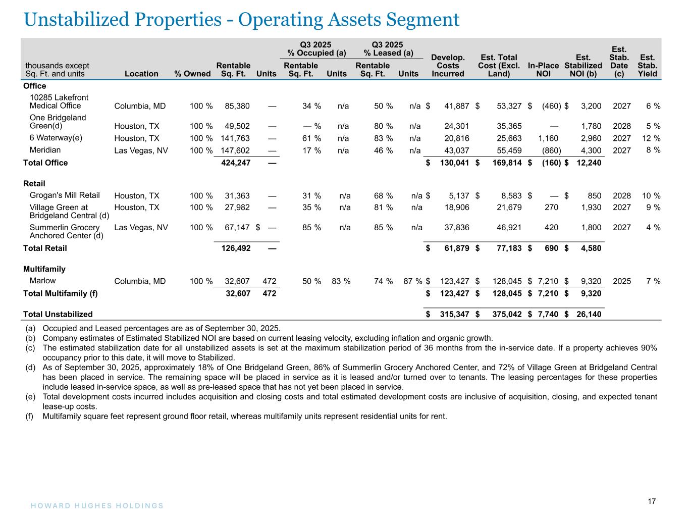 16H O W A R D H U G H E S H O L D I N G S 16 Q3 2025 % Occupied (a) Q3 2025 % Leased (a) Estimated Stabilized NOI (b)thousands except Sq. Ft. and units Location % Owned Rentable Sq. Ft. Units Rentable Sq. Ft. Units Rentable Sq. Ft. Units In-Place NOI (b) Multifamily Juniper Columbia, MD 100 % 55,677 382 87 % 94 % 93 % 95 % $ 8,770 $ 9,160 TEN.m.flats Columbia, MD 50 % 28,026 437 96 % 94 % 96 % 97 % 4,080 4,250 The Metropolitan Columbia, MD 50 % 13,591 380 43 % 94 % 43 % 97 % 3,120 3,460 Creekside Park Houston, TX 100 % — 292 n/a 94 % n/a 95 % 2,950 3,000 Creekside Park The Grove Houston, TX 100 % — 360 n/a 94 % n/a 96 % 3,820 4,210 One Lakes Edge Houston, TX 100 % 22,971 390 95 % 96 % 95 % 97 % 7,680 7,680 Two Lakes Edge Houston, TX 100 % 11,415 386 100 % 94 % 100 % 95 % 8,490 8,750 Lakeside Row Houston, TX 100 % — 312 n/a 94 % n/a 95 % 2,910 3,090 Millennium Six Pines Houston, TX 100 % — 314 n/a 94 % n/a 95 % 3,840 3,770 Millennium Waterway Houston, TX 100 % — 393 n/a 92 % n/a 94 % 4,220 3,910 Starling at Bridgeland Houston, TX 100 % — 358 — % 94 % — % 96 % 3,230 3,400 The Lane at Waterway Houston, TX 100 % — 163 n/a 91 % n/a 91 % 2,680 2,680 Wingspan Houston, TX 100 % — 263 — % 95 % — % 96 % 1,320 4,860 Constellation Las Vegas, NV 100 % — 124 n/a 95 % n/a 98 % 1,950 2,500 Tanager Las Vegas, NV 100 % — 267 n/a 92 % n/a 93 % 4,340 5,150 Tanager Echo Las Vegas, NV 100 % — 294 n/a 94 % n/a 98 % 5,130 5,890 Total Multifamily (e) 131,680 5,115 $ 68,530 $ 75,760 Other Houston Ground Leases Houston, TX 100 % n/a n/a n/a n/a n/a n/a $ 2,940 $ 3,160 Hughes Landing Daycare Houston, TX 100 % — n/a — % n/a — % n/a 250 280 Stewart Title of Montgomery County, TX Houston, TX 50 % n/a n/a n/a n/a n/a n/a 560 1,600 The Woodlands Warehouse Houston, TX 100 % 125,801 n/a 100 % n/a 100 % n/a 1,440 1,520 Woodlands Sarofim Houston, TX 20 % n/a n/a n/a n/a n/a n/a 220 250 Kewalo Basin Harbor Honolulu, HI 100 % n/a n/a n/a n/a n/a n/a 1,780 1,900 Hockey Ground Lease Las Vegas, NV 100 % n/a n/a n/a n/a n/a n/a 610 610 Summerlin Hospital Medical Center Las Vegas, NV 5 % n/a n/a n/a n/a n/a n/a 5,600 5,600 Other Assets Various 100 % n/a n/a n/a n/a n/a n/a (1,410) (1,330) Total Other 125,801 — $ 11,990 $ 13,590 Total Stabilized $ 258,620 $ 313,680 (a) Occupied and Leased percentages are as of September 30, 2025. (b) For Stabilized Properties, the difference between In-Place NOI and Estimated Stabilized NOI is attributable to a number of factors which may include temporary abatements, timing of lease turnovers, free rent, and other market factors. (c) One Mall North will be decommissioned in 2025 and moved to Strategic Developments for redevelopment in 2026. (d) Downtown Summerlin rentable sq. ft. excludes 381,767 sq. ft. of anchor space and 39,700 sq. ft. of office space. (e) Multifamily square feet represent ground floor retail whereas multifamily units represent residential units for rent. Stabilized Properties - Operating Assets Segment (cont.)