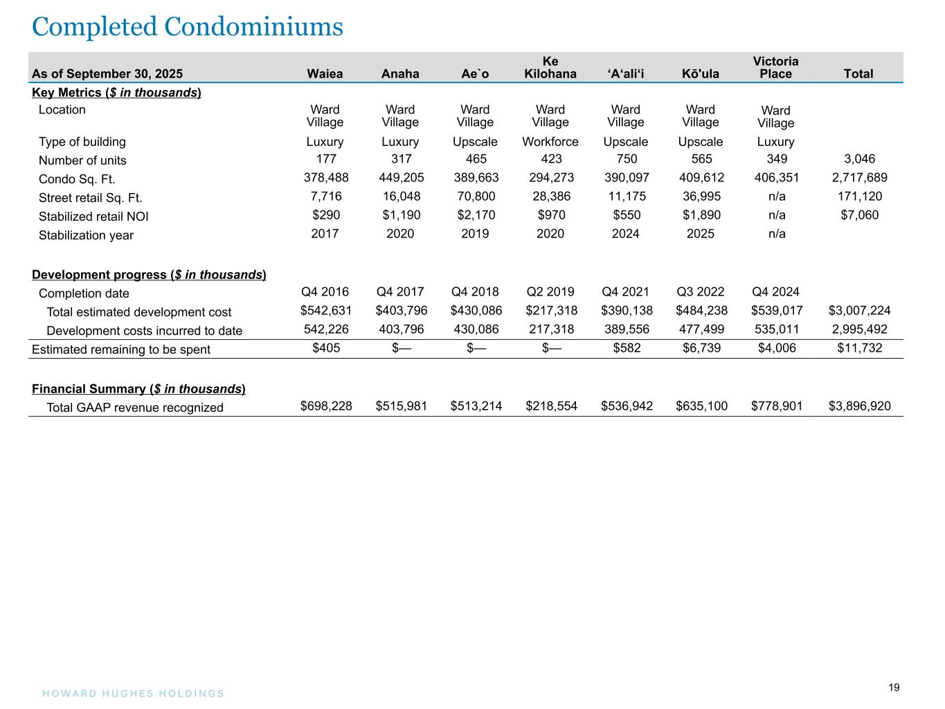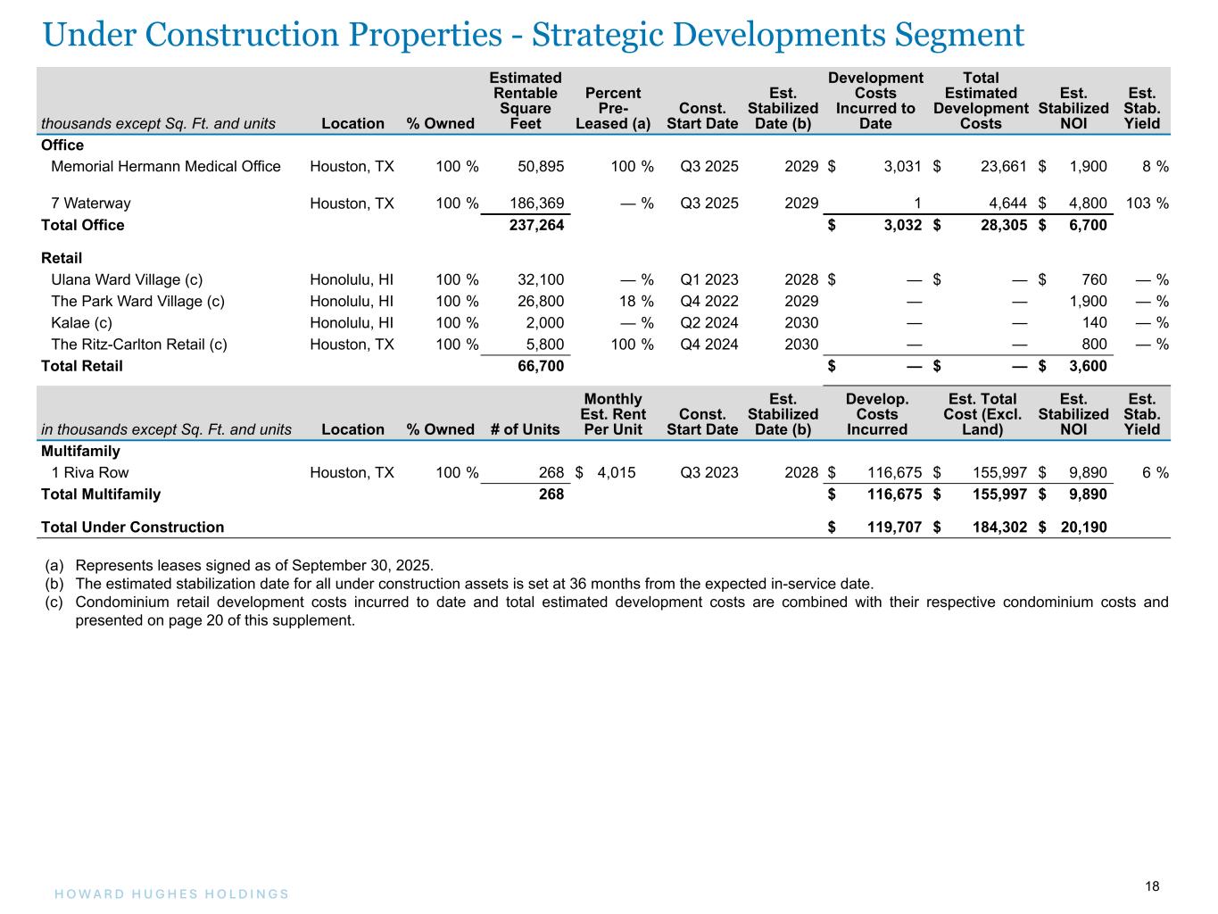 18H O W A R D H U G H E S H O L D I N G S 18 Under Construction Properties thousands except Sq. Ft. and units Location % Owned Estimated Rentable Square Feet Percent Pre- Leased (a) Const. Start Date Est. Stabilized Date (b) Development Costs Incurred to Date Total Estimated Development Costs Est. Stabilized NOI Est. Stab. Yield Office Memorial Hermann Medical Office Houston, TX 100 % 50,895 100 % Q3 2025 2029 $ 3,031 $ 23,661 $ 1,900 8 % 7 Waterway Houston, TX 100 % 186,369 — % Q3 2025 2029 1 4,644 $ 4,800 103 % Total Office 237,264 $ 3,032 $ 28,305 $ 6,700 Retail Ulana Ward Village (c) Honolulu, HI 100 % 32,100 — % Q1 2023 2028 $ — $ — $ 760 — % The Park Ward Village (c) Honolulu, HI 100 % 26,800 18 % Q4 2022 2029 — — 1,900 — % Kalae (c) Honolulu, HI 100 % 2,000 — % Q2 2024 2030 — — 140 — % The Ritz-Carlton Retail (c) Houston, TX 100 % 5,800 100 % Q4 2024 2030 — — 800 — % Total Retail 66,700 $ — $ — $ 3,600 in thousands except Sq. Ft. and units Location % Owned # of Units Monthly Est. Rent Per Unit Const. Start Date Est. Stabilized Date (b) Develop. Costs Incurred Est. Total Cost (Excl. Land) Est. Stabilized NOI Est. Stab. Yield Multifamily 1 Riva Row Houston, TX 100 % 268 $ 4,015 Q3 2023 2028 $ 116,675 $ 155,997 $ 9,890 6 % Total Multifamily 268 $ 116,675 $ 155,997 $ 9,890 Total Under Construction $ 119,707 $ 184,302 $ 20,190 (a) Represents leases signed as of September 30, 2025. (b) The estimated stabilization date for all under construction assets is set at 36 months from the expected in-service date. (c) Condominium retail development costs incurred to date and total estimated development costs are combined with their respective condominium costs and presented on page 20 of this supplement. Under Construction Properties - Strategic Developments Segment
