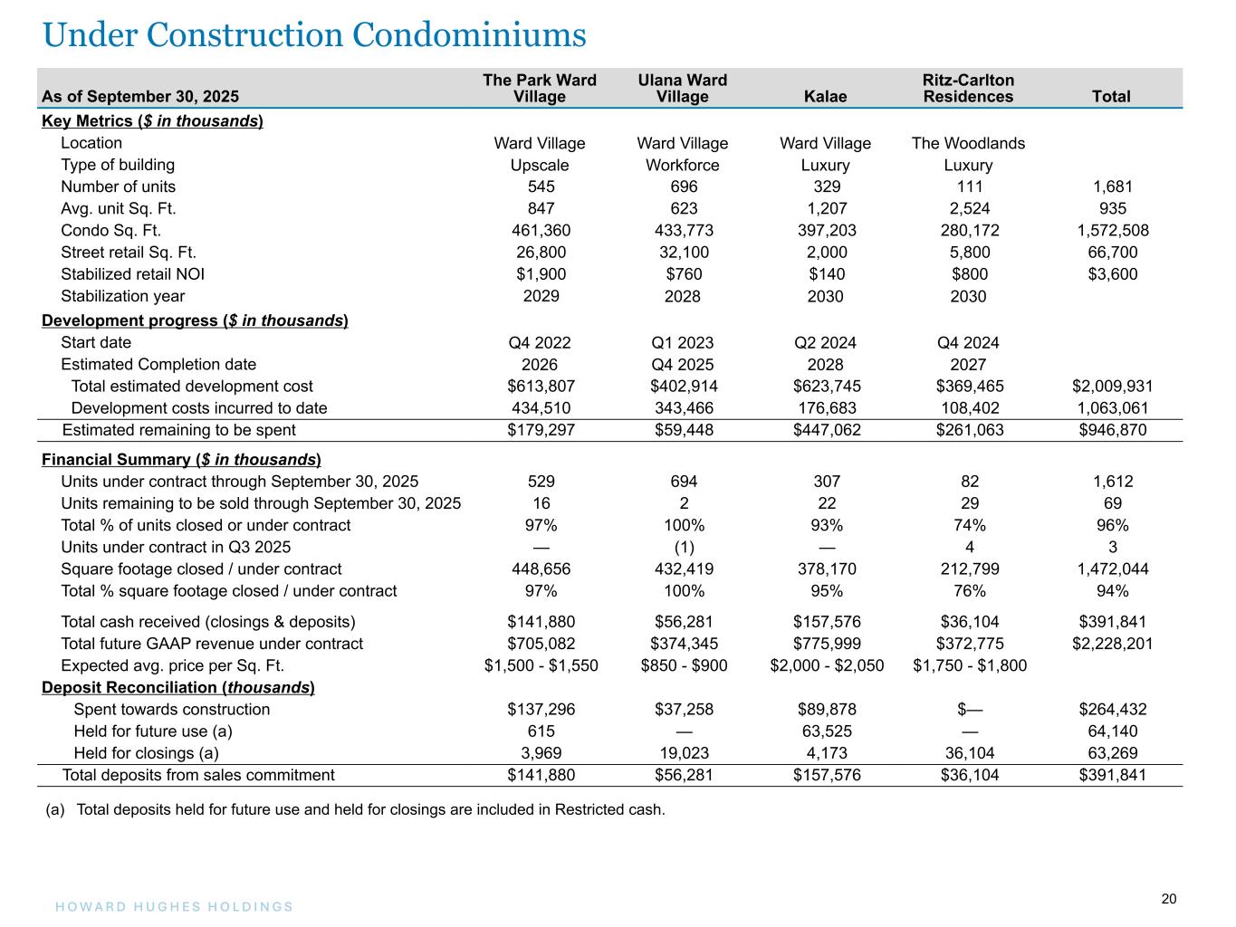 19H O W A R D H U G H E S H O L D I N G S 19 As of September 30, 2025 Waiea Anaha Ae`o Ke Kilohana ‘A‘ali‘i Kō'ula Victoria Place Total Key Metrics ($ in thousands) Location Ward Village Ward Village Ward Village Ward Village Ward Village Ward Village Ward Village Type of building Luxury Luxury Upscale Workforce Upscale Upscale Luxury Number of units 177 317 465 423 750 565 349 3,046 Condo Sq. Ft. 378,488 449,205 389,663 294,273 390,097 409,612 406,351 2,717,689 Street retail Sq. Ft. 7,716 16,048 70,800 28,386 11,175 36,995 n/a 171,120 Stabilized retail NOI $290 $1,190 $2,170 $970 $550 $1,890 n/a $7,060 Stabilization year 2017 2020 2019 2020 2024 2025 n/a Development progress ($ in thousands) Completion date Q4 2016 Q4 2017 Q4 2018 Q2 2019 Q4 2021 Q3 2022 Q4 2024 Total estimated development cost $542,631 $403,796 $430,086 $217,318 $390,138 $484,238 $539,017 $3,007,224 Development costs incurred to date 542,226 403,796 430,086 217,318 389,556 477,499 535,011 2,995,492 Estimated remaining to be spent $405 $— $— $— $582 $6,739 $4,006 $11,732 Financial Summary ($ in thousands) Total GAAP revenue recognized $698,228 $515,981 $513,214 $218,554 $536,942 $635,100 $778,901 $3,896,920 Completed Condominiums